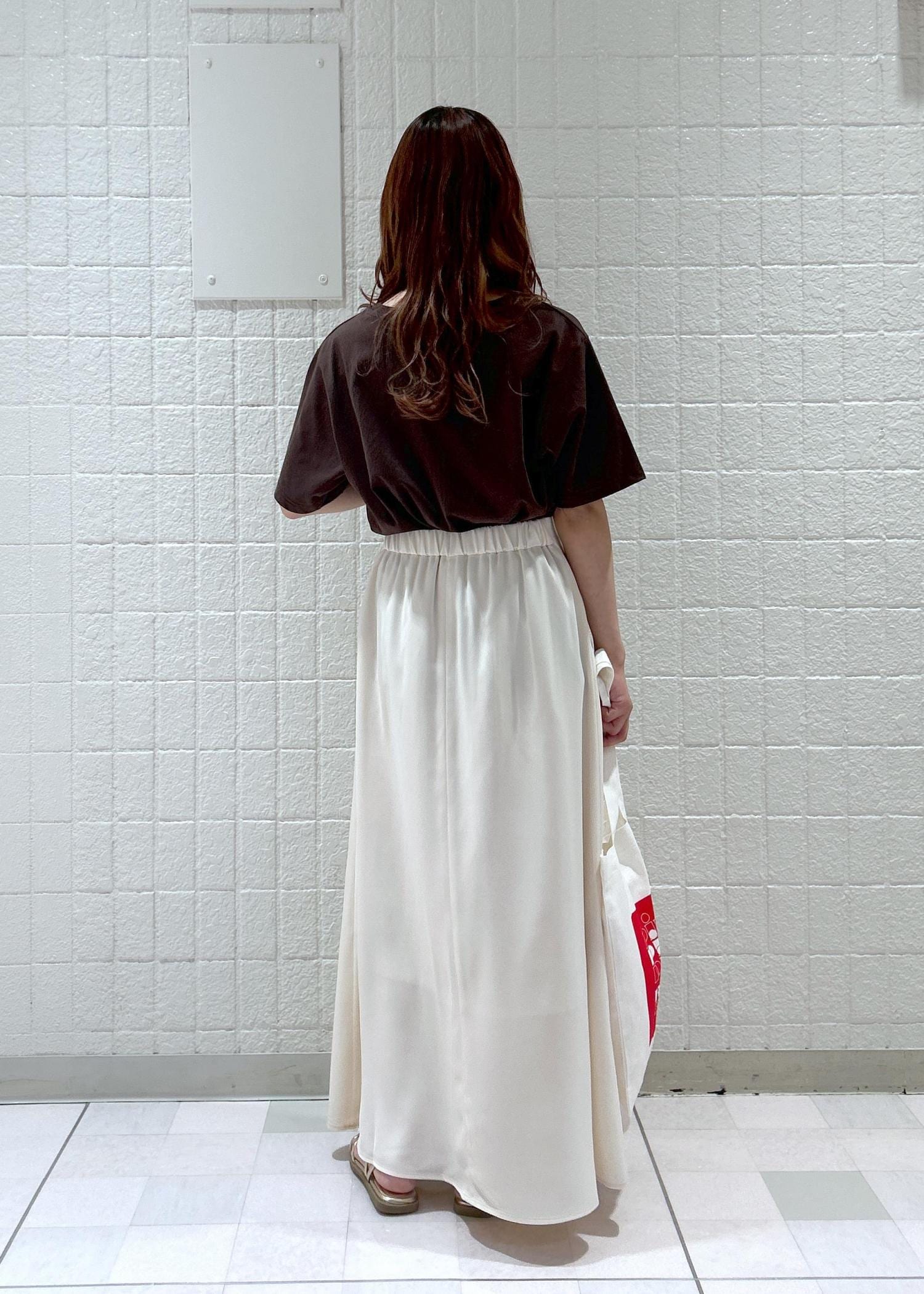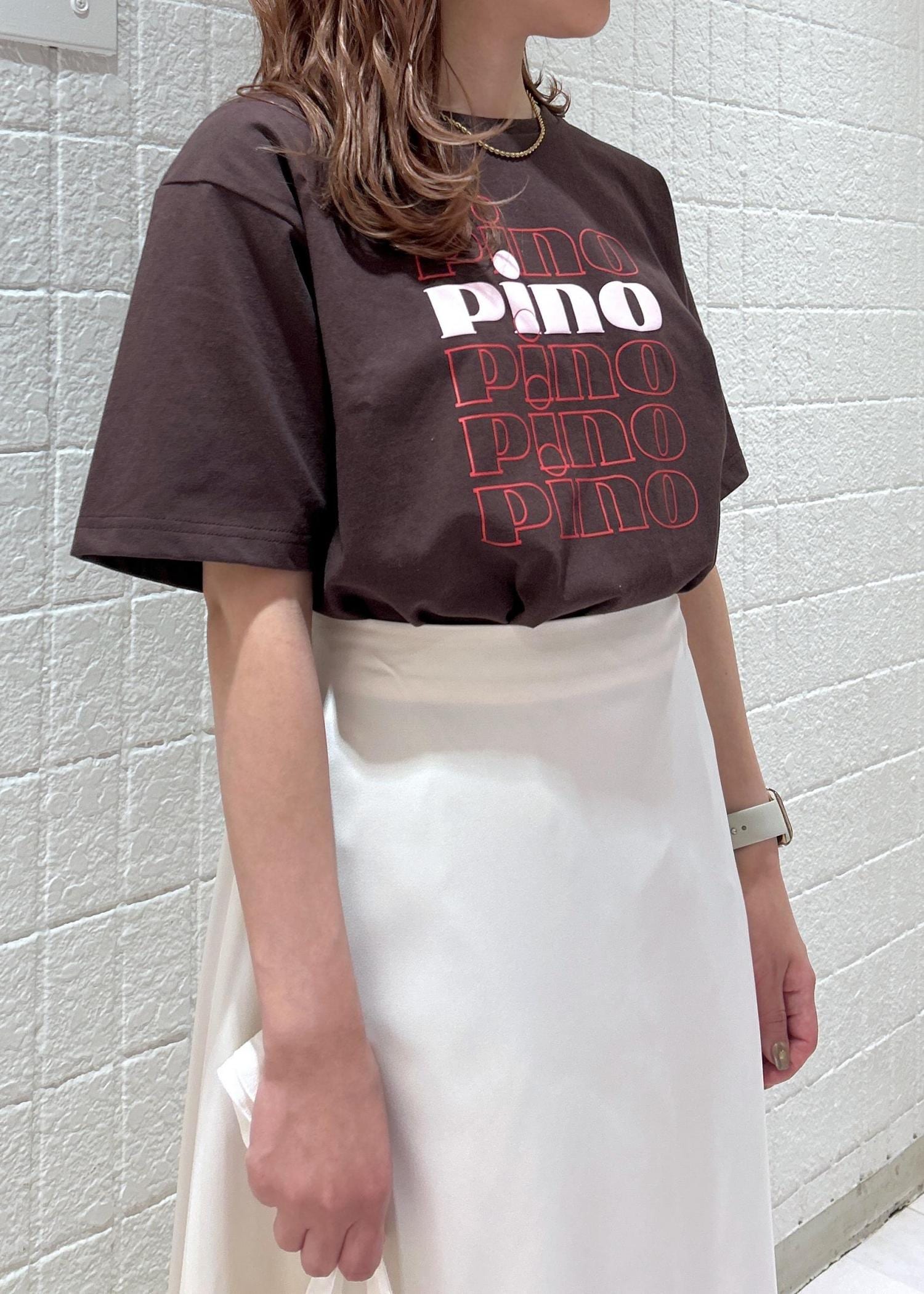 PinoコラボのTシャツにサテンスカートを合わせた大人カジュアルコーデ。