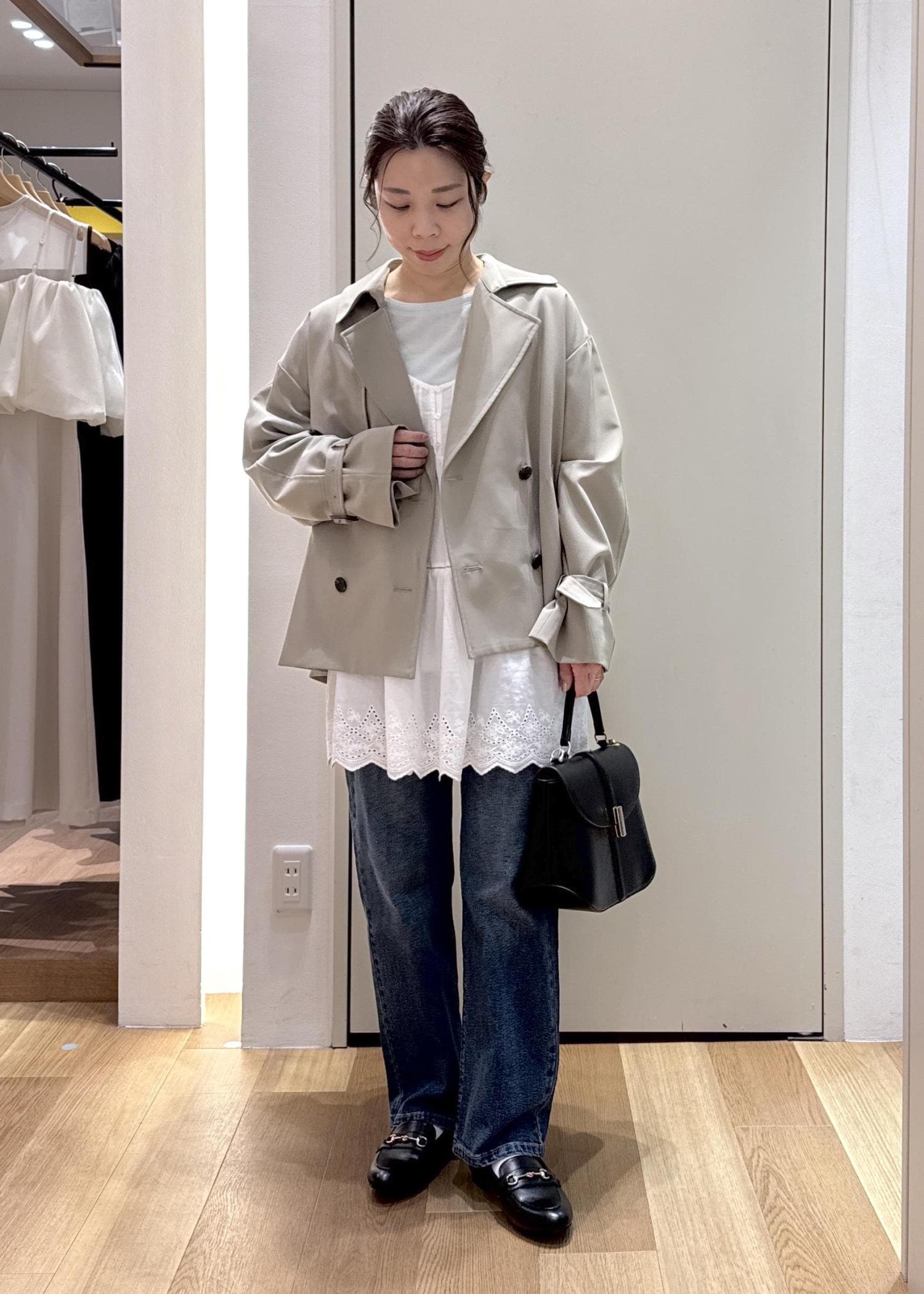 ホワイトのメロウトップスにストレートデニムを合わせカジュアルスタイルにまとめました。