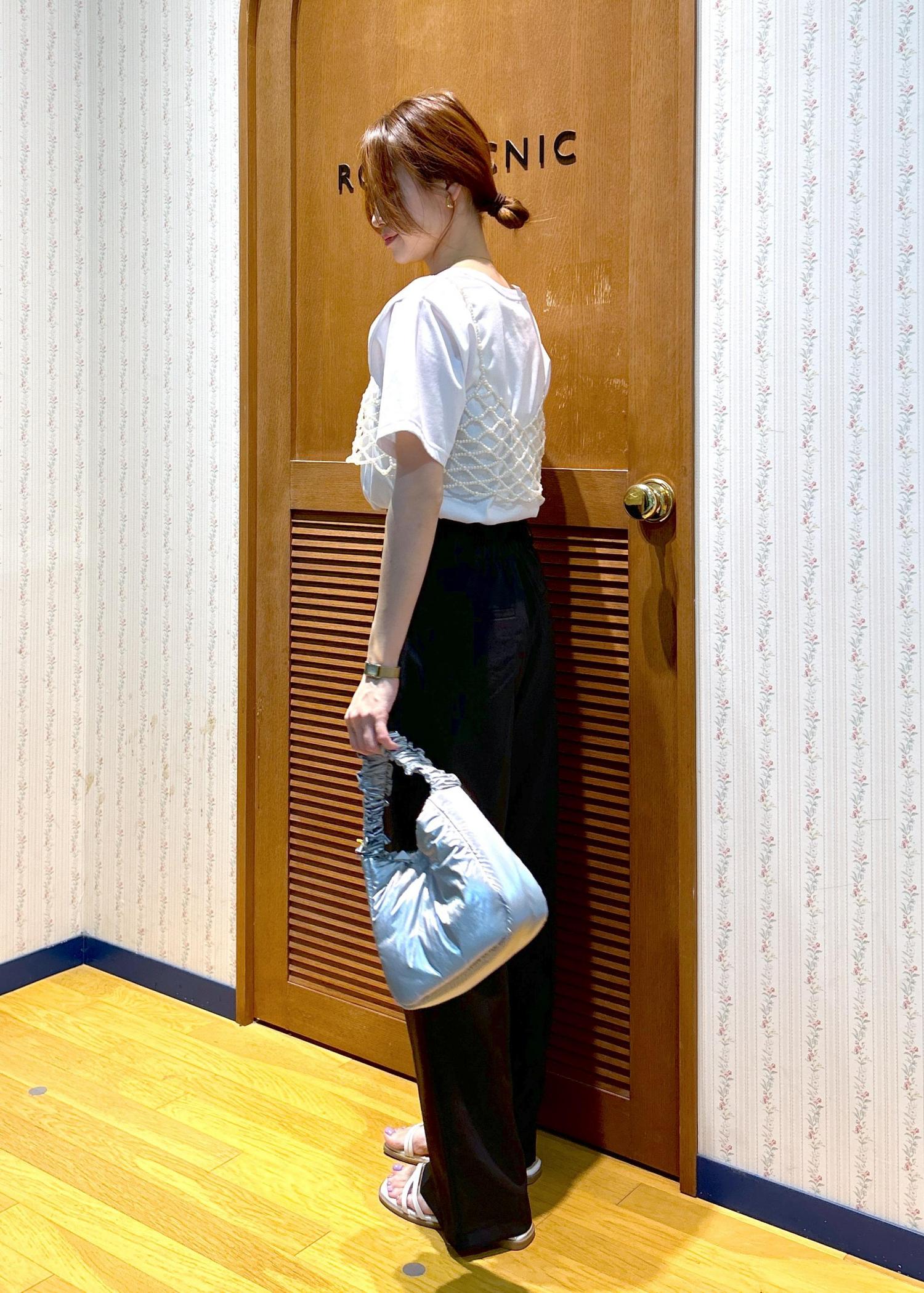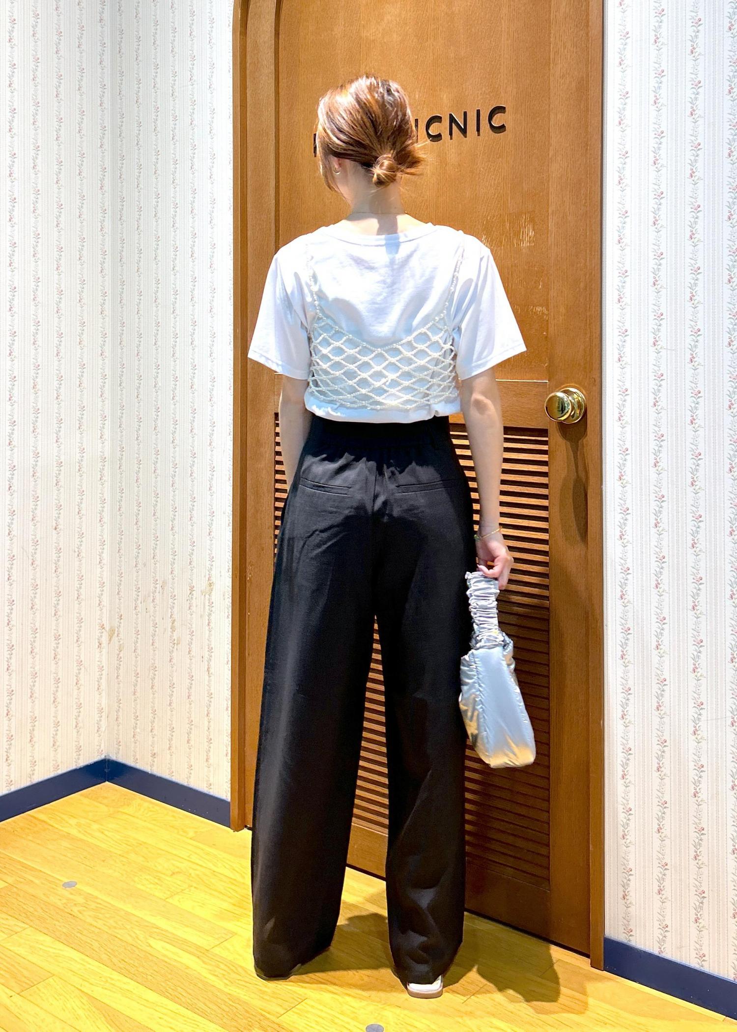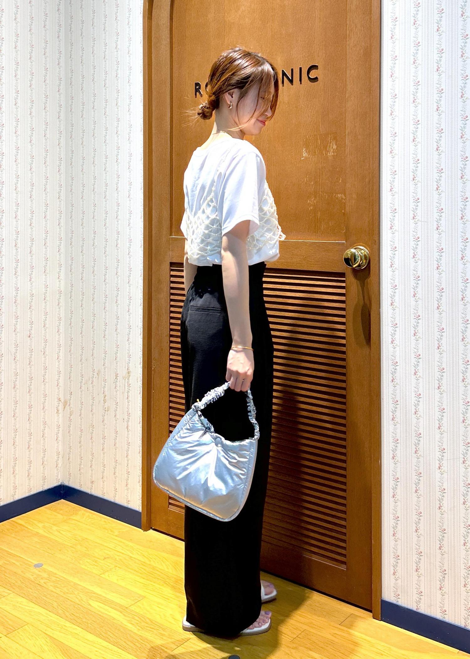 ロゴTシャツに今季トレンドのパールビスチェを合わせて大人カジュアルなスタイリングにしました。