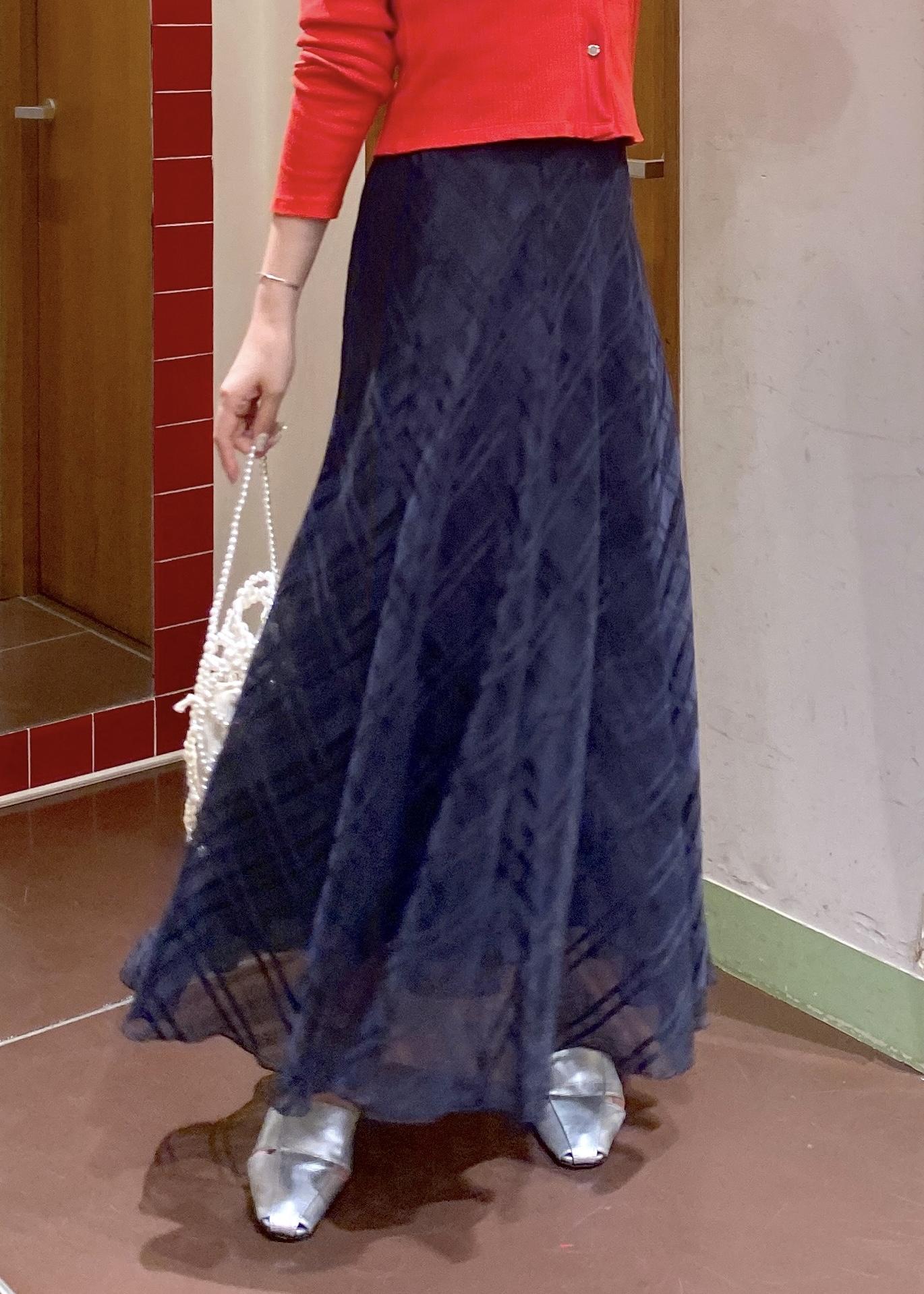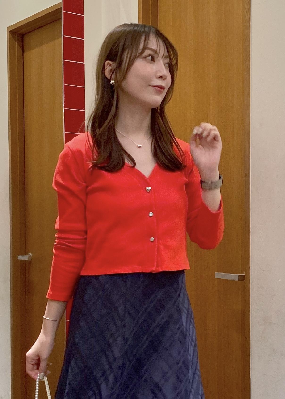 赤×透けネイビーで綺麗目カジュアルコーデ。