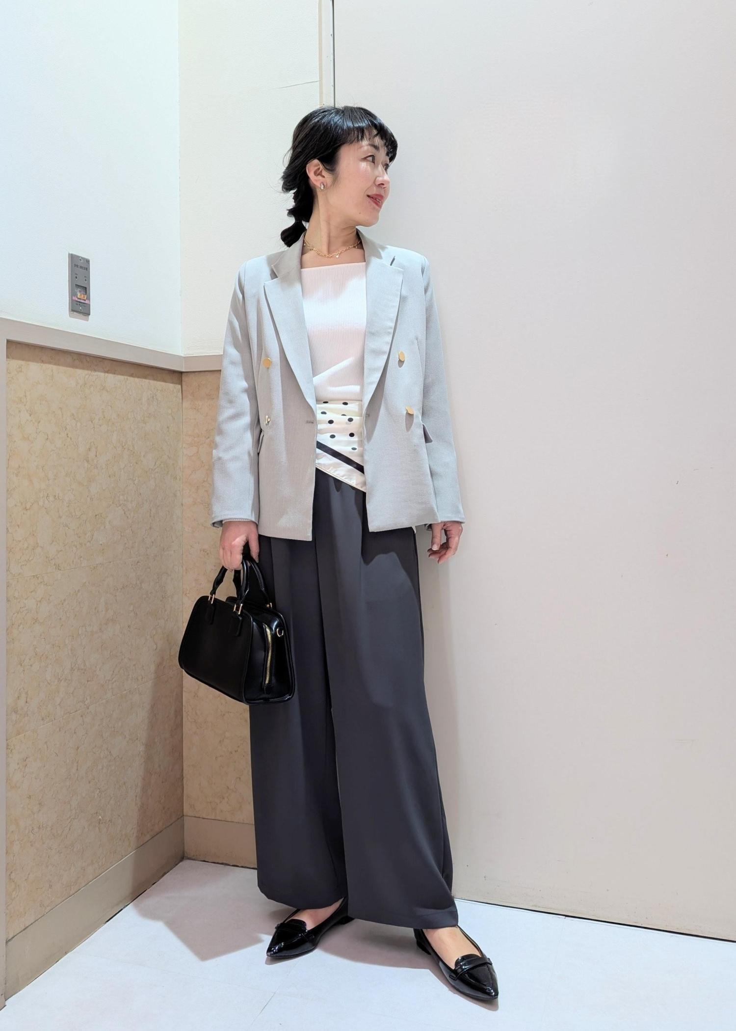 トップスとボトムの色を同系色にし、ビスチェもボタンが縦に並んでいるので縦長効果があり淡色でも膨張しないコーディネートです。