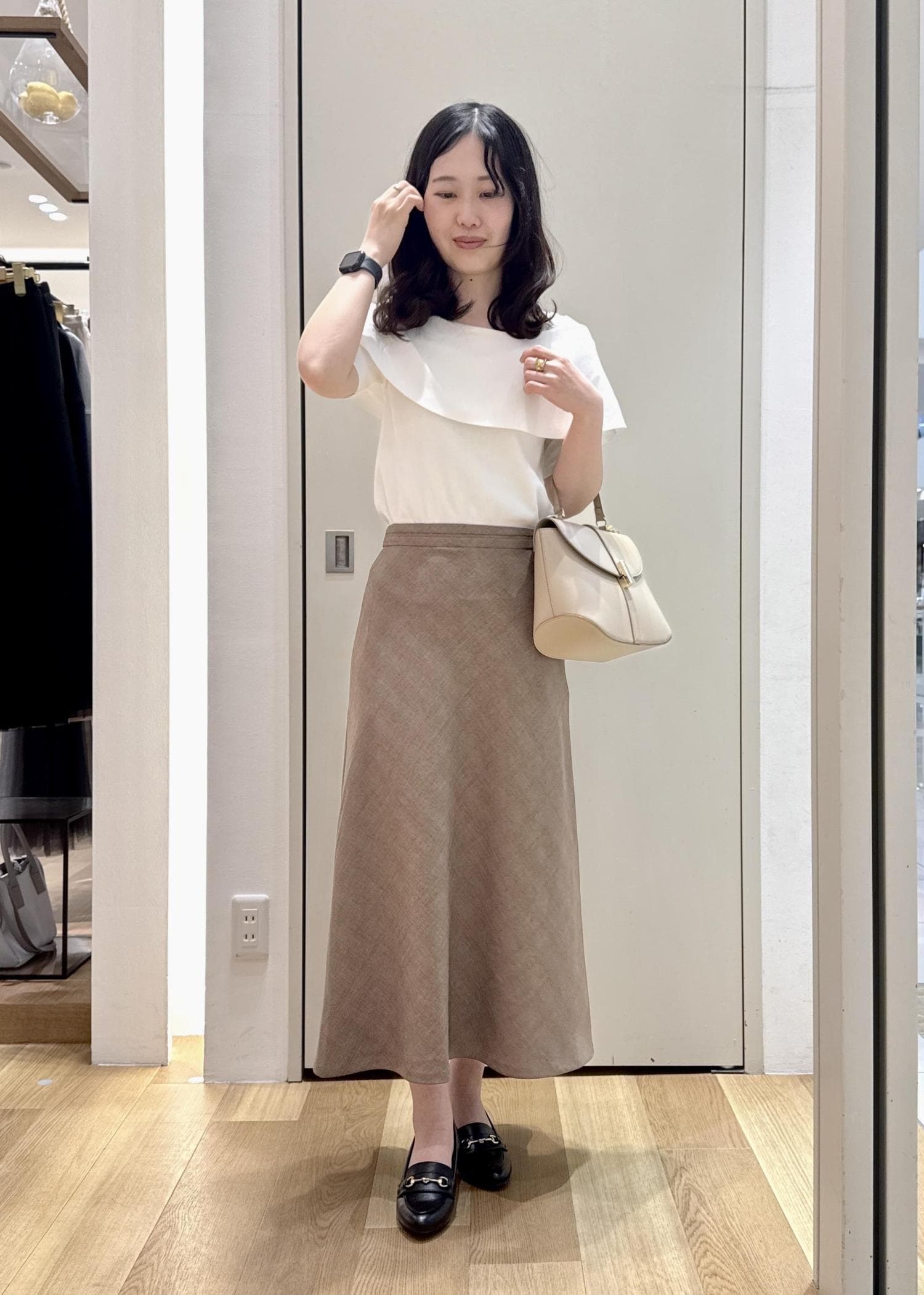 ベージュ×ブラックの落ち着いた配色で、汚れも気になりにくいスタイリングを目指しました。