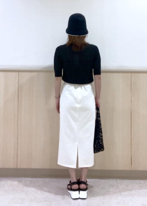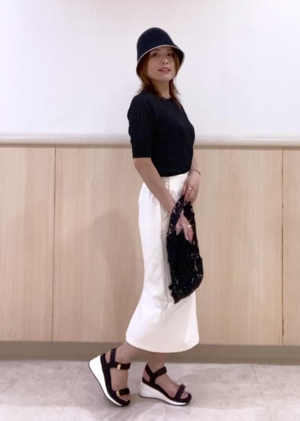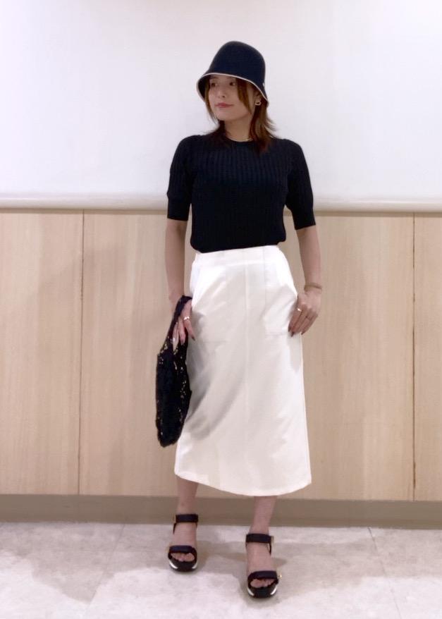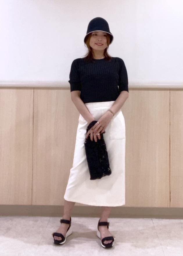 コンパクトなシルエットのトップスとタイトスカートを合わせた綺麗めなコーデをカジュアルな小物で外したモノトーンコーデ!