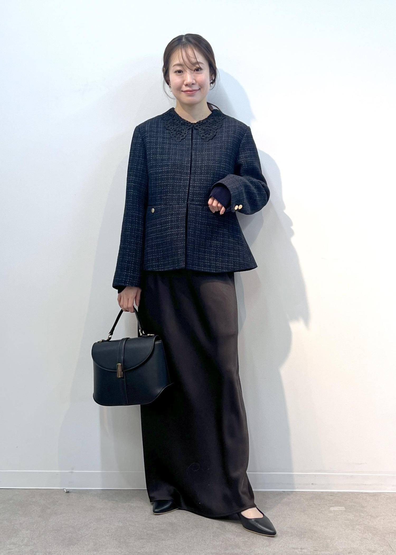 金釦が上品なチャコールのカーディジャケットをメインに、ウエストを折り返してこなれ感のあるシャンブレーパンツを合わせました☺︎ハイウエストのワイドパンツなので、広がりすぎず脚長効果◎