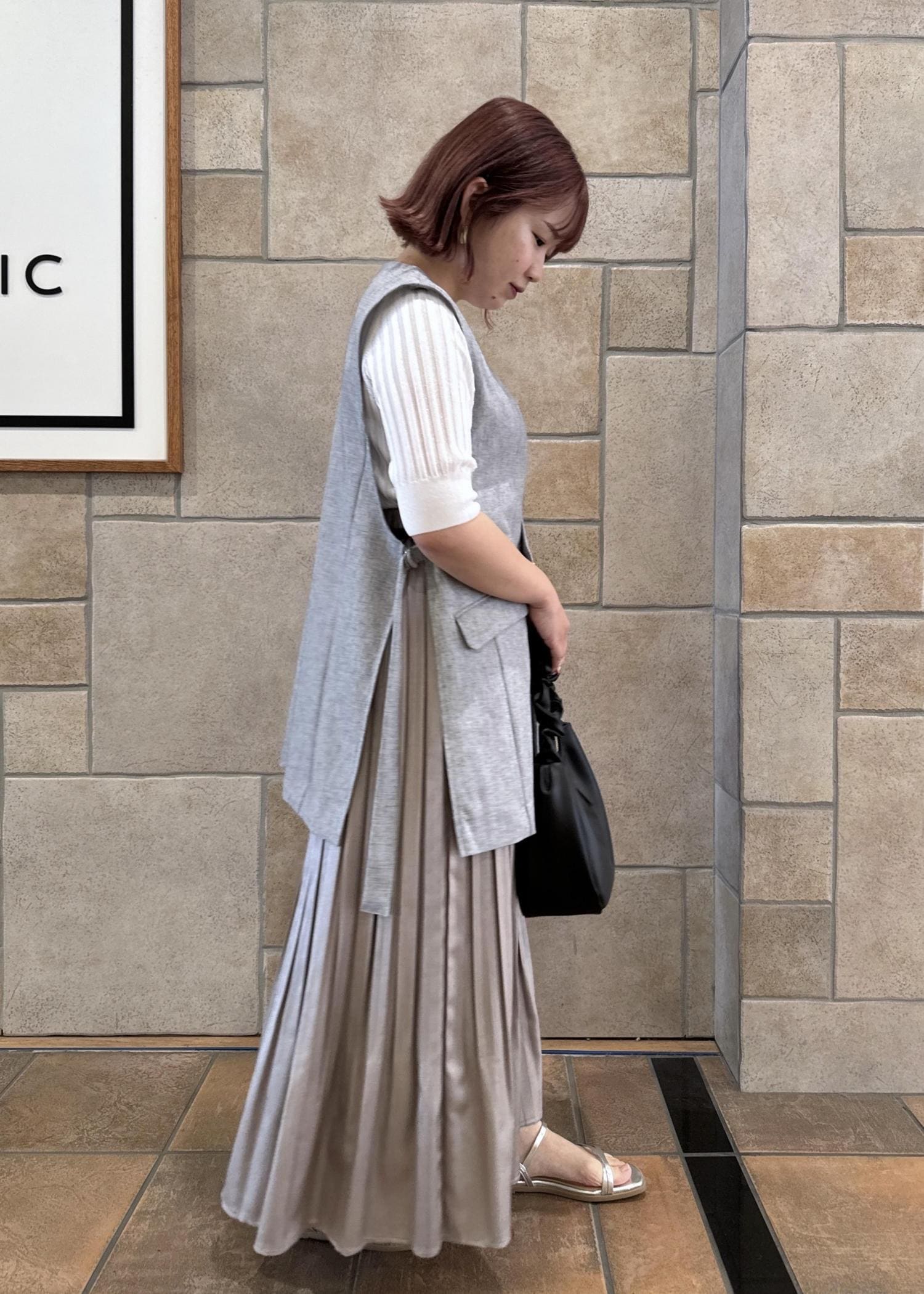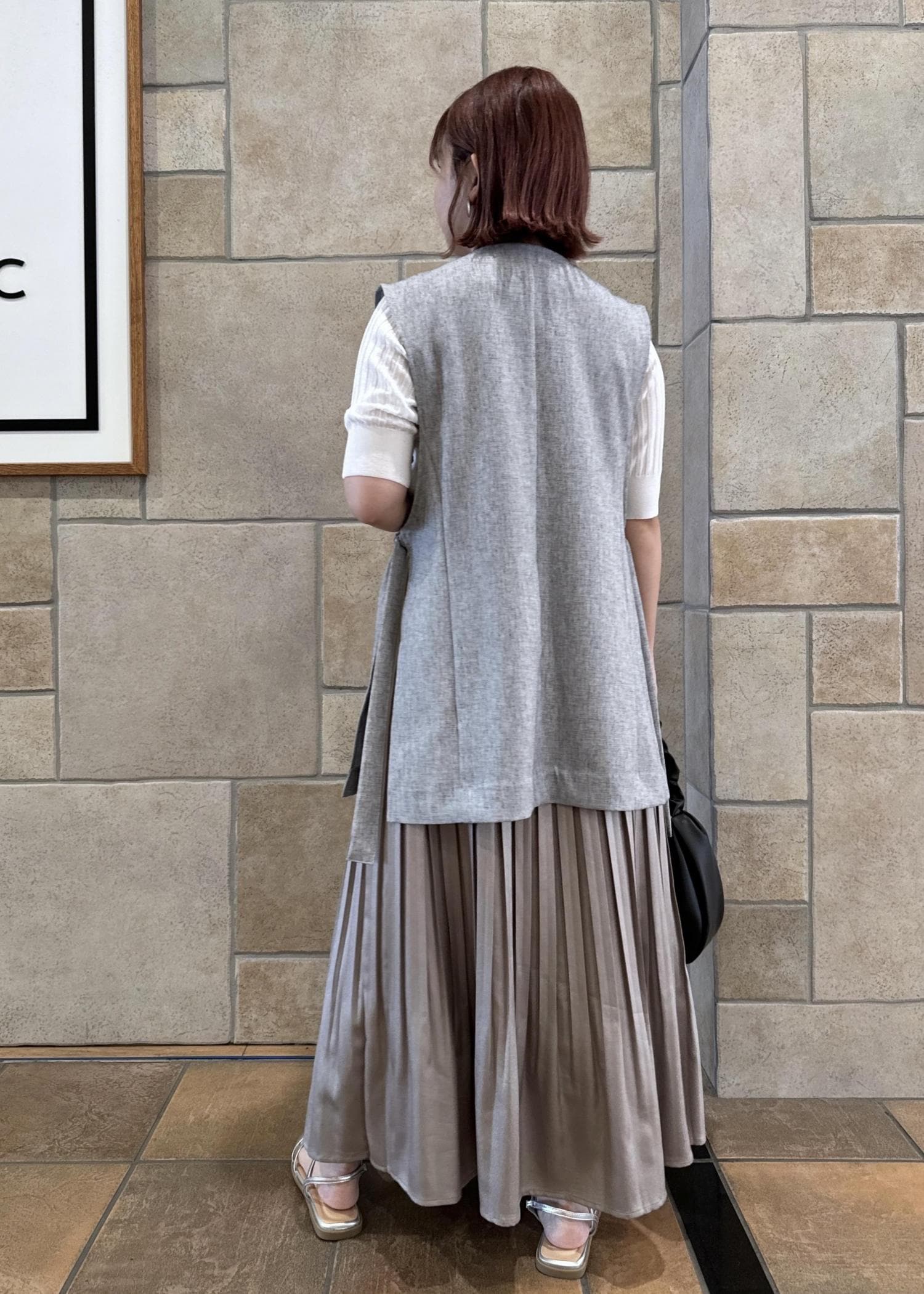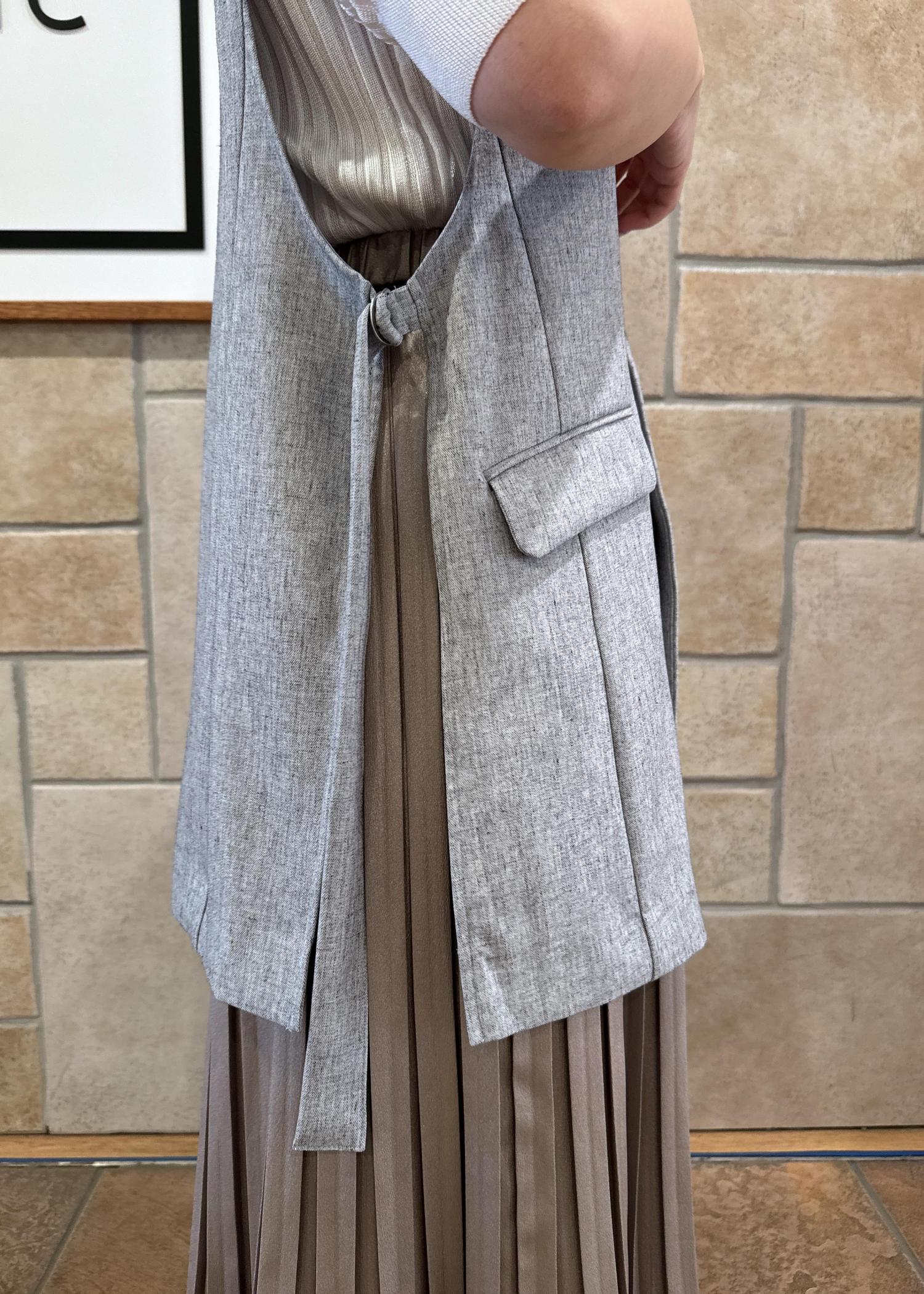 グレーのジレを合わせてきれいめ、スタイリッシュなコーデに。