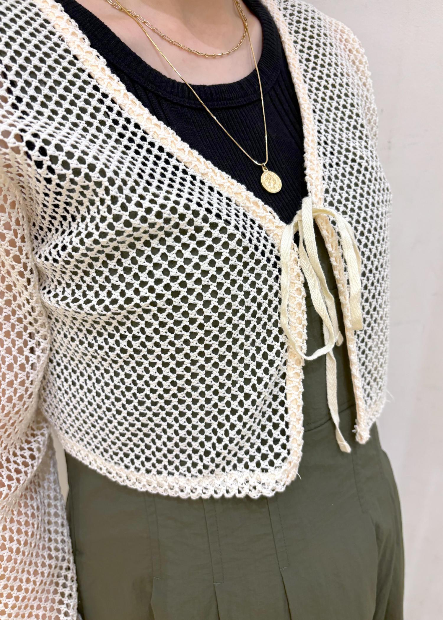 長袖ですがメッシュ素材なのでまだこれからの暑い季節も着用できます!軽くて短丈なので厚着すぎないで気軽にレイヤードしやすいおしゃれアイテムです。 -
