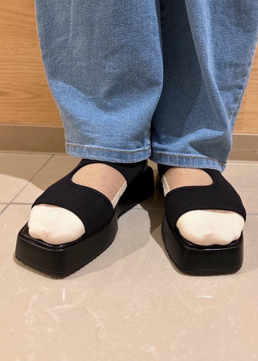 ウエストに太めのゴムが入った美シルエットのカーブデニム。