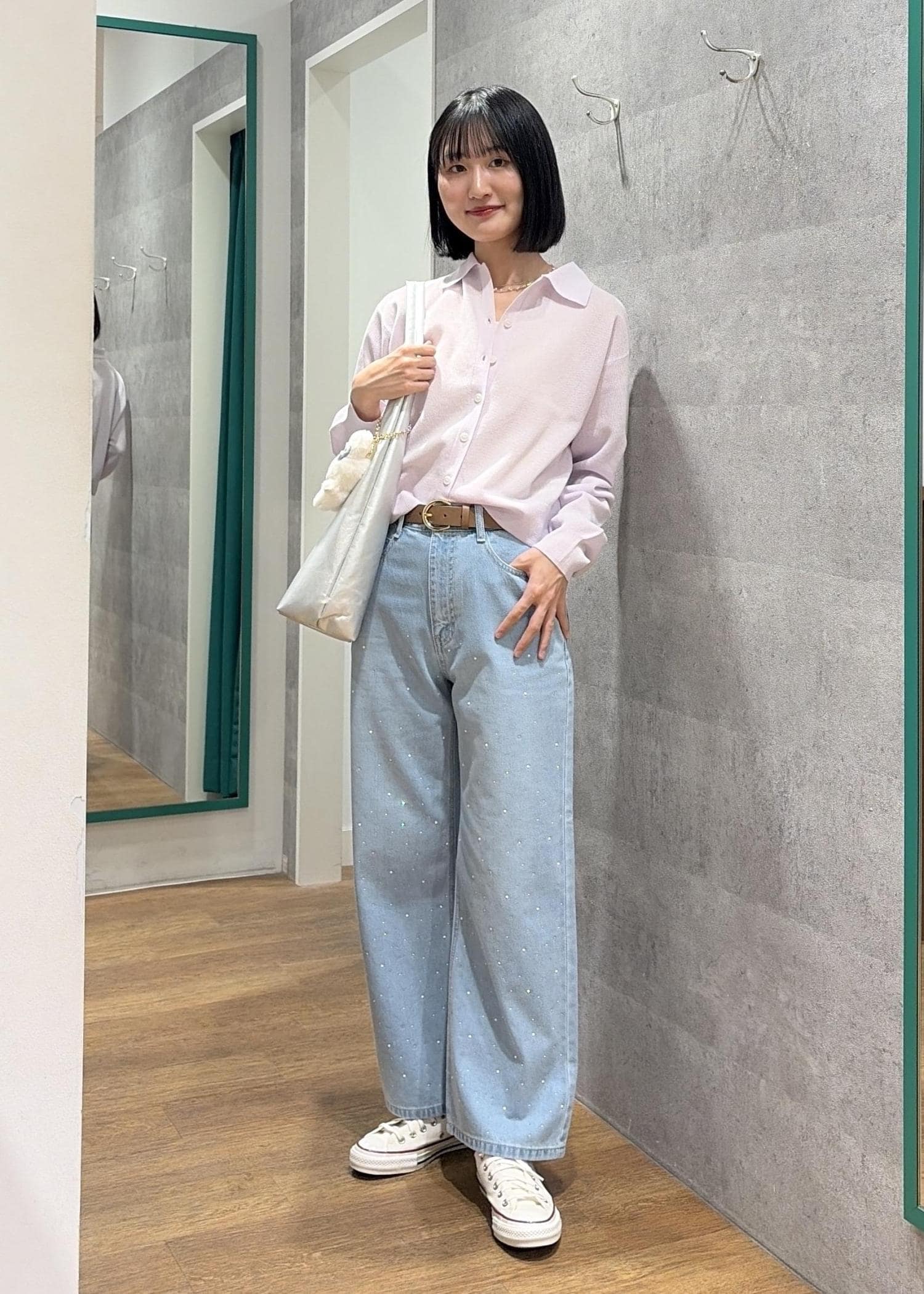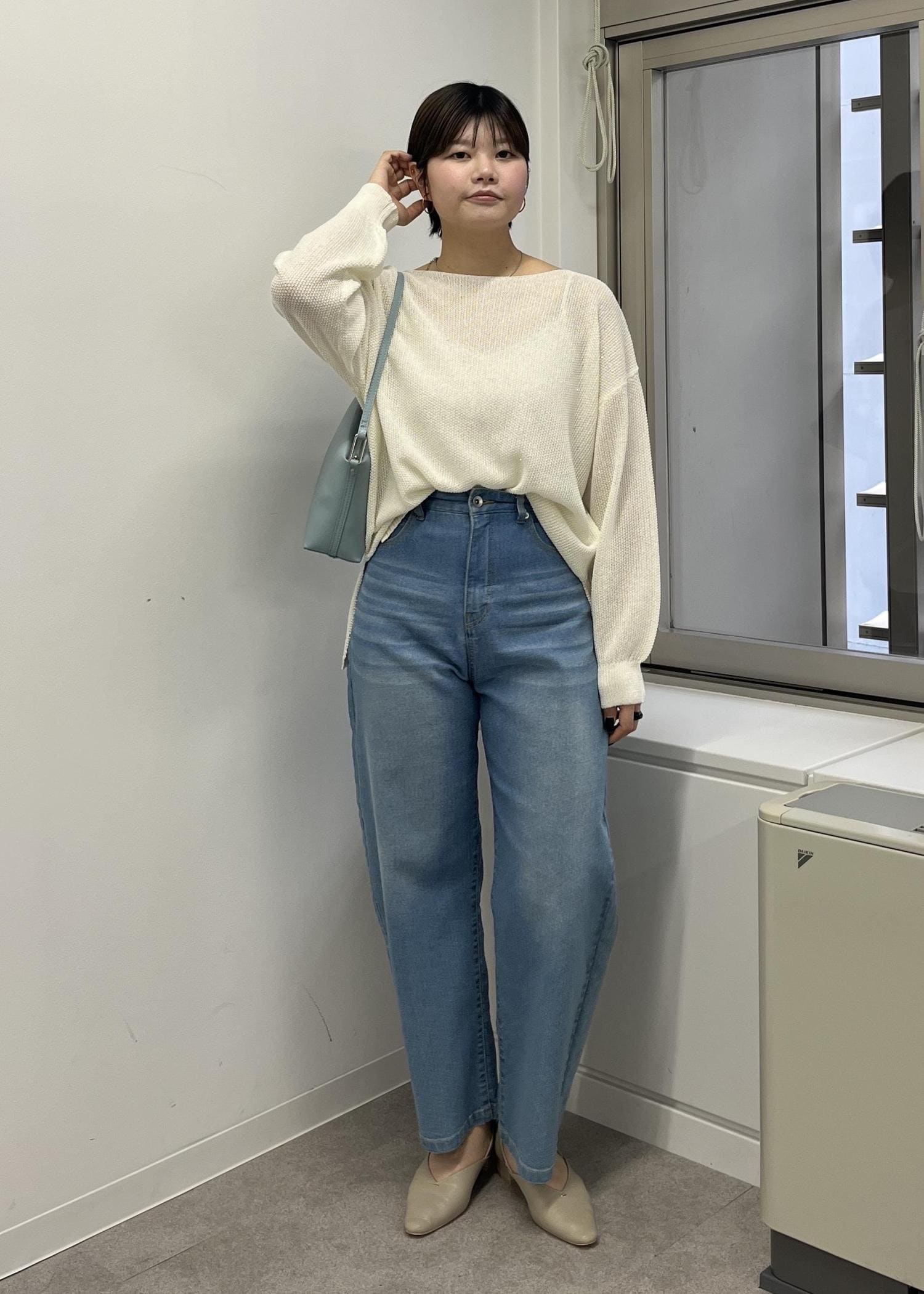 ワントーンのコーディネートですが、異素材を取り入れているため、寸胴に見えせずに着られます!
