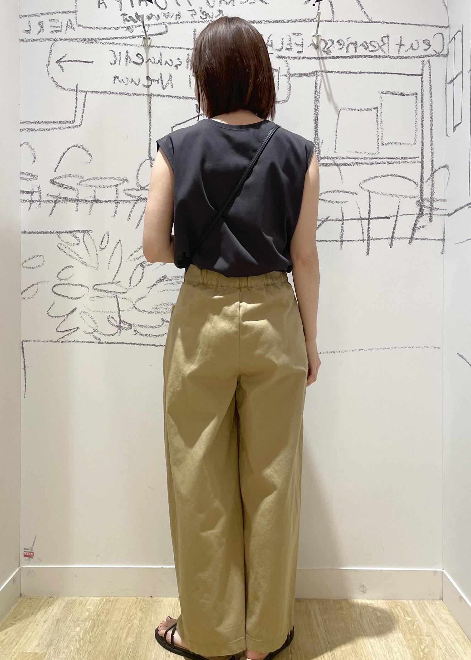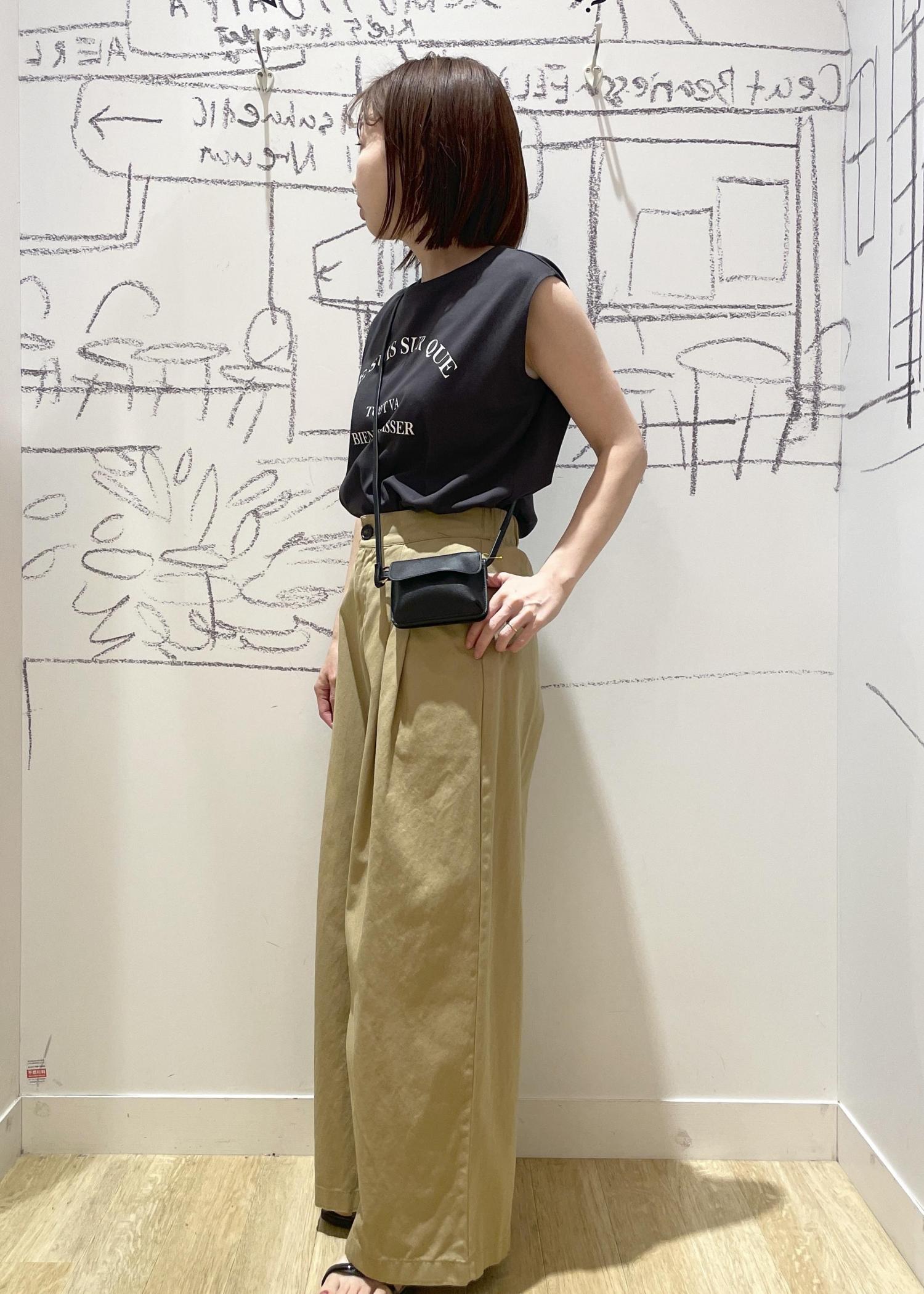 ノースリーブトップス×タックパンツのカジュアルスタイル。 ミニウォレットショルダーを合わせて 休日のお散歩に。