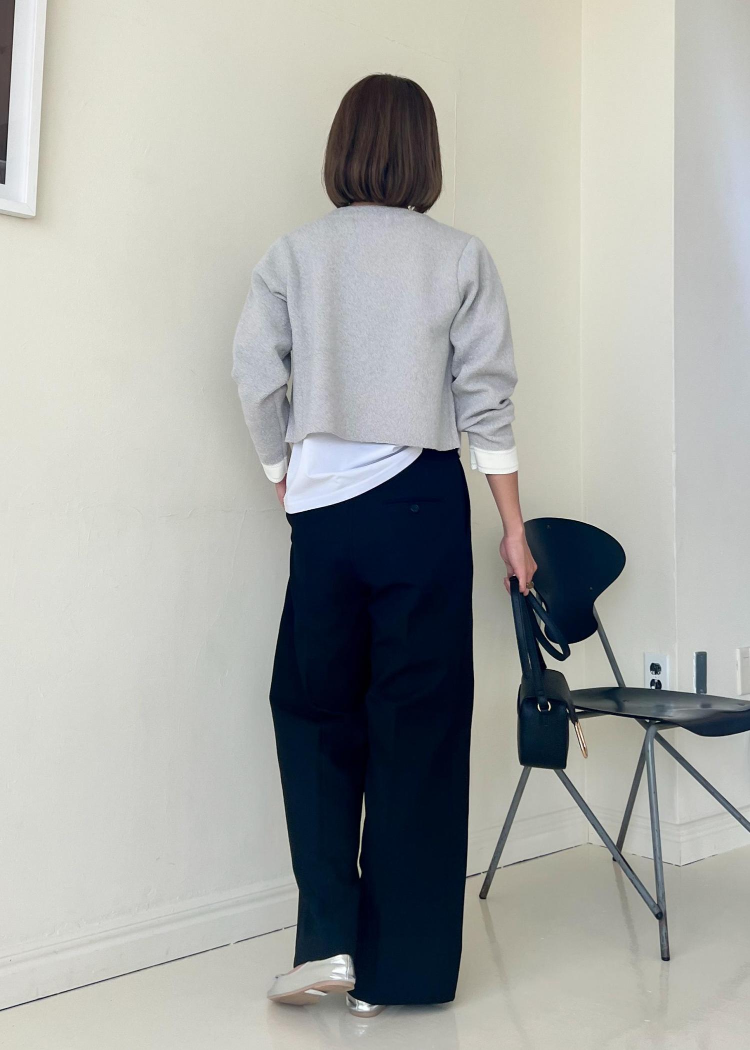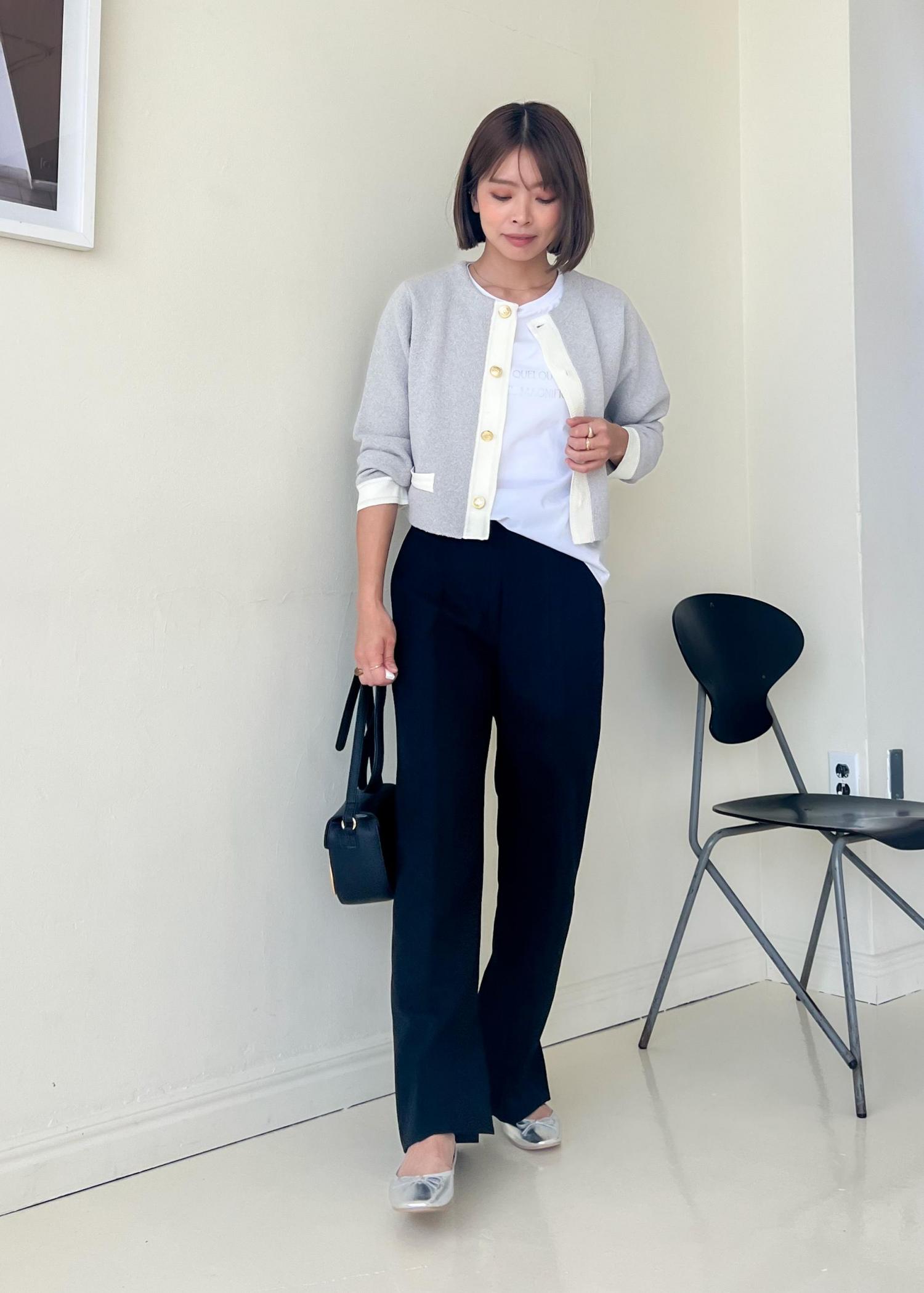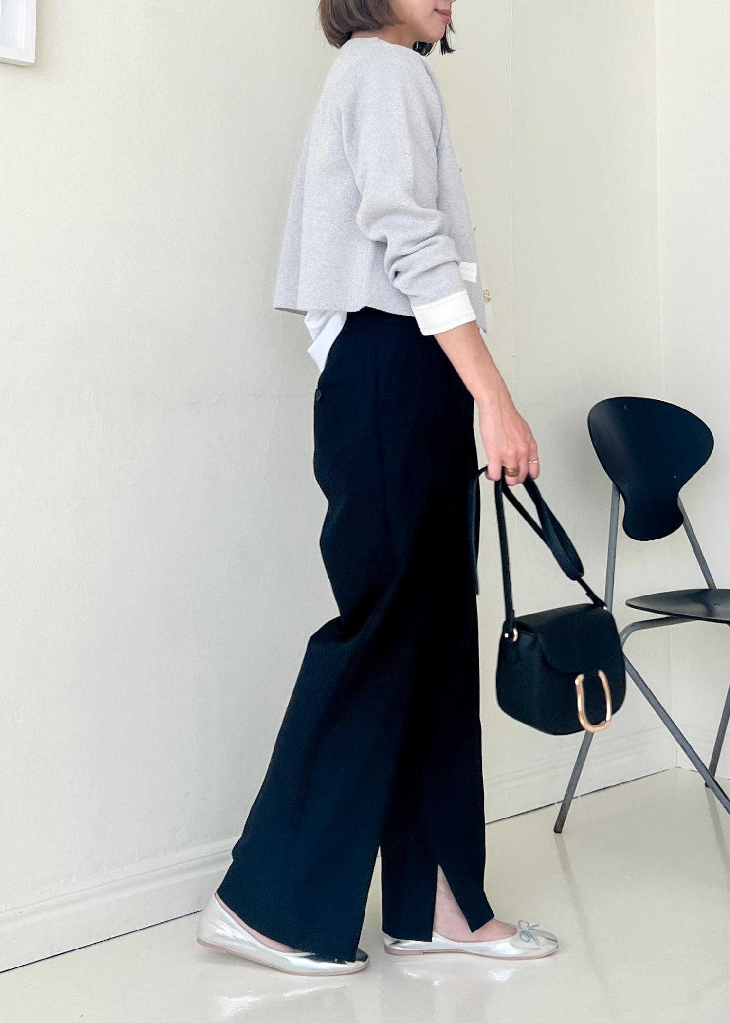 ツイード風デザインのカーディガンは、パンツスタイルでシンプルな大人コーデに。