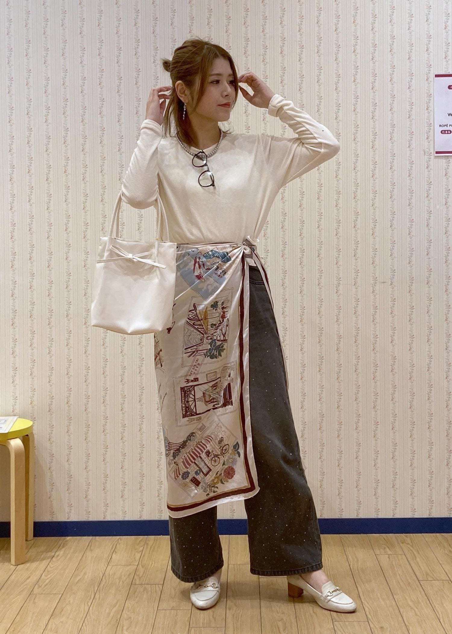 足元はマニッシュにゴツめのローファー×フェミニン感のあるスマホショルダーを組み合わせて甘辛ミックスにしたのがポイントです!