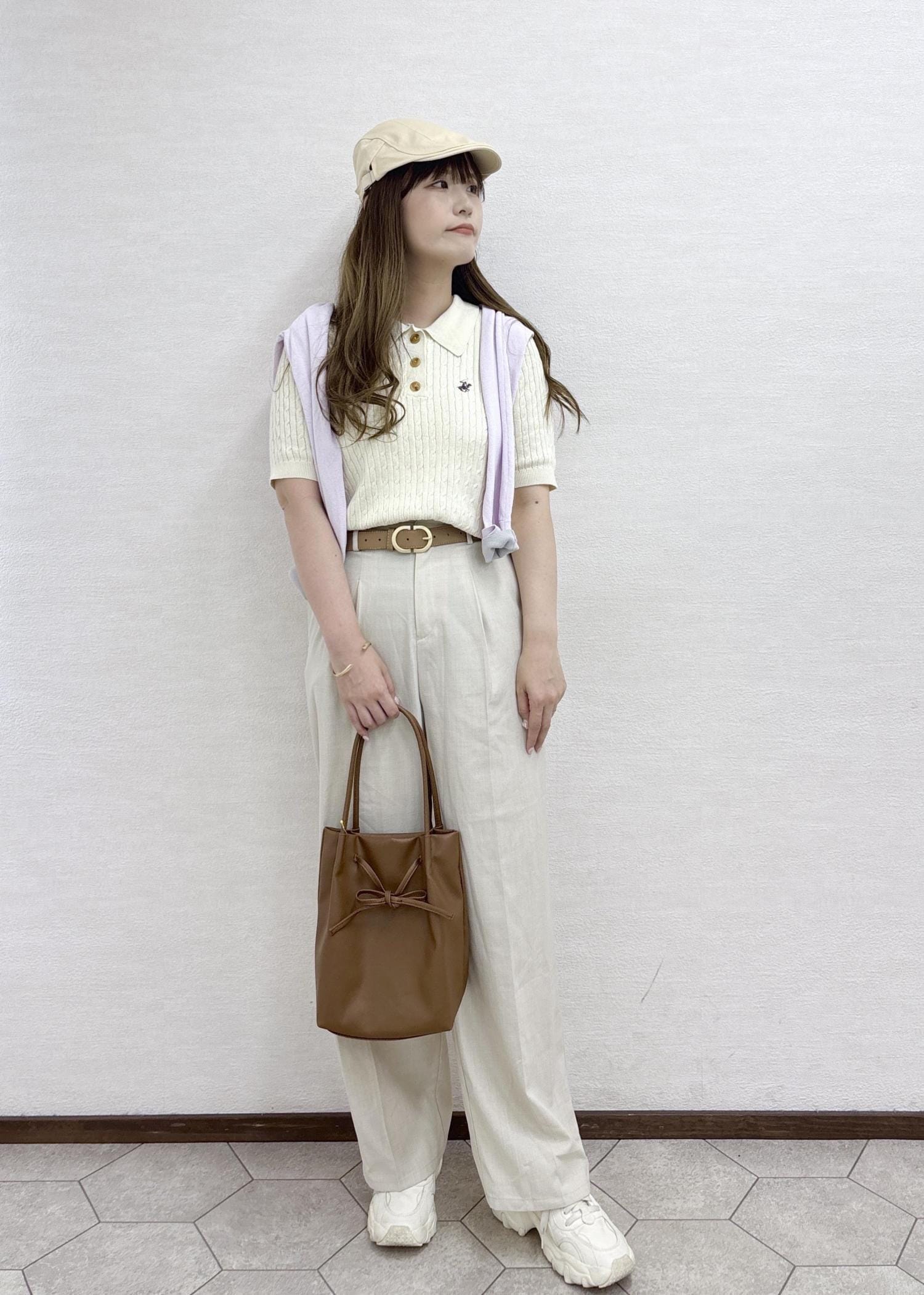 ラメが華やか見えするニットに爽やかな白のスカートを合わせたお出かけにぴったりなコーディネートです。
