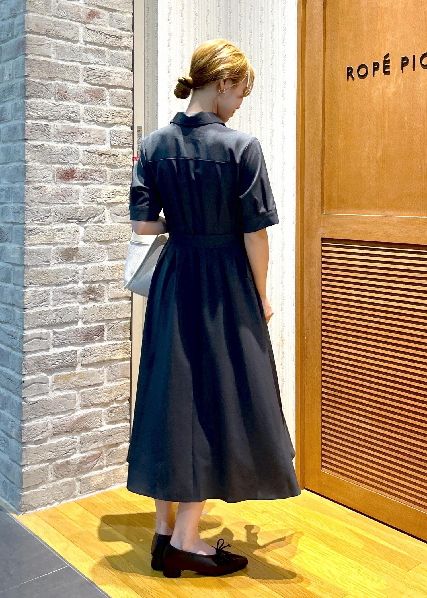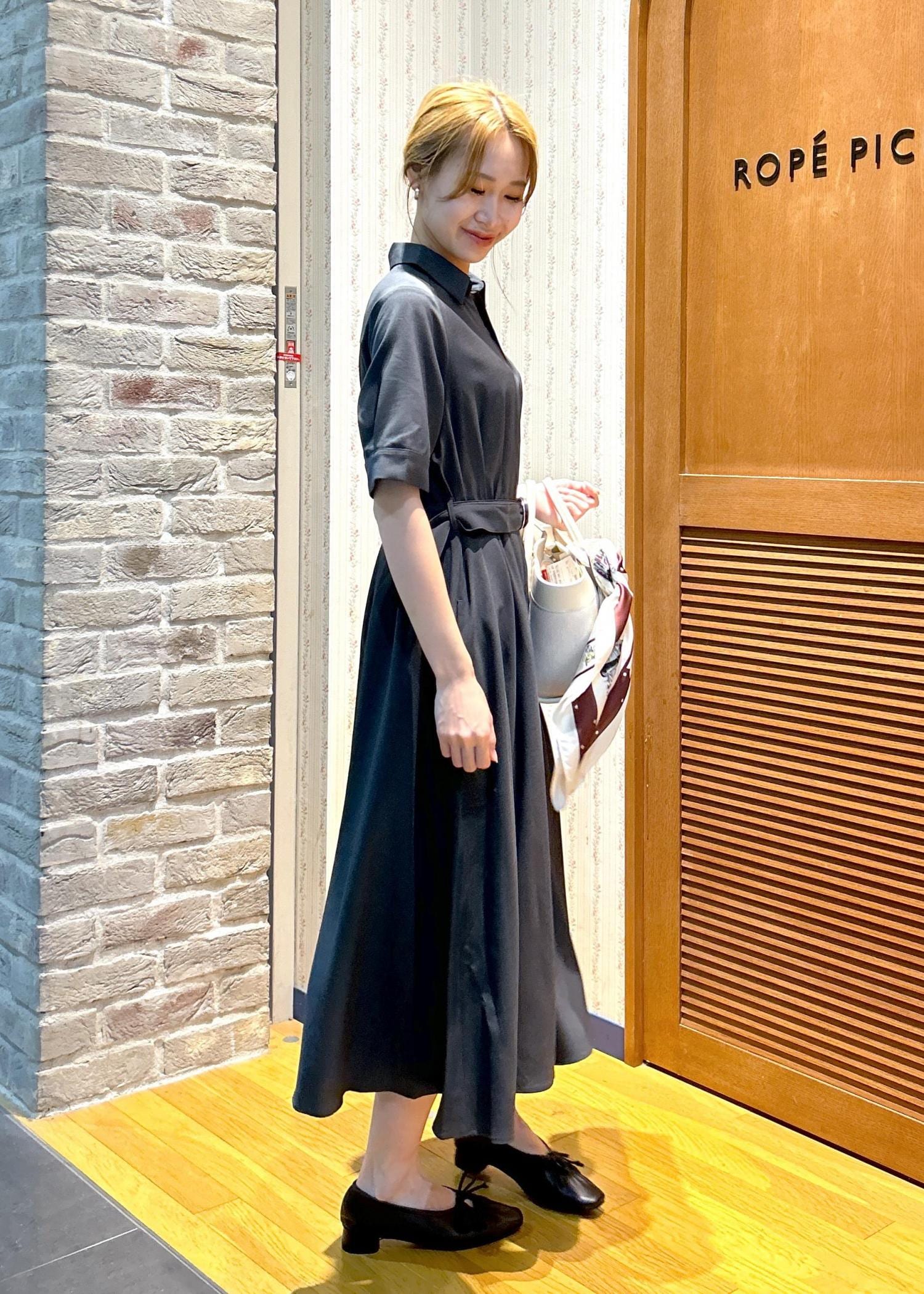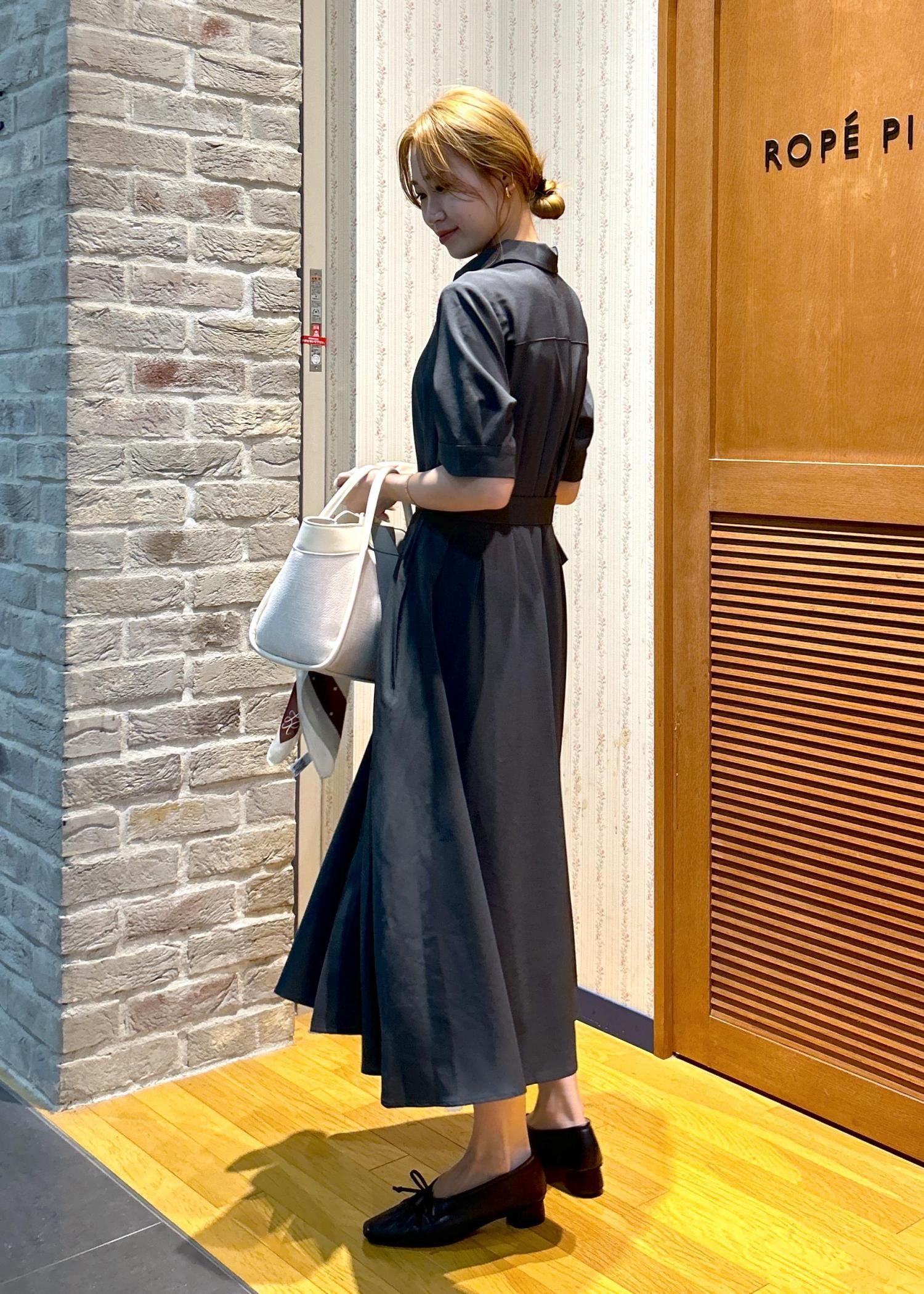 グレーの襟付きワンピースで上品さもありつつ、小物で差し色を入れキレイめなスタイリングにしました。