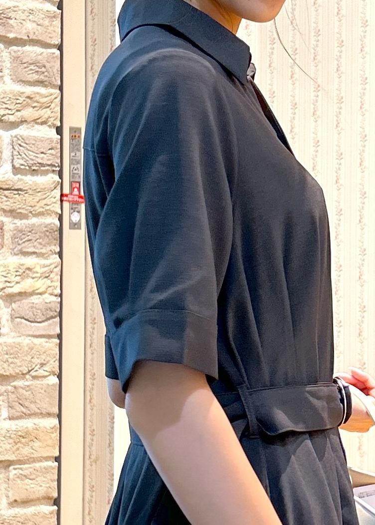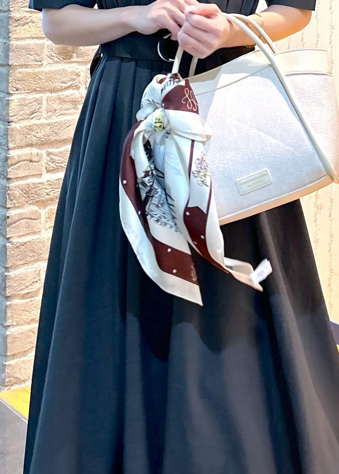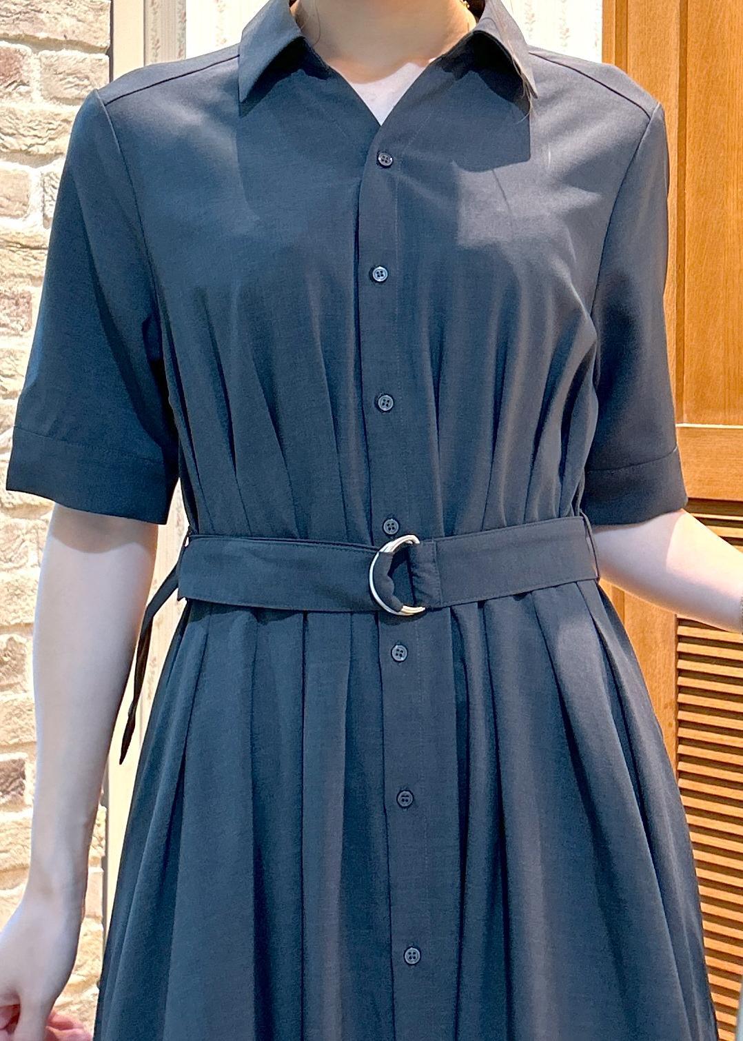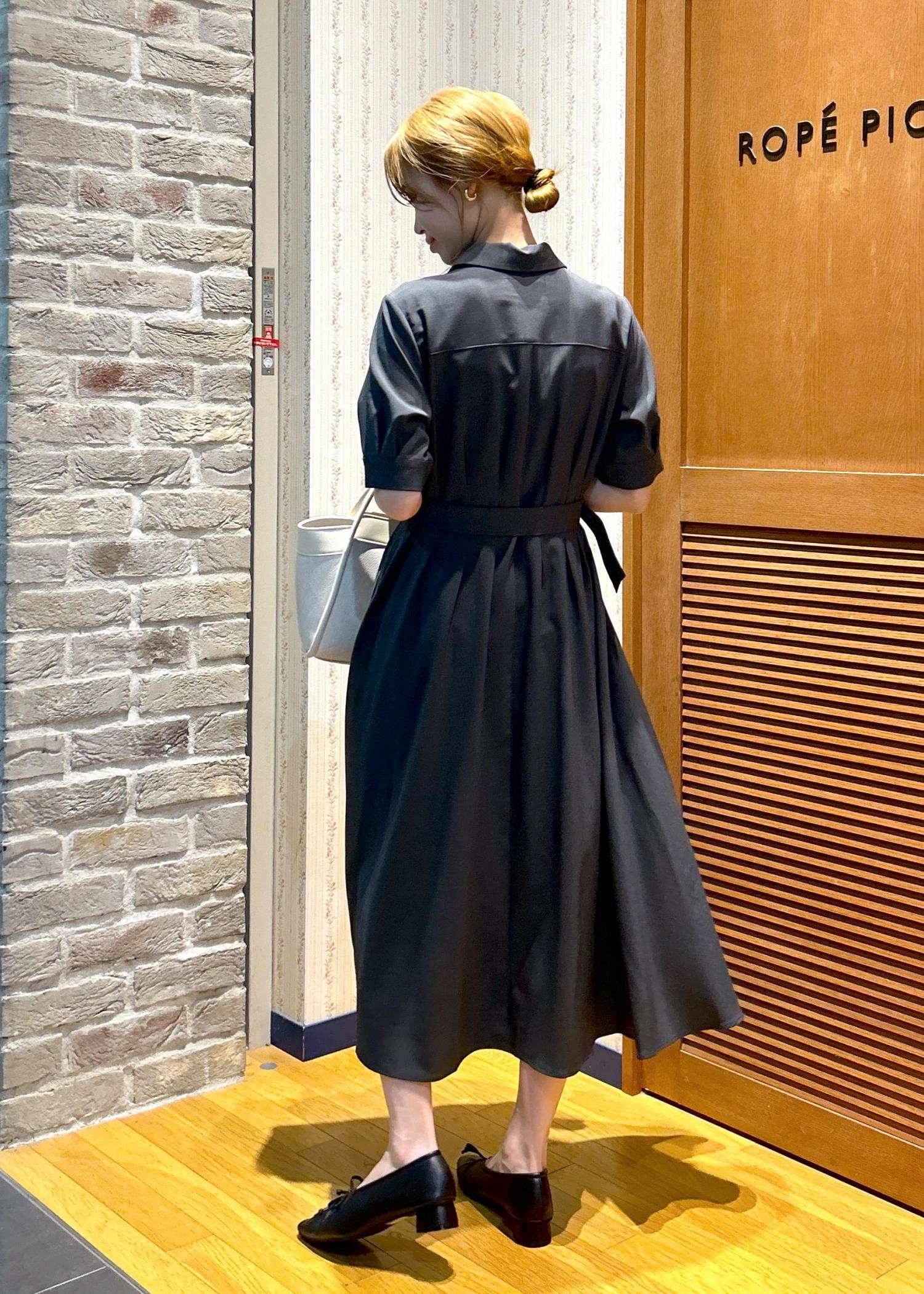 グレーの襟付きワンピースで上品さもありつつ、小物で差し色を入れキレイめなスタイリングにしました。