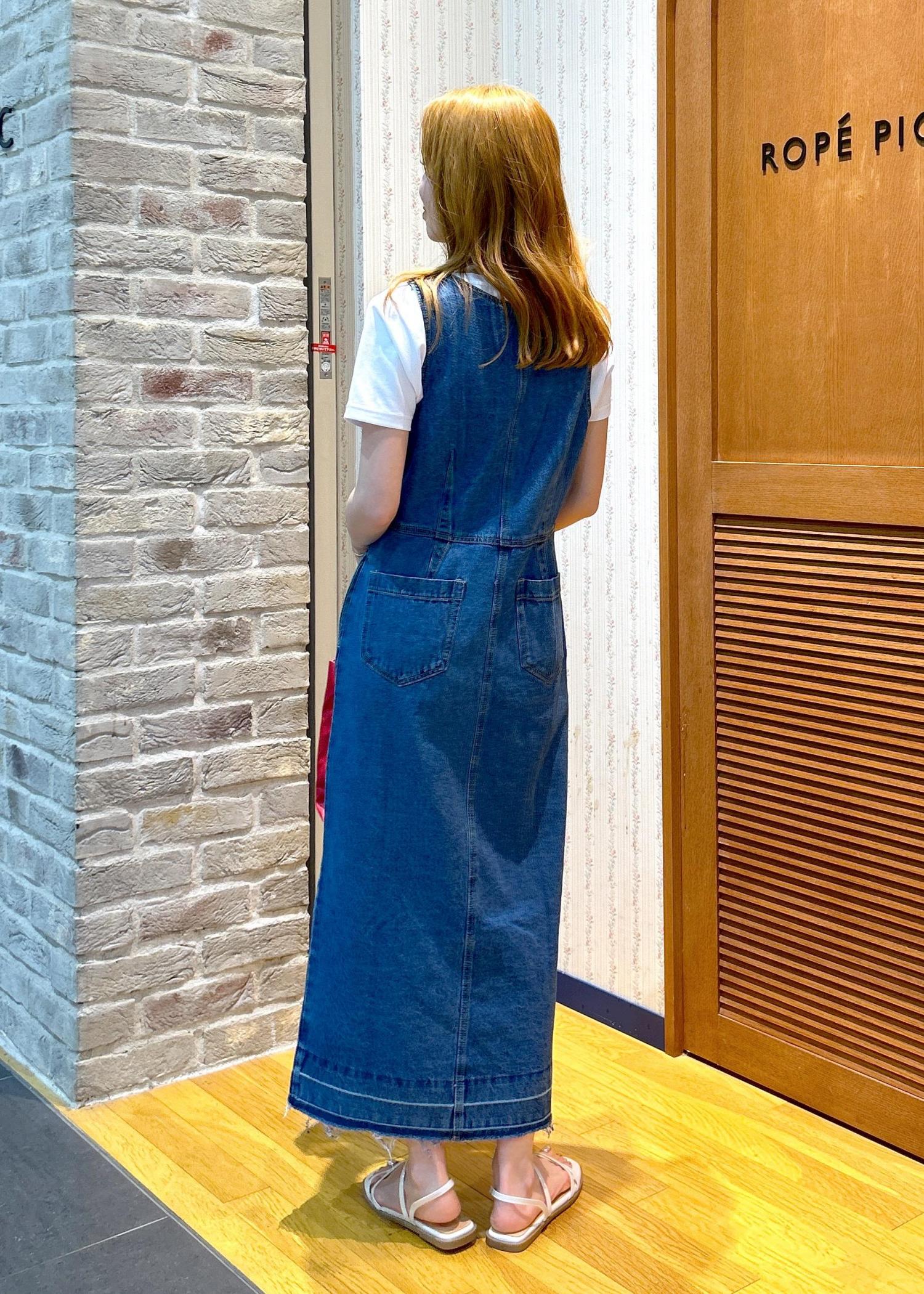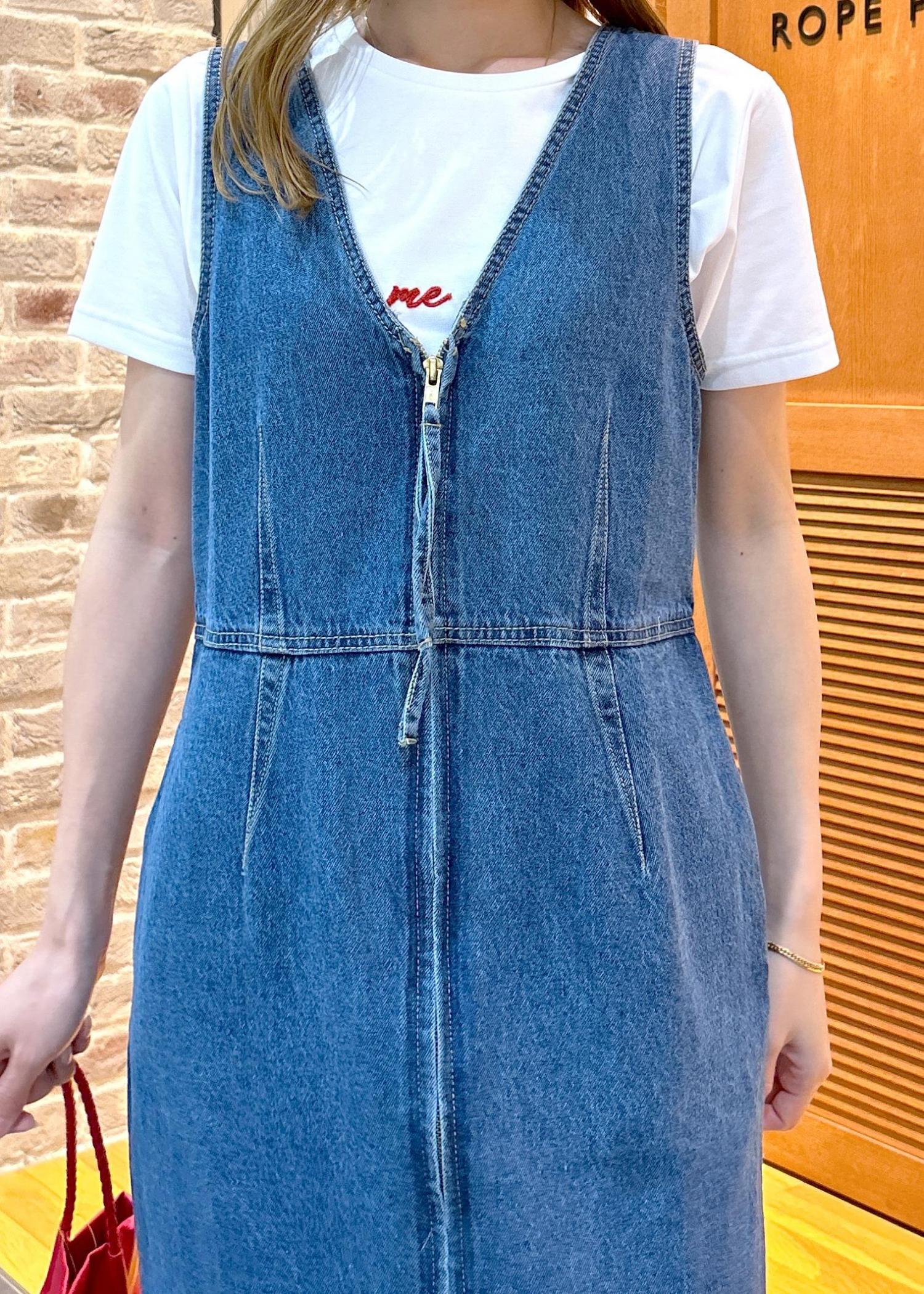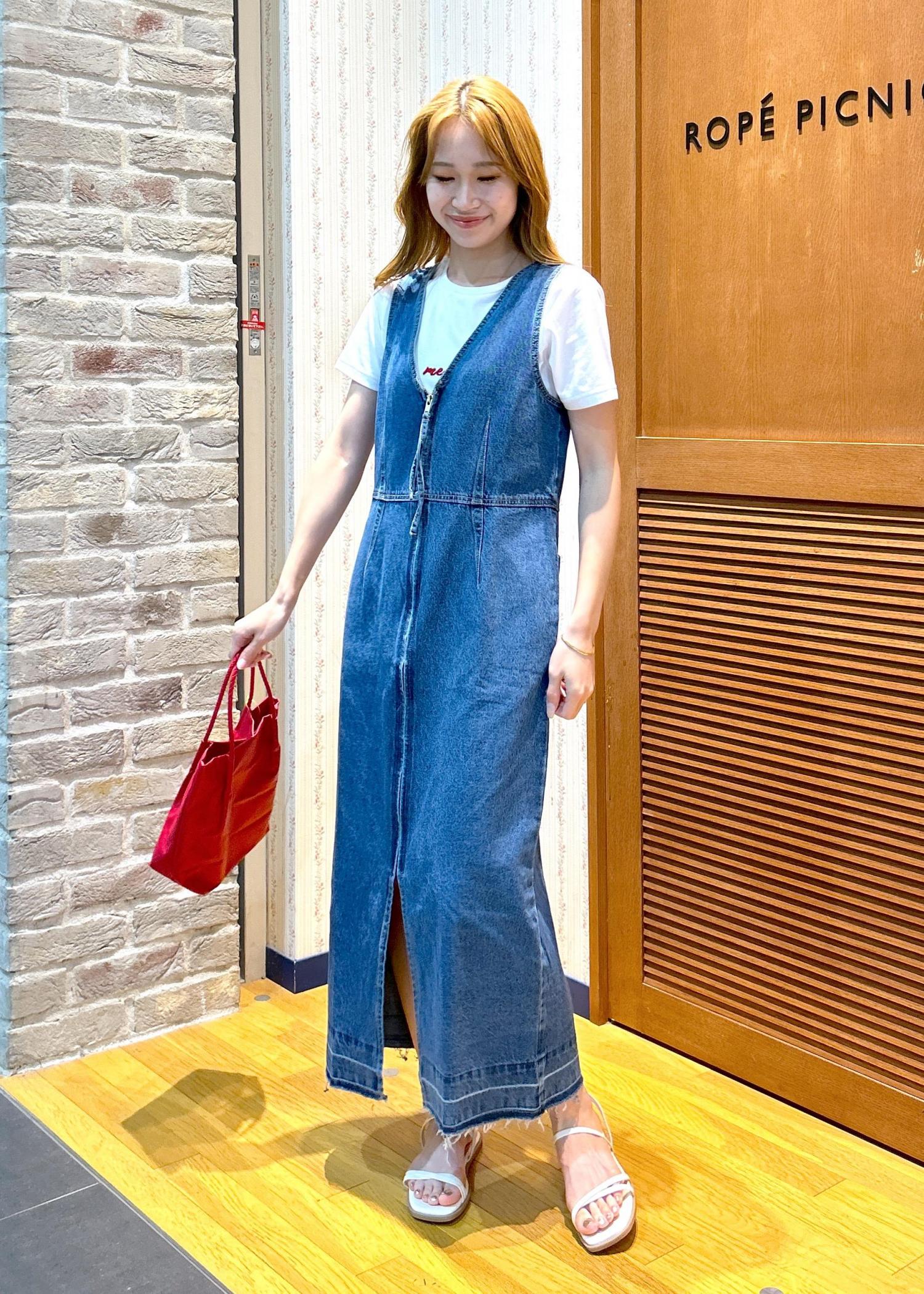 一枚で映えるデニムワンピースに、ロゴTを合わせて夏の大人カジュアルなスタイリングにしました。