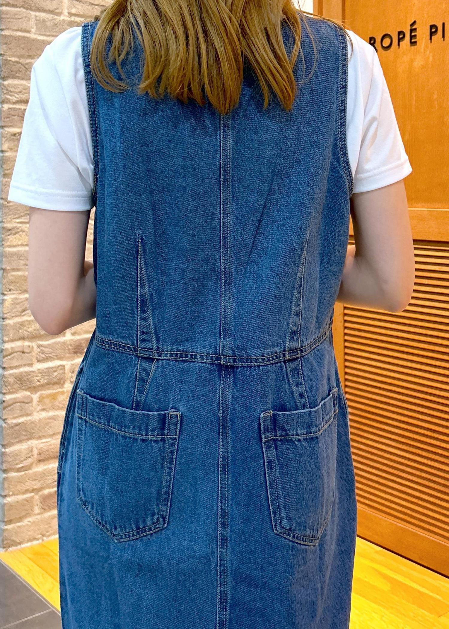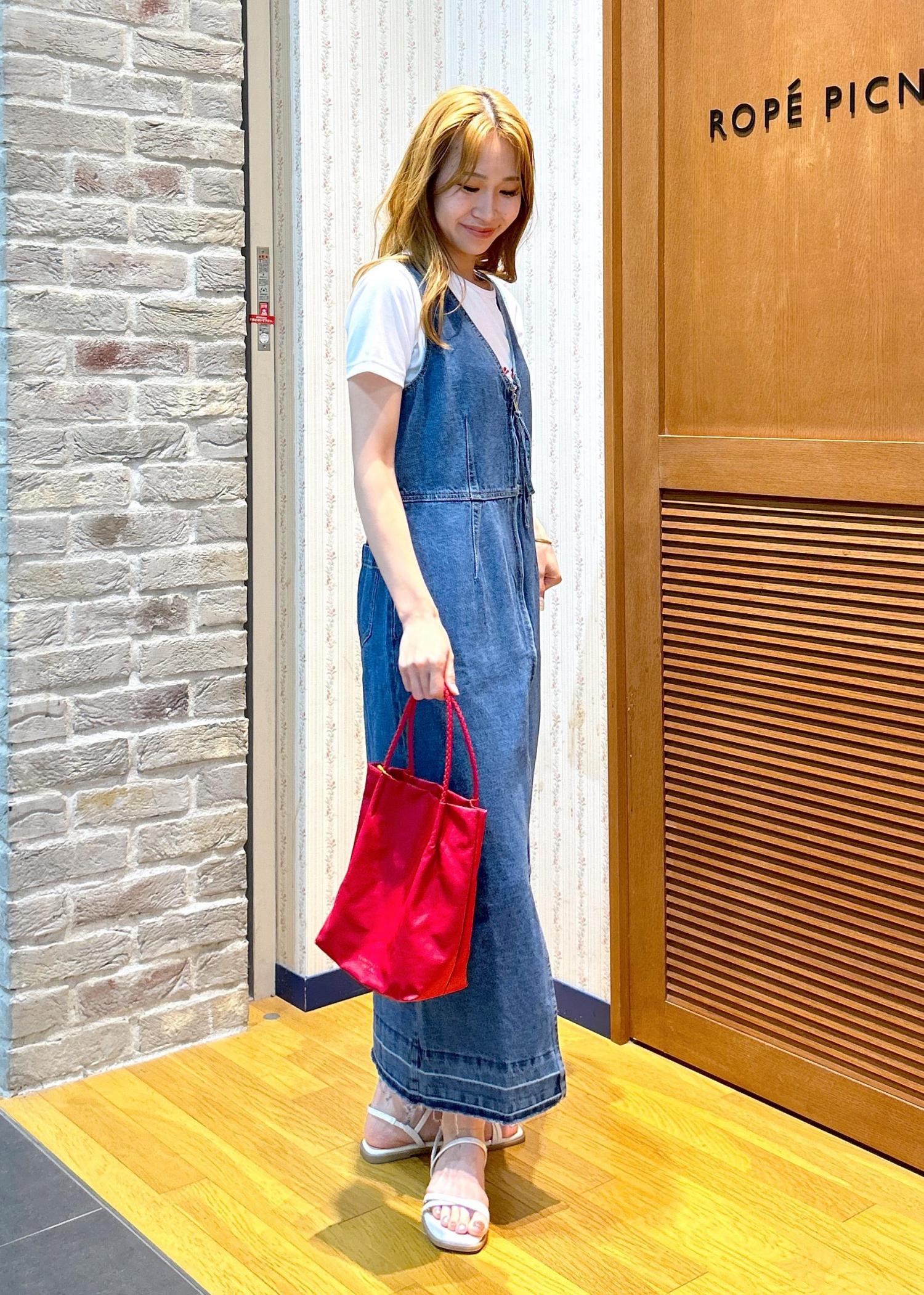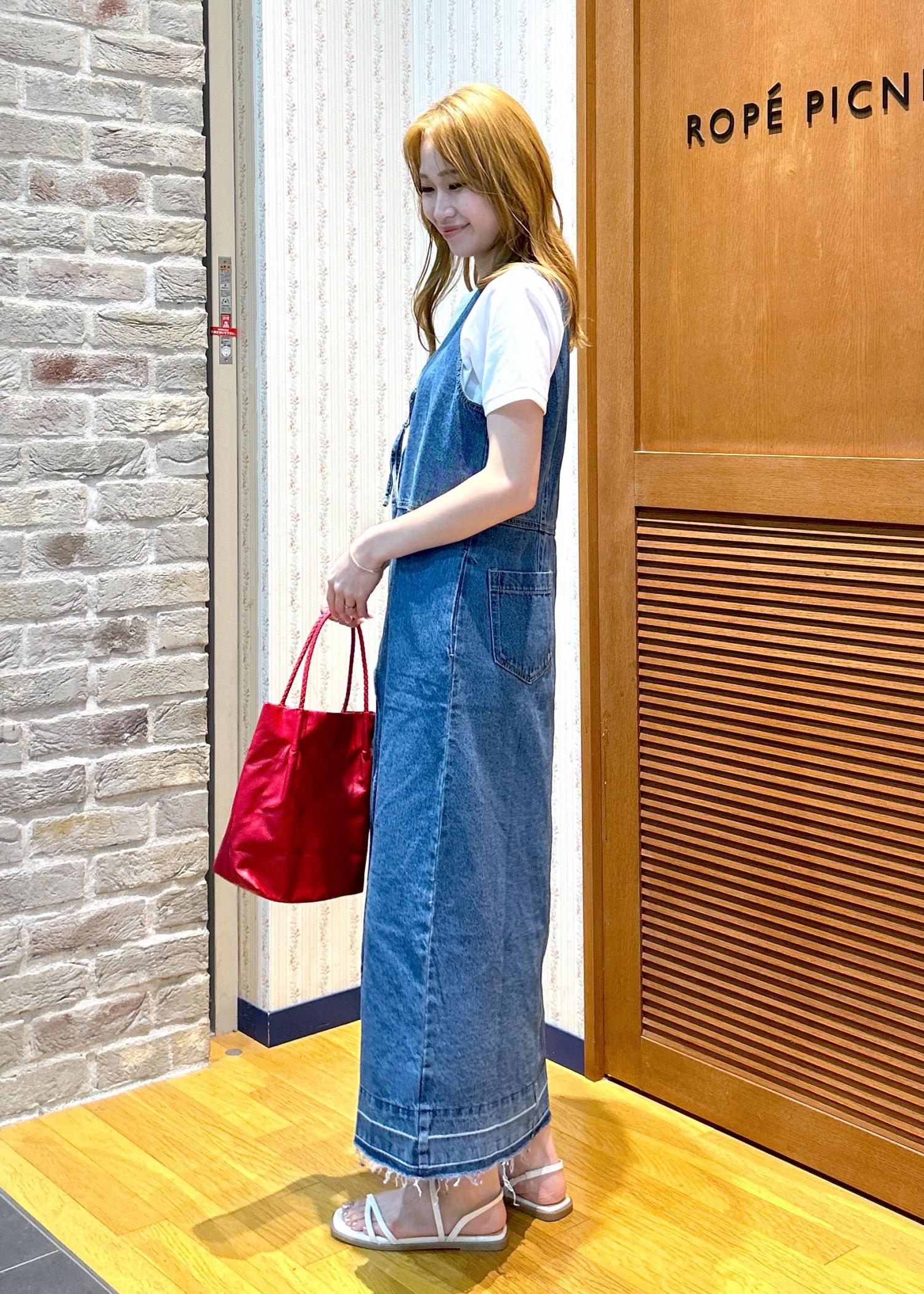一枚で映えるデニムワンピースに、ロゴTを合わせて夏の大人カジュアルなスタイリングにしました。