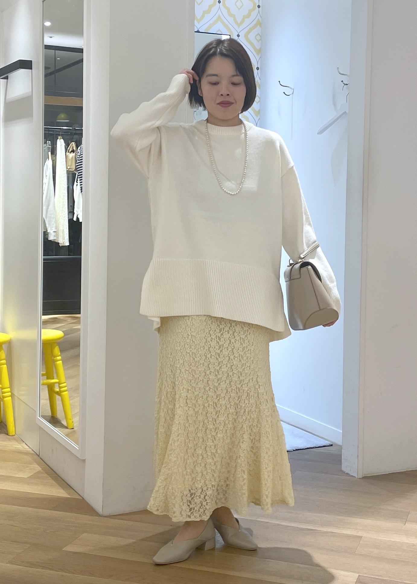インナーにレースブラウスを合わせて、品良くエレガンスなスタイルに◎