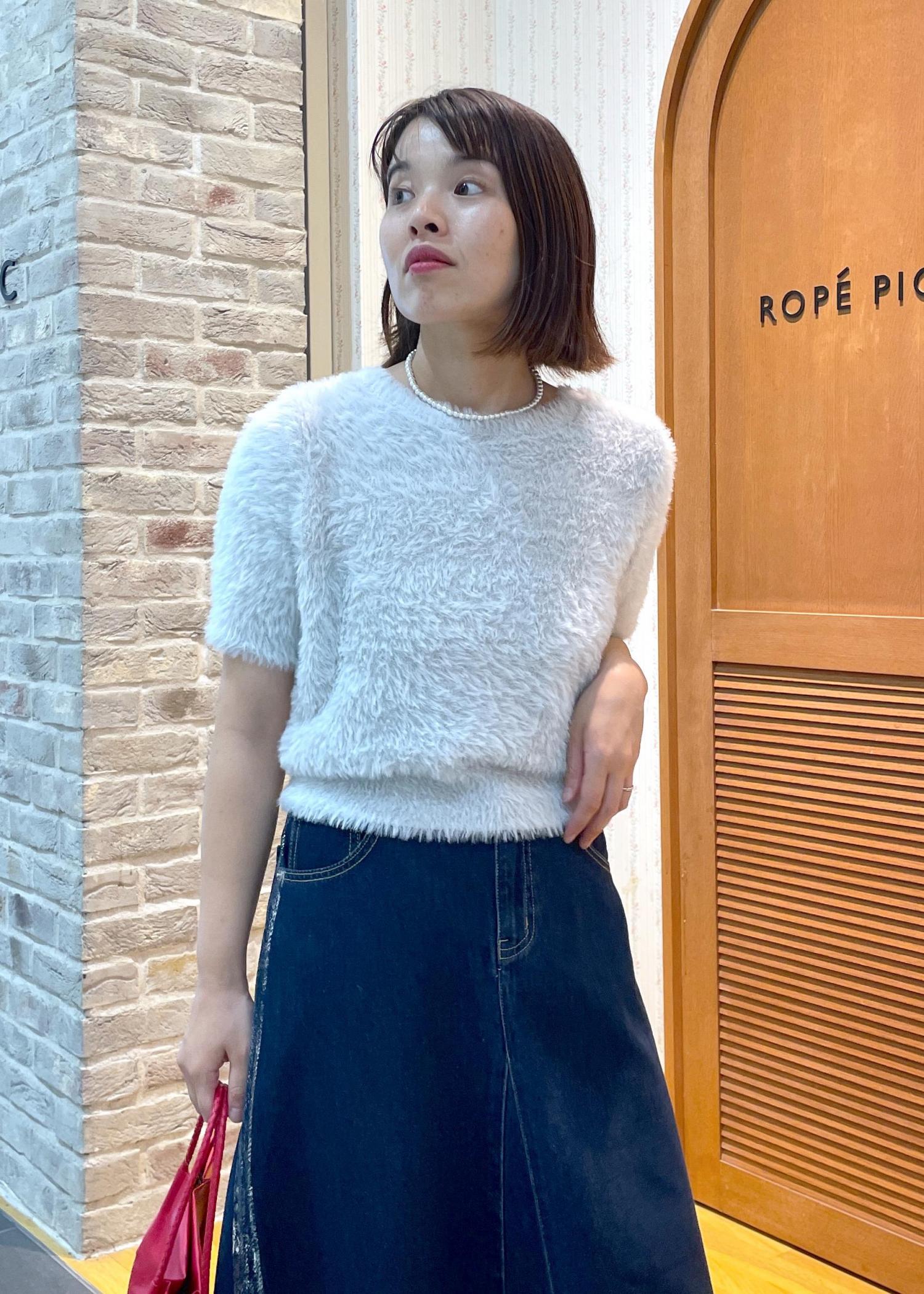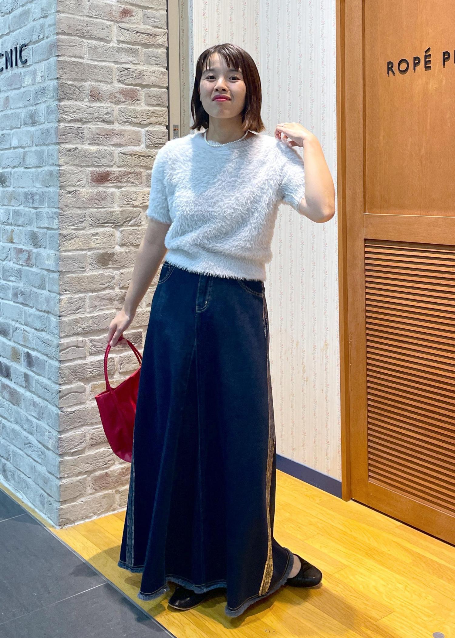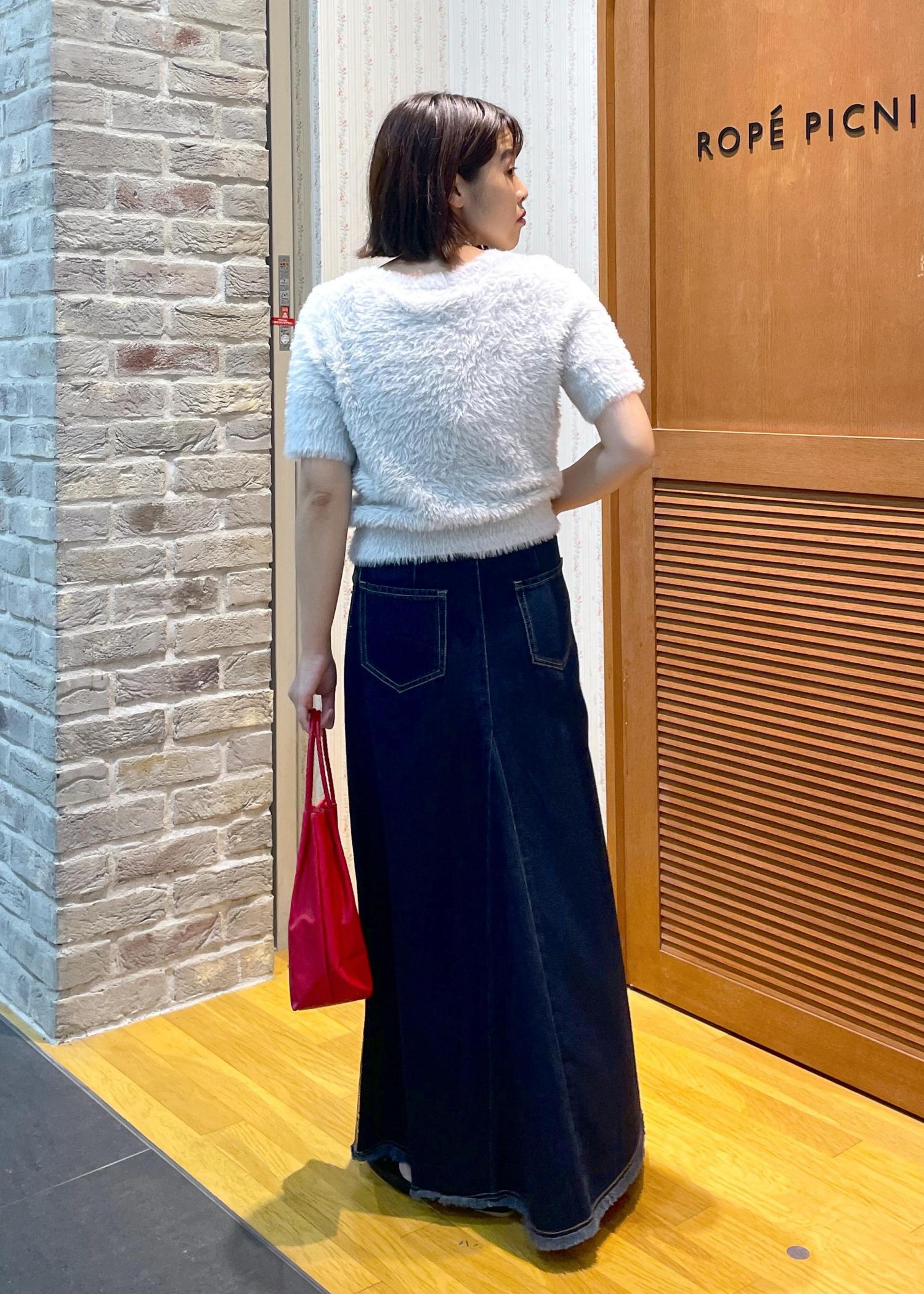 ふわふわの質感が秋冬のムードにぴったりのフェザーニットにデニムスカートを合わせた、甘めカジュアルコーデです!