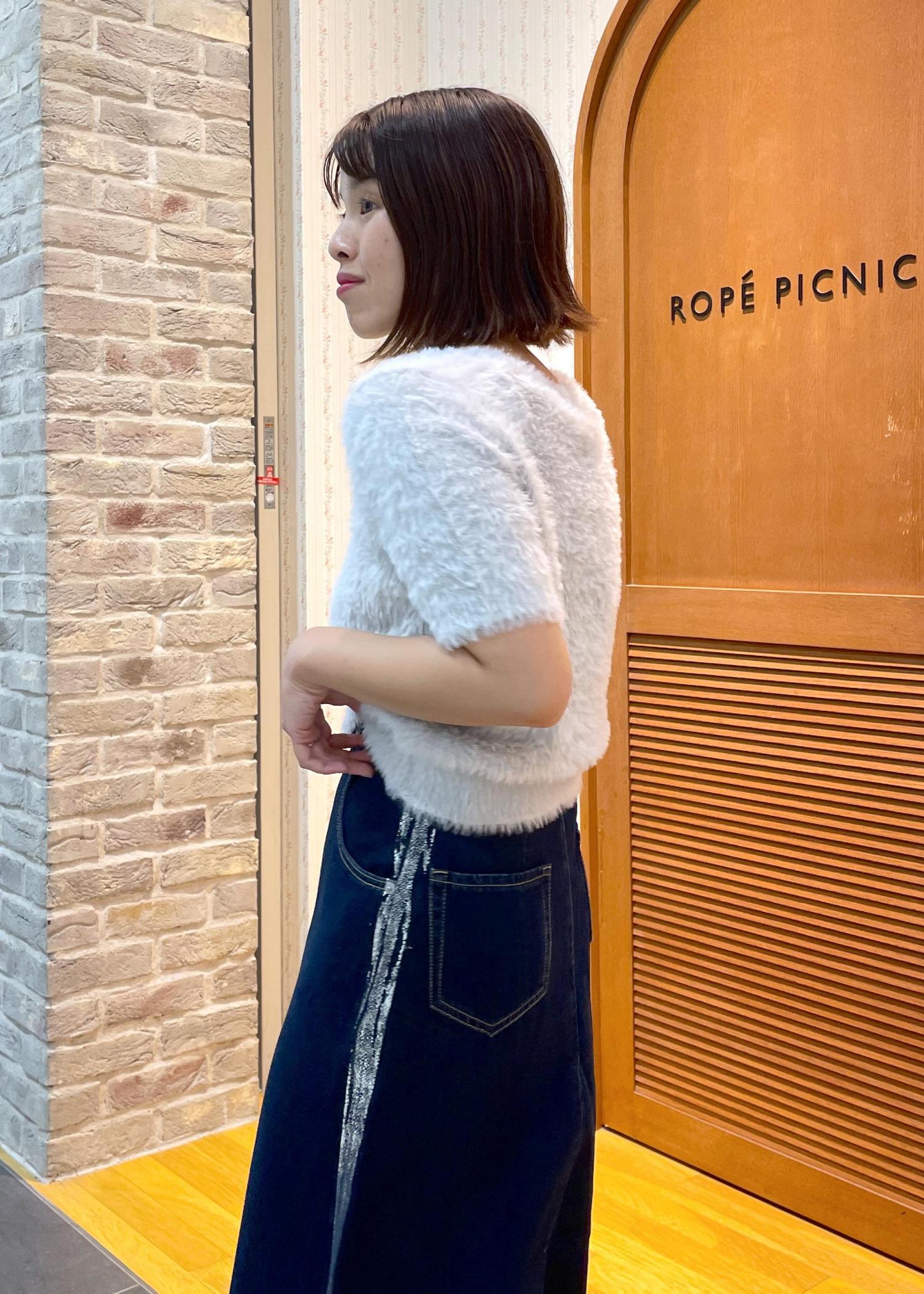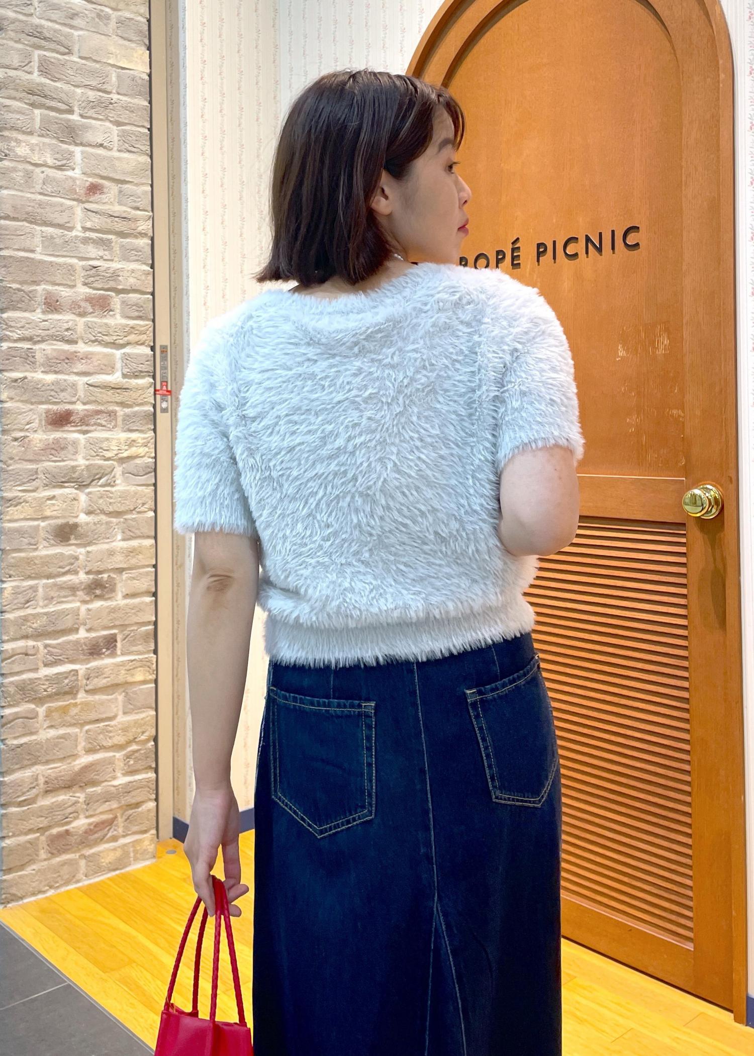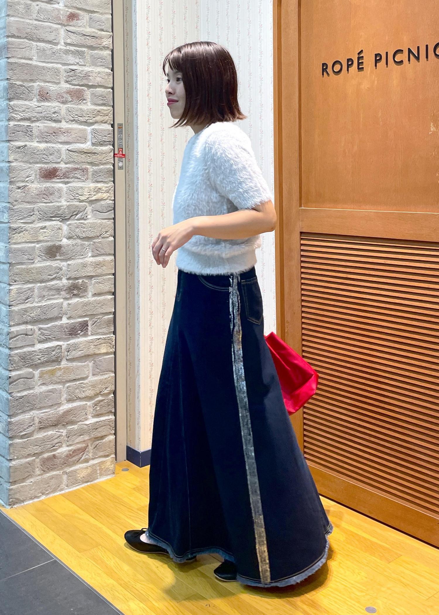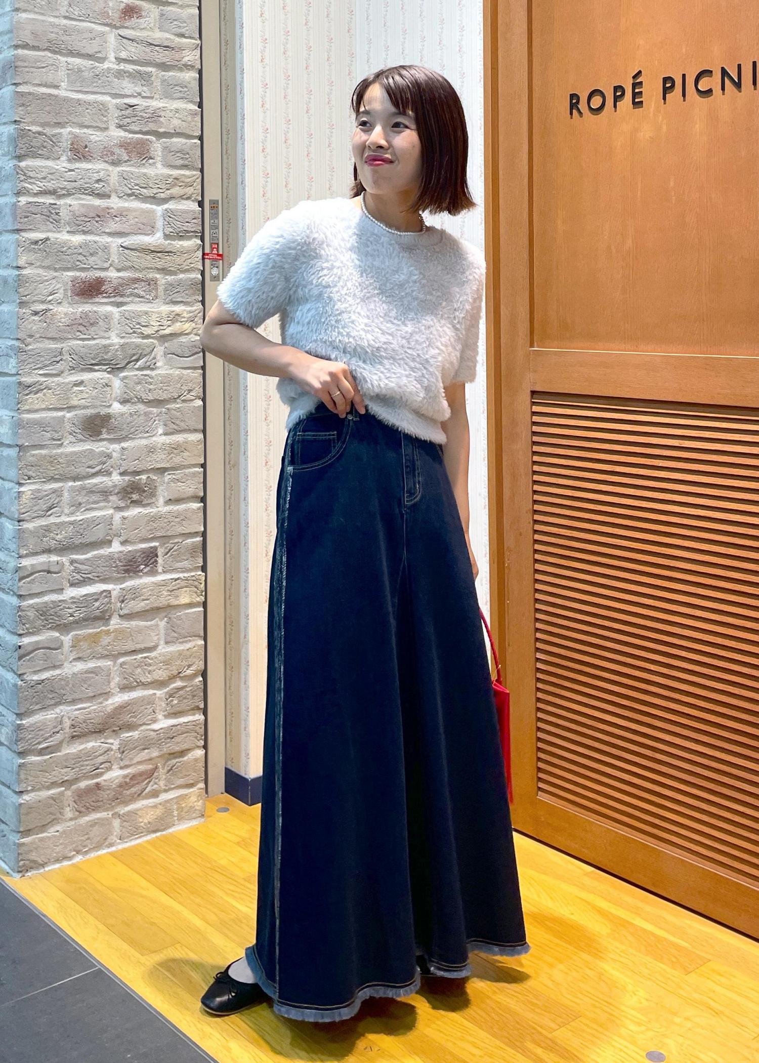 ふわふわの質感が秋冬のムードにぴったりのフェザーニットにデニムスカートを合わせた、甘めカジュアルコーデです!