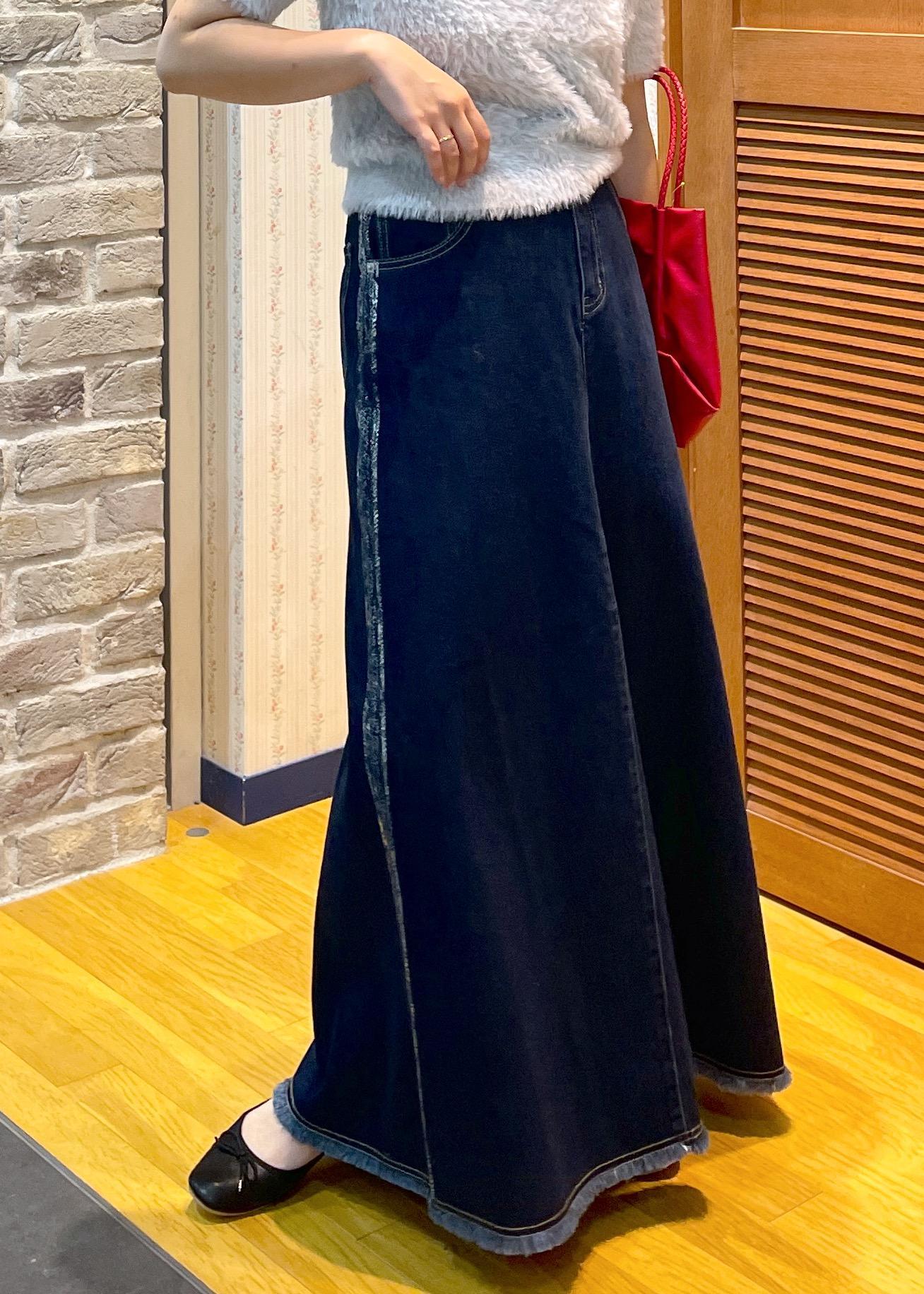緩やかなAラインに広がるデニムスカートです。生地は柔らかく履き心地も良かったです。ウエストは38サイズでゆったりめで骨盤で履く感じでした。着丈はフラットシューズでも擦らない長さです。
