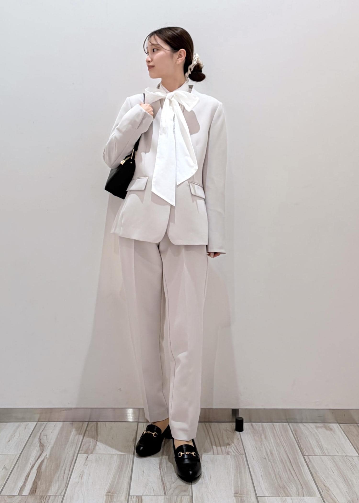 くるぶしが見える着丈です。ストレッチが効いているので、窮屈感がなく履き心地抜群です!センターピンタックが入っているので、脚がスラっと綺麗に見えます◎
