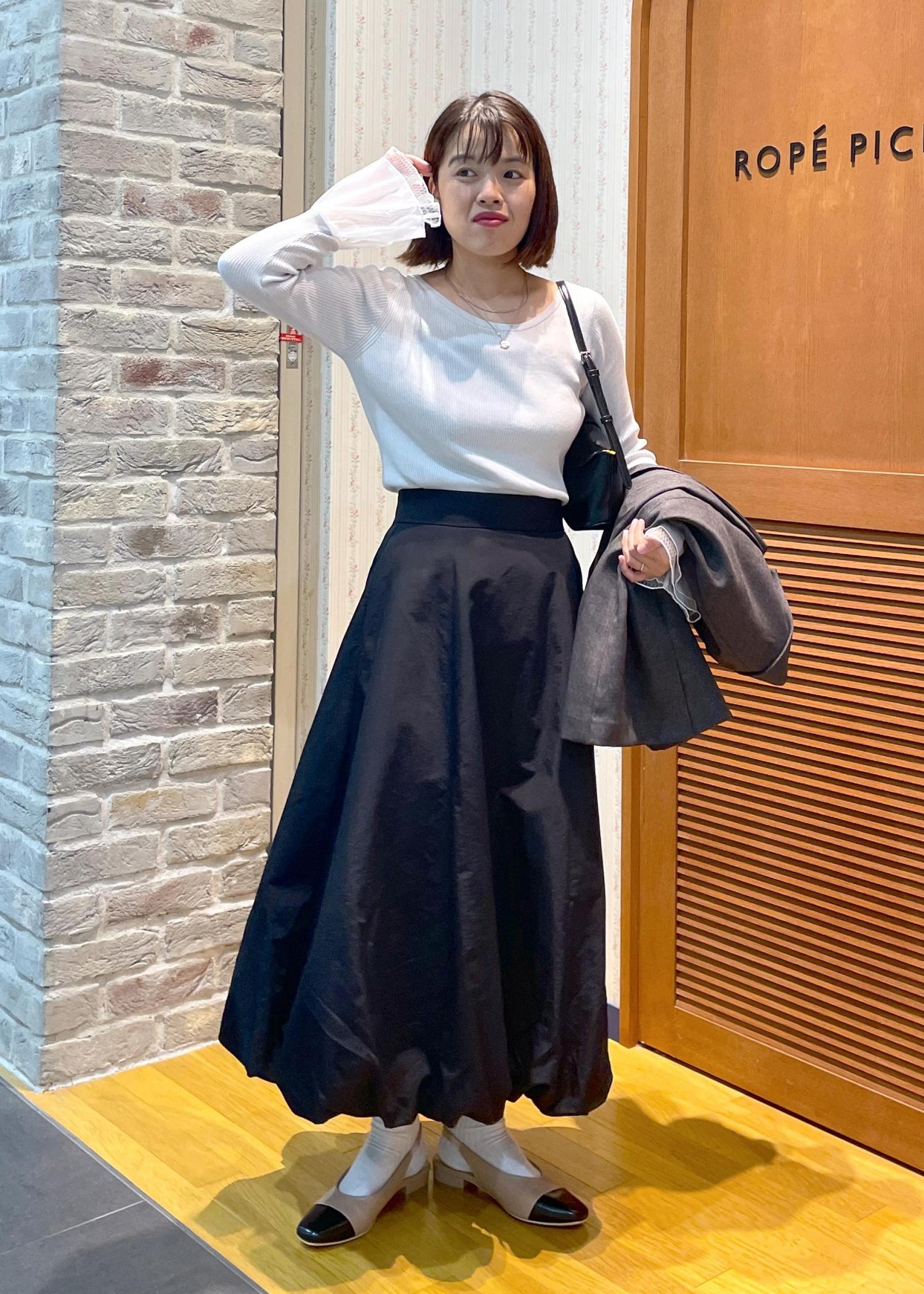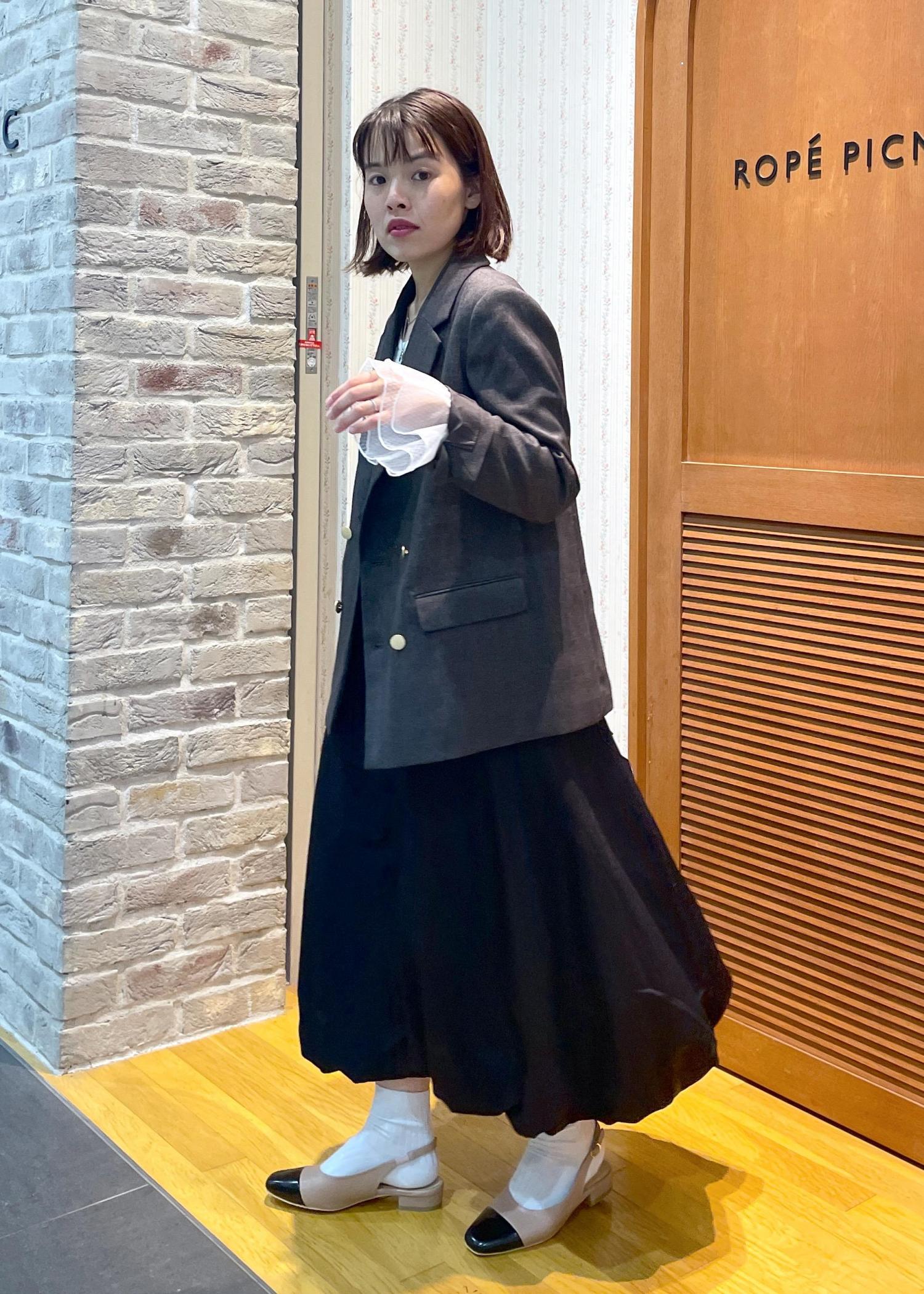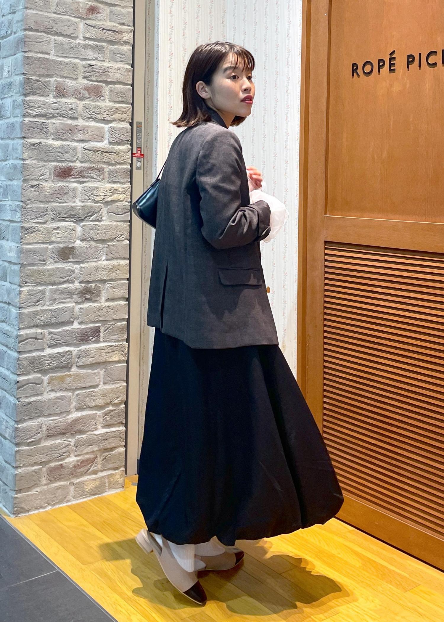 ボリューム感のあるバルーンスカートにジャケットを合わせたきちんと感ある通勤スタイルです!