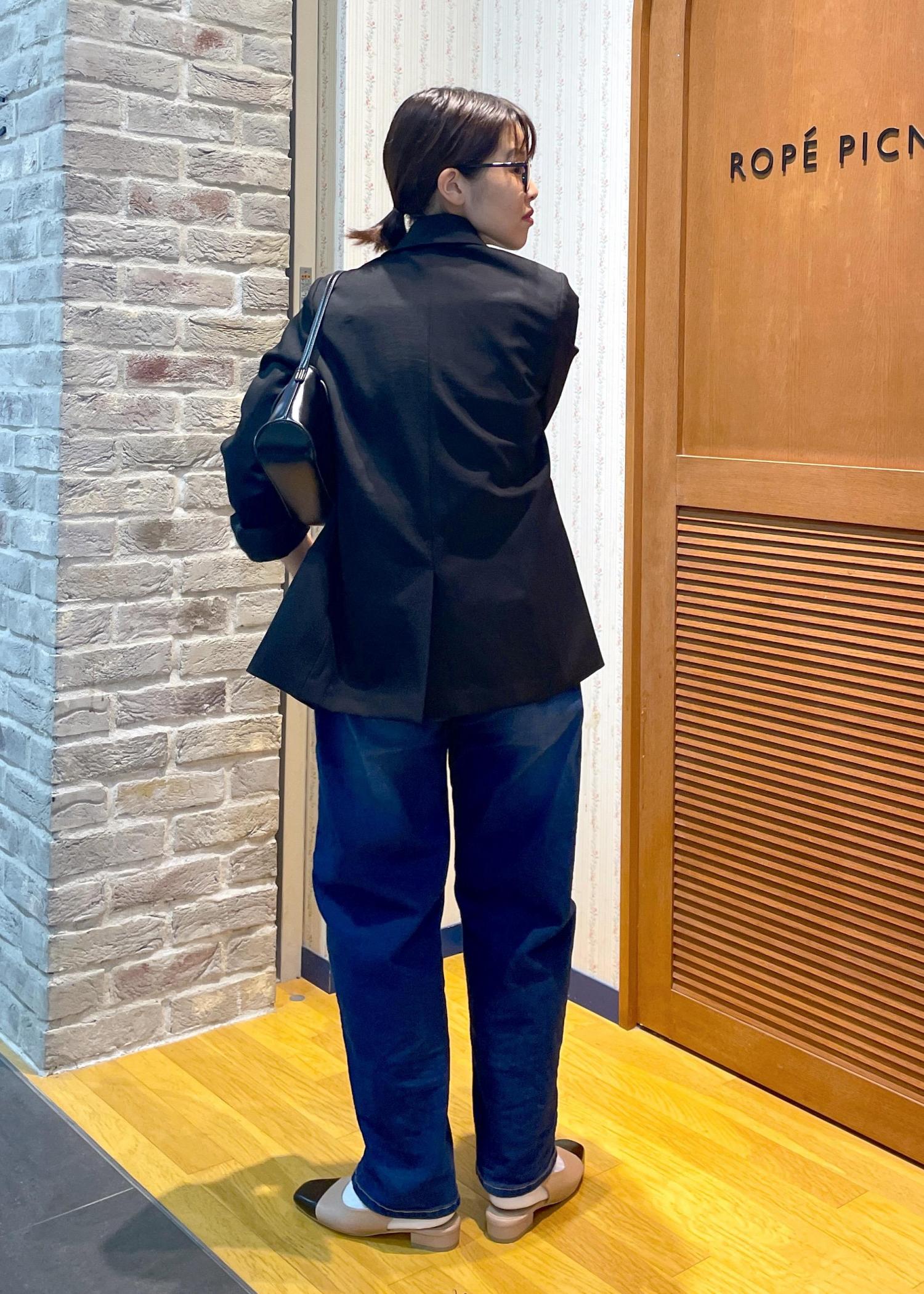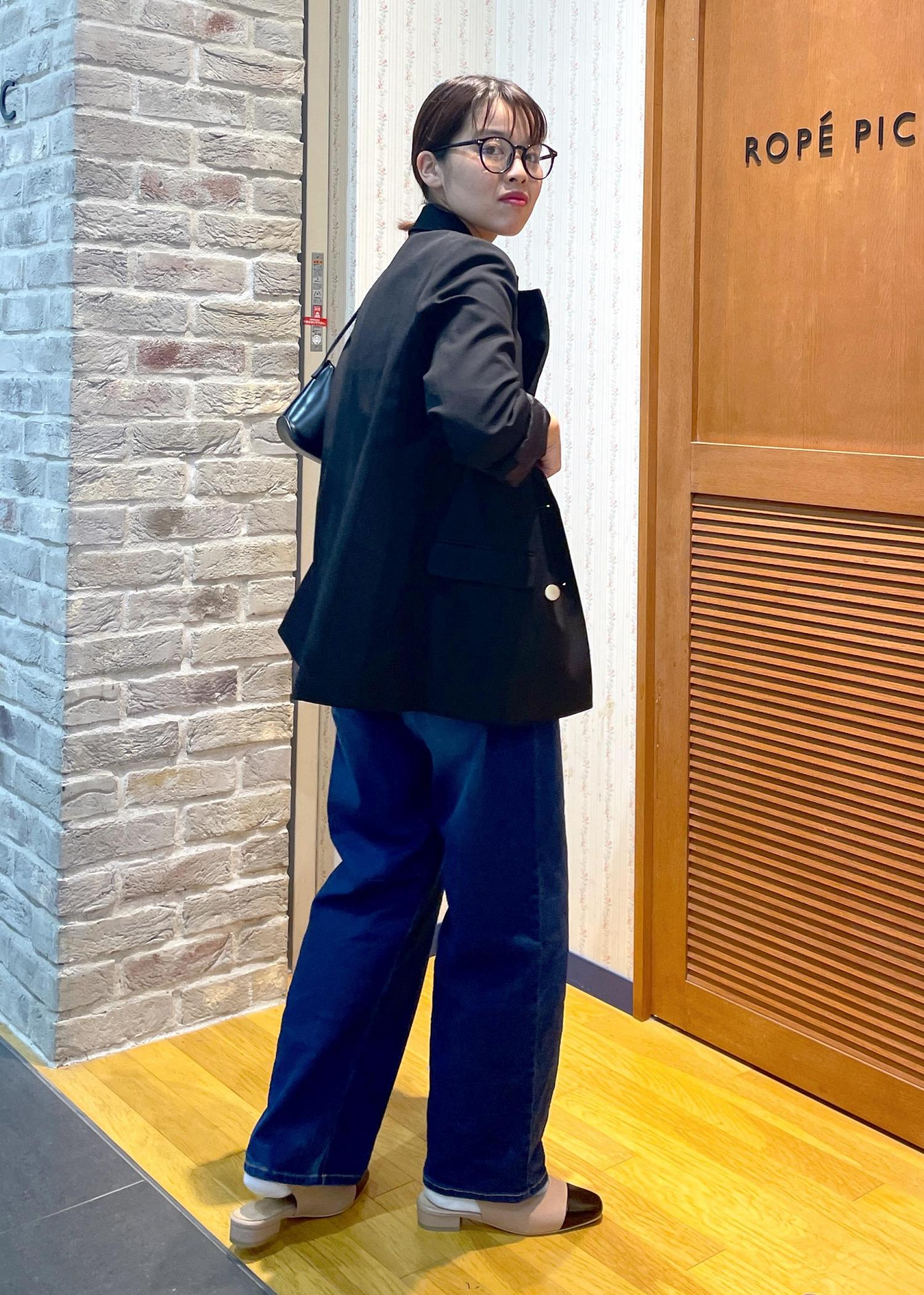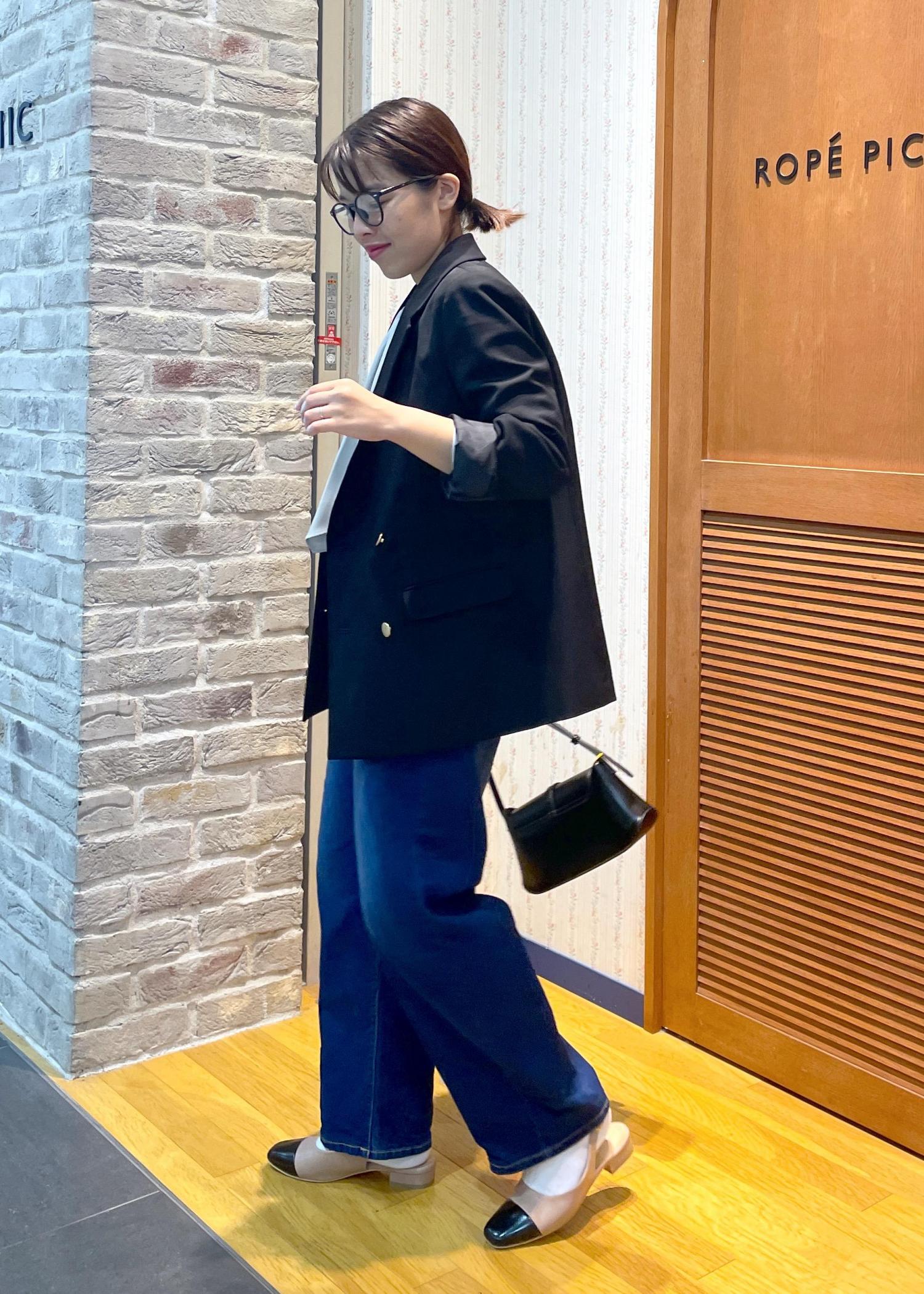 少し甘めなパルテル調カラーのブラウスですが、ブラックや濃紺の濃いめカラーを合わせることで、メリハリがあるクールなスタイルでまとめました◎