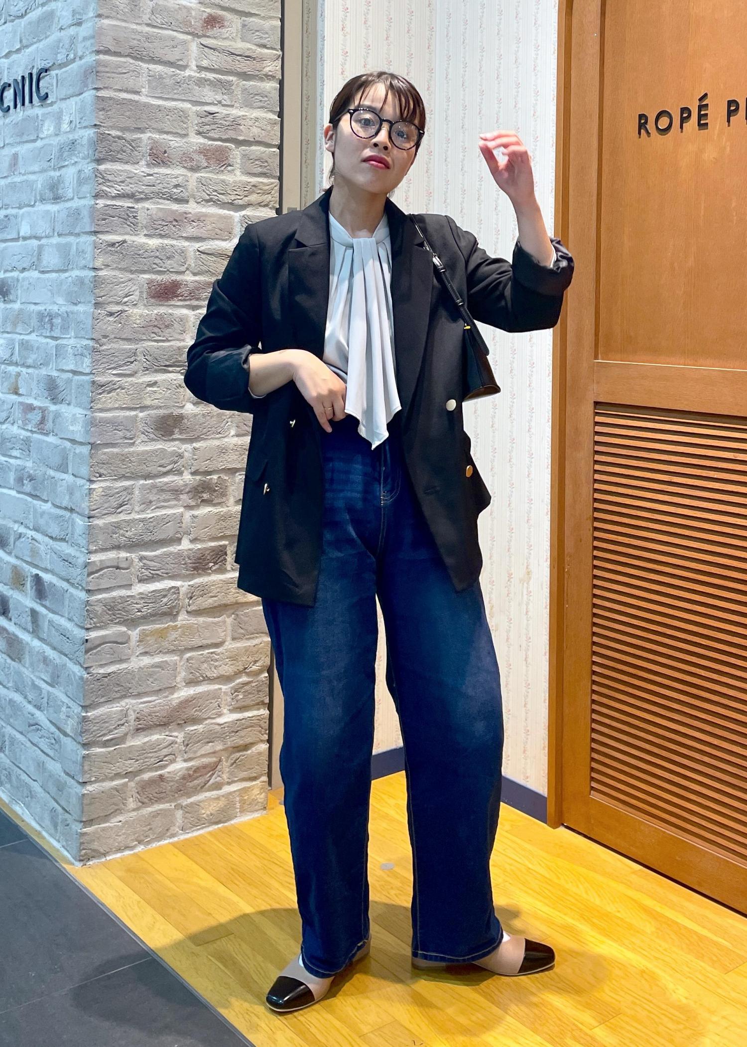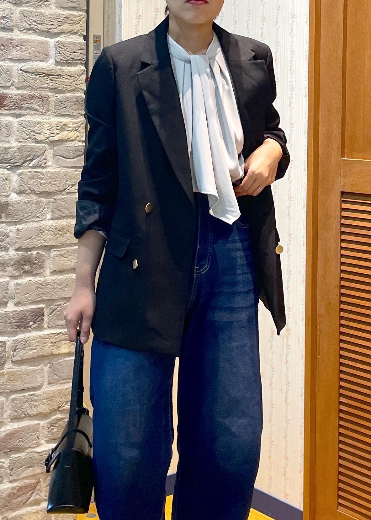 柔らかなライトグリーンが品良く爽やかに決まるボウタイブラウスに、オーバーサイズのジャケットとデニムを合わせて、かっこ良さもあるきれいめカジュアルコーデに!