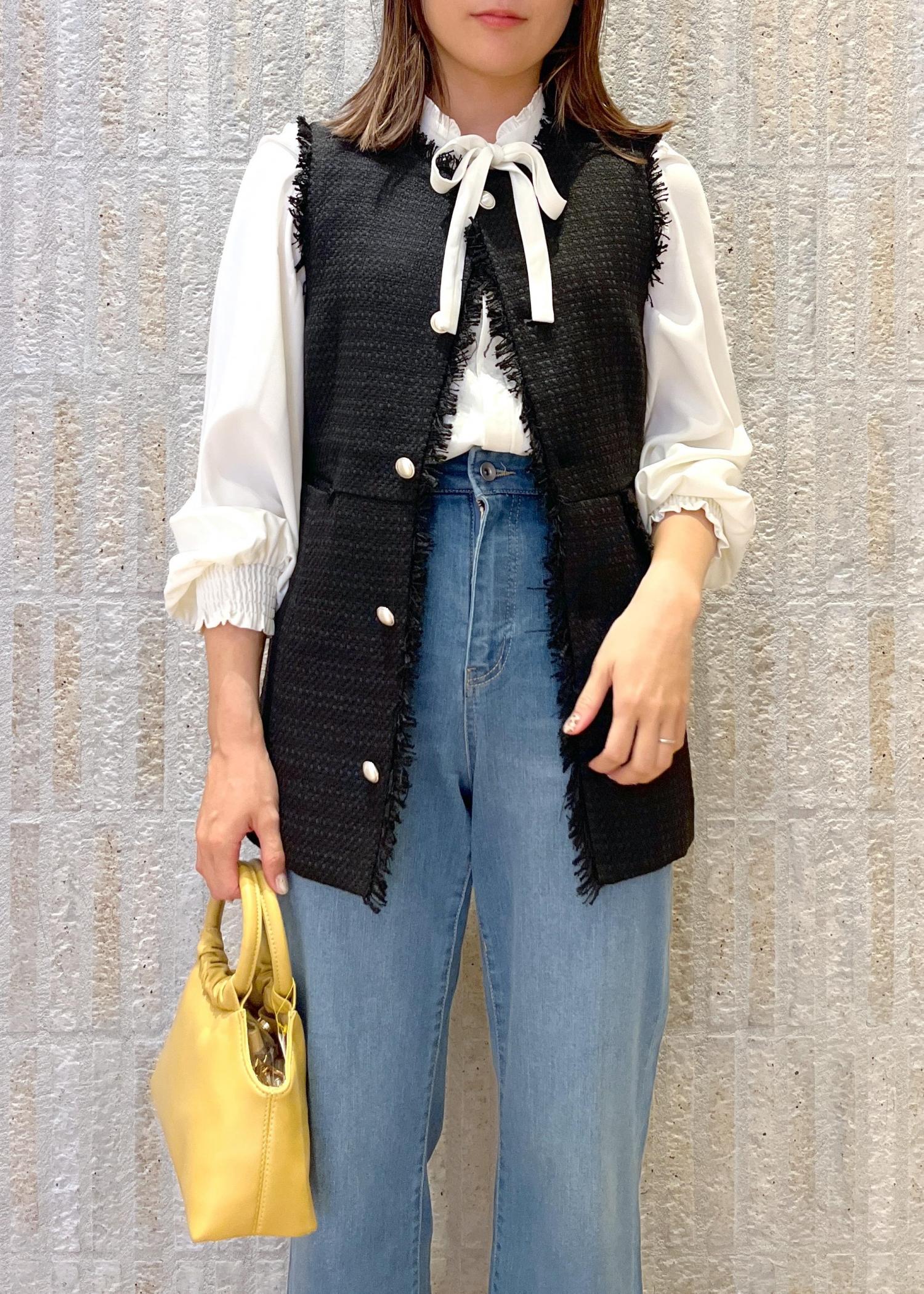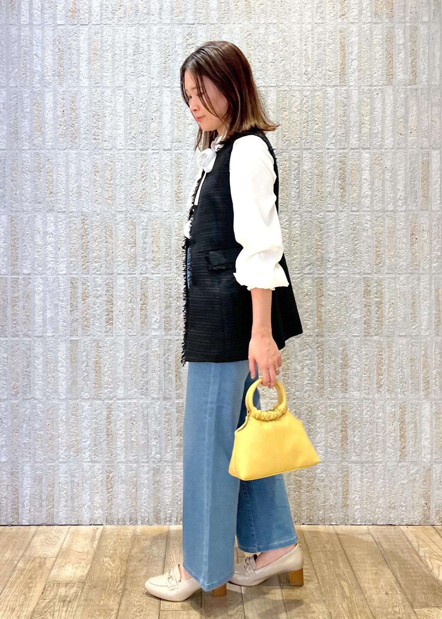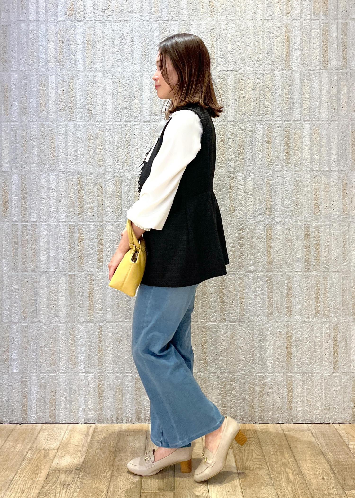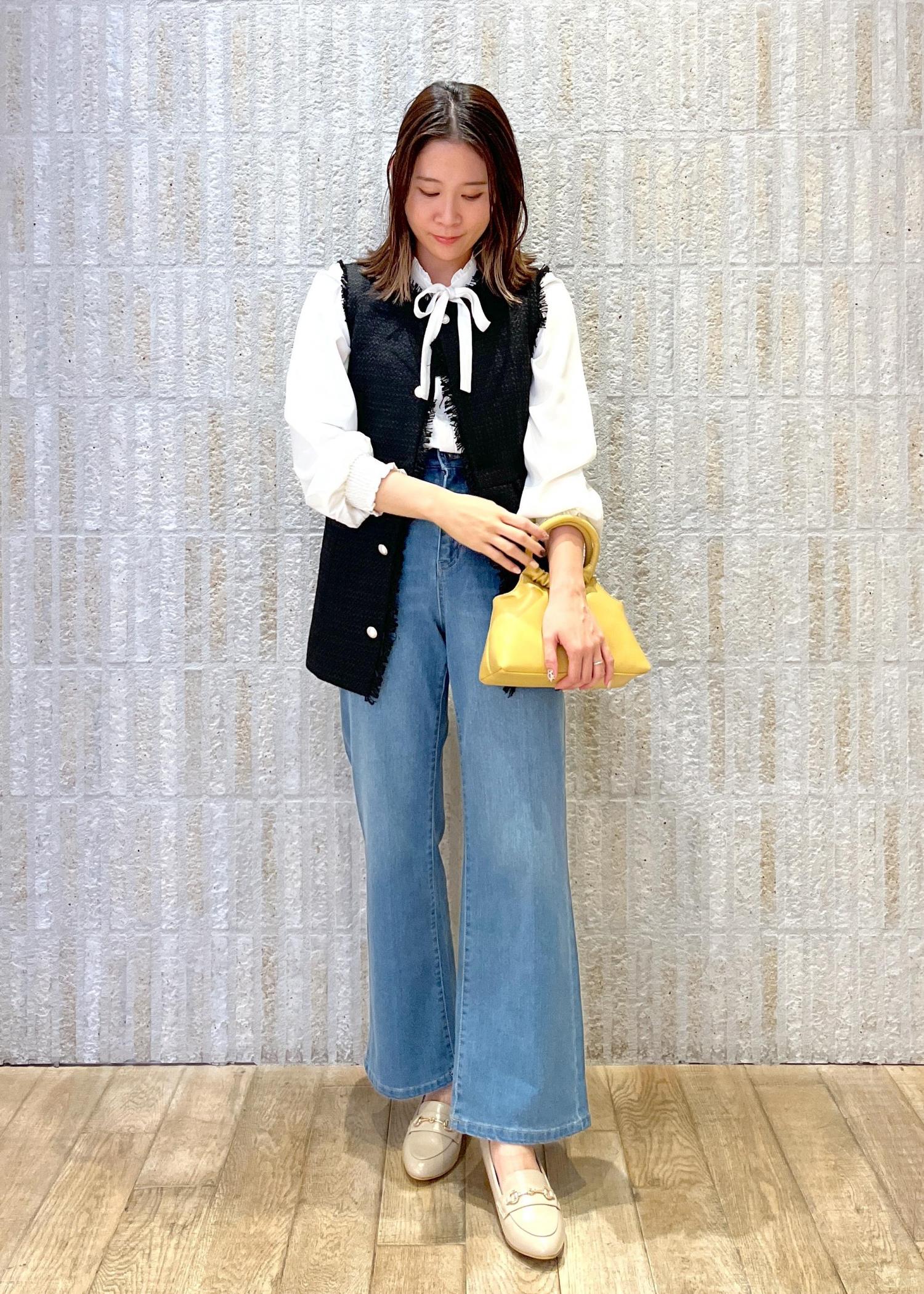 きれいめスタイルに合わせやすいツイードジレを、あえてデニムではずして普段使いもしやすいスタイリングにしました。