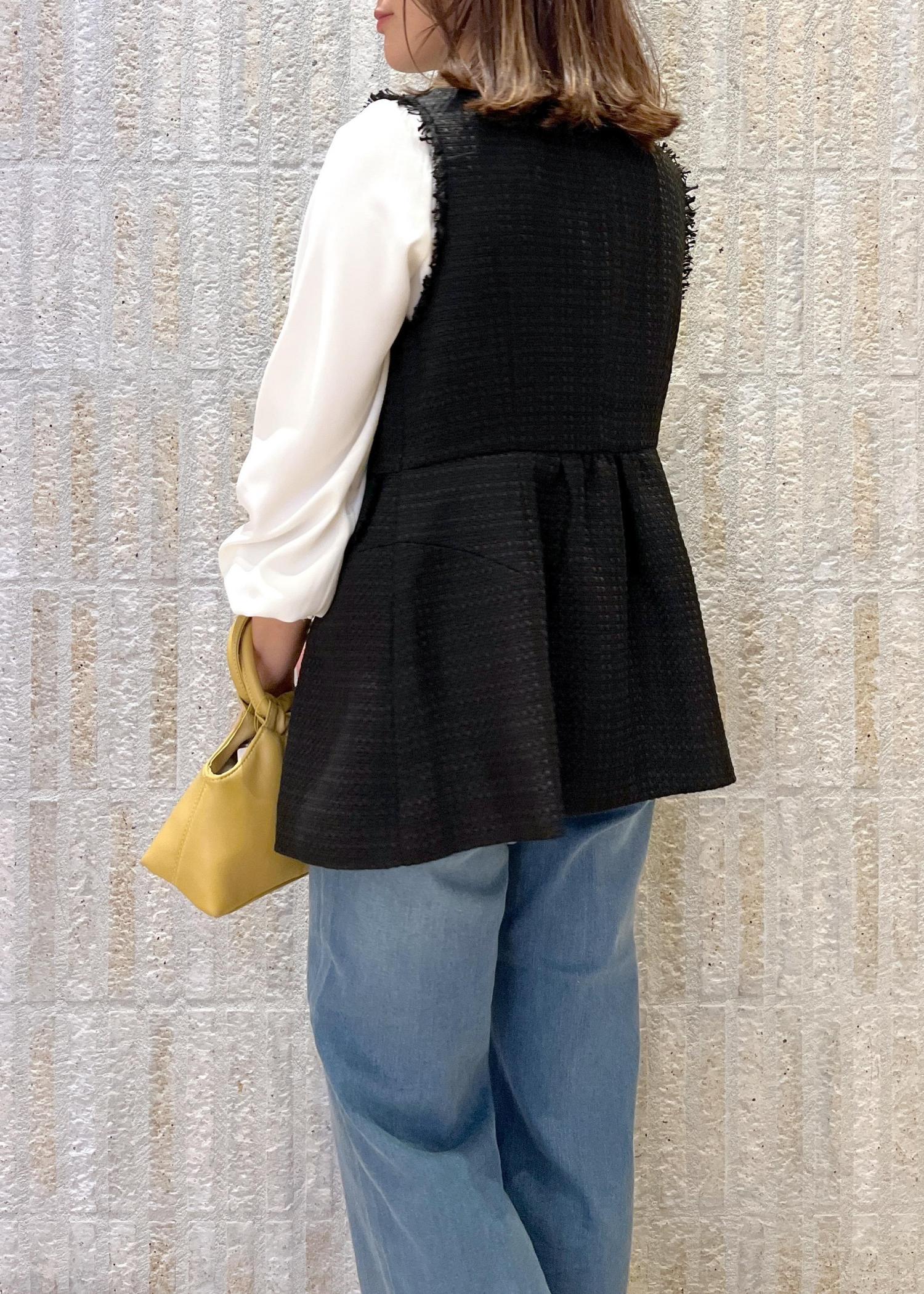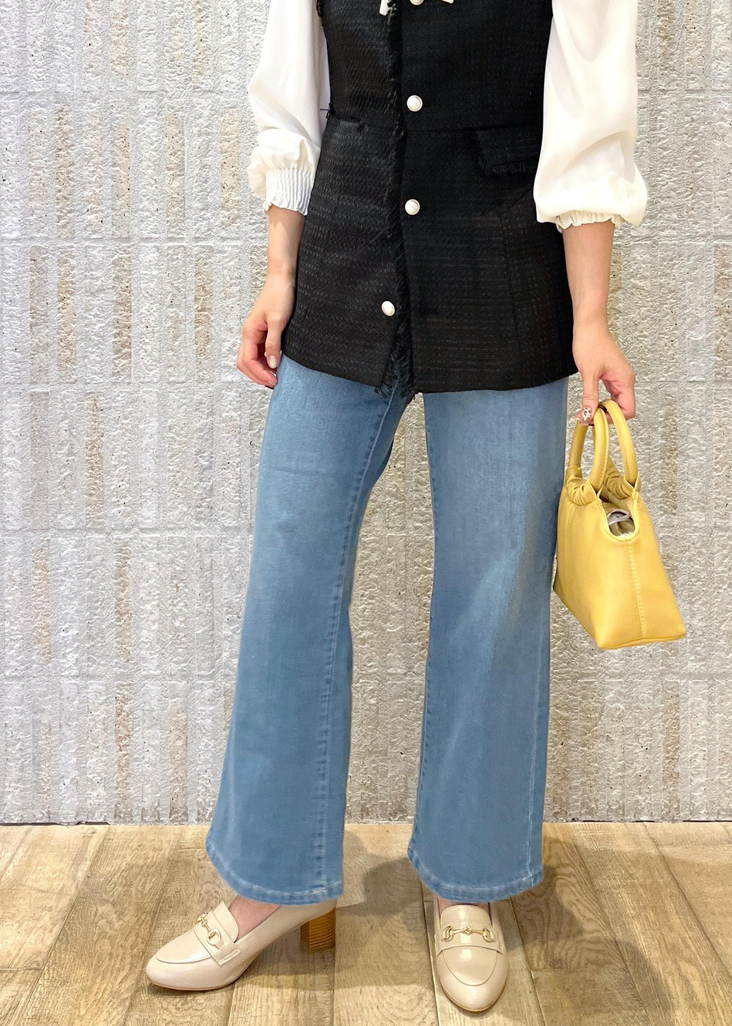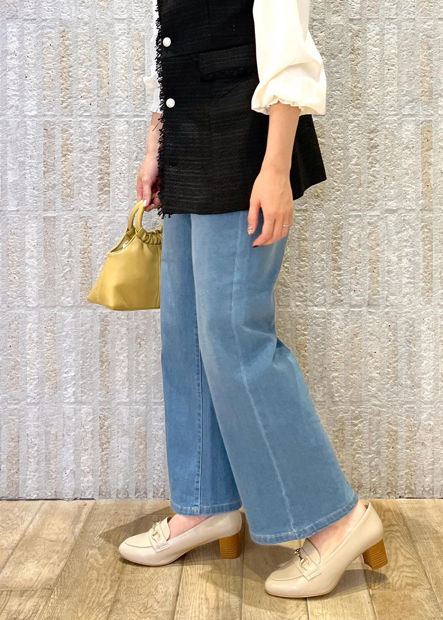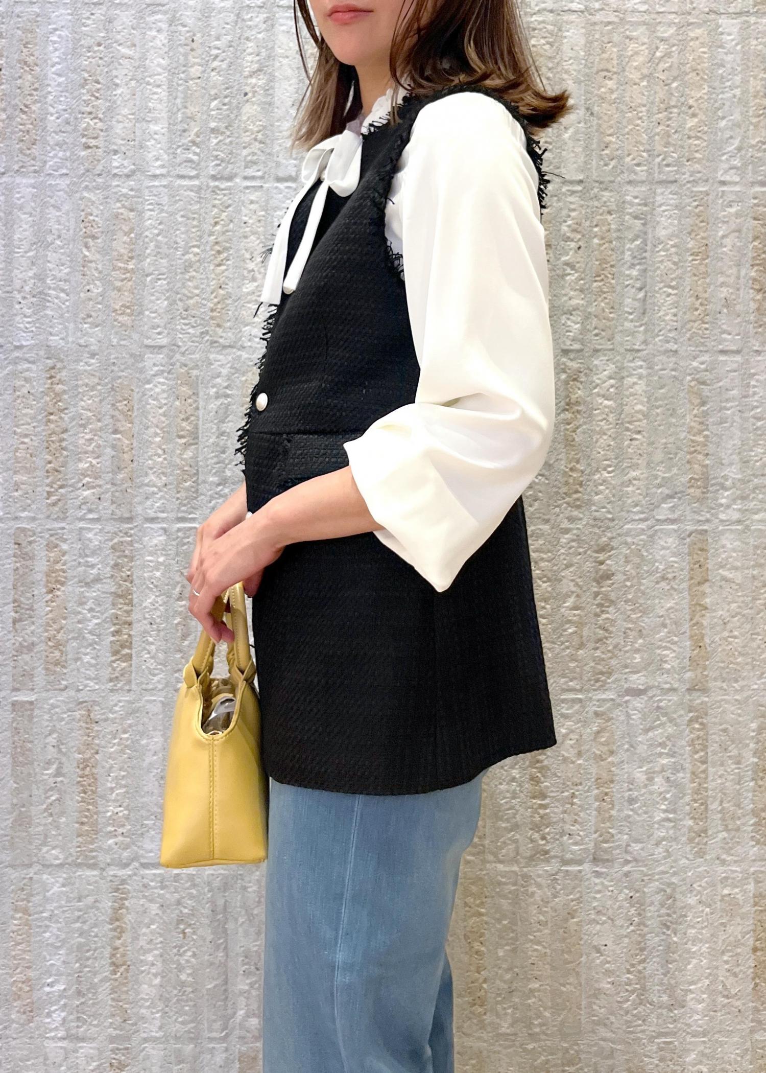 きれいめスタイルに合わせやすいツイードジレを、あえてデニムではずして普段使いもしやすいスタイリングにしました。