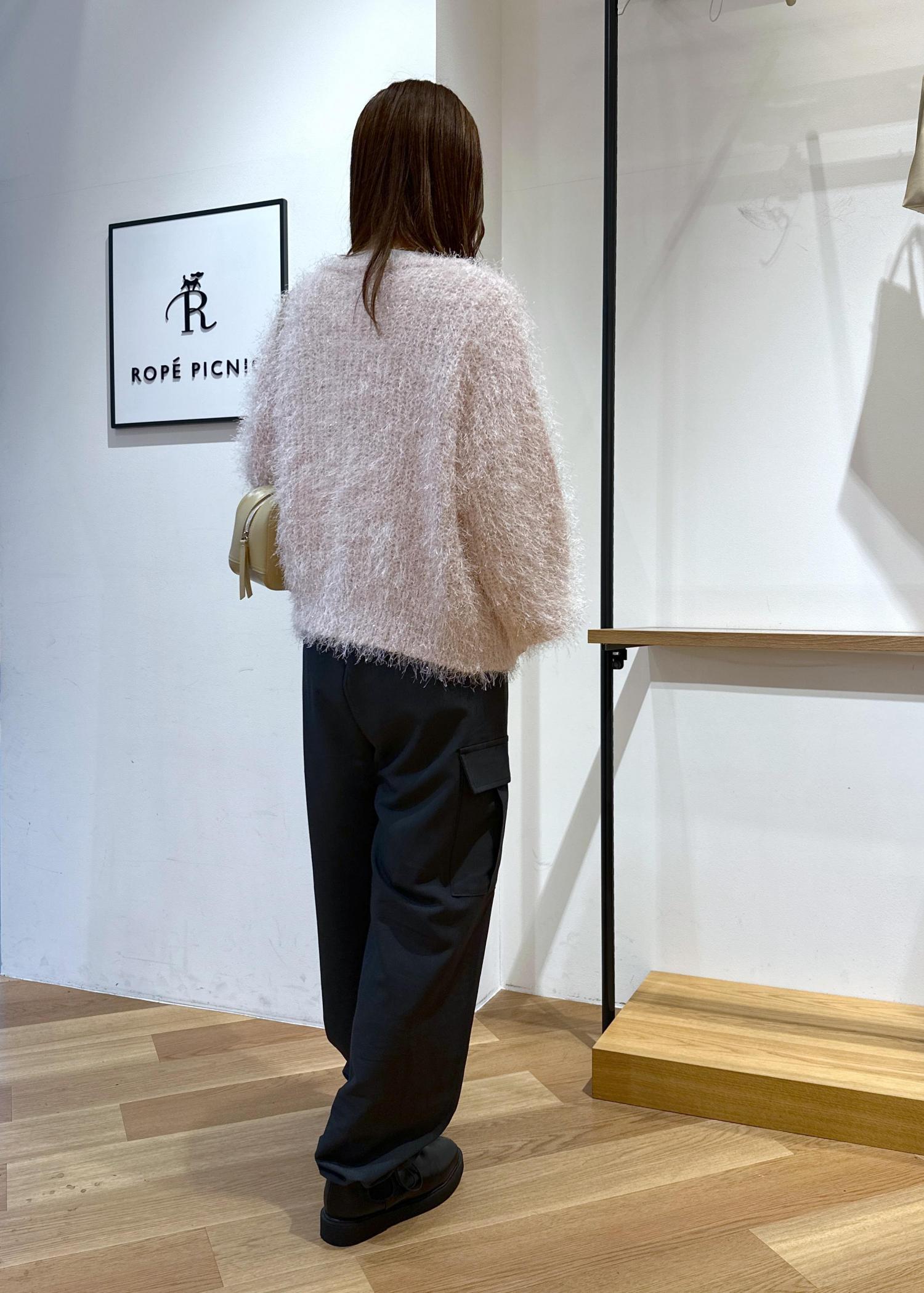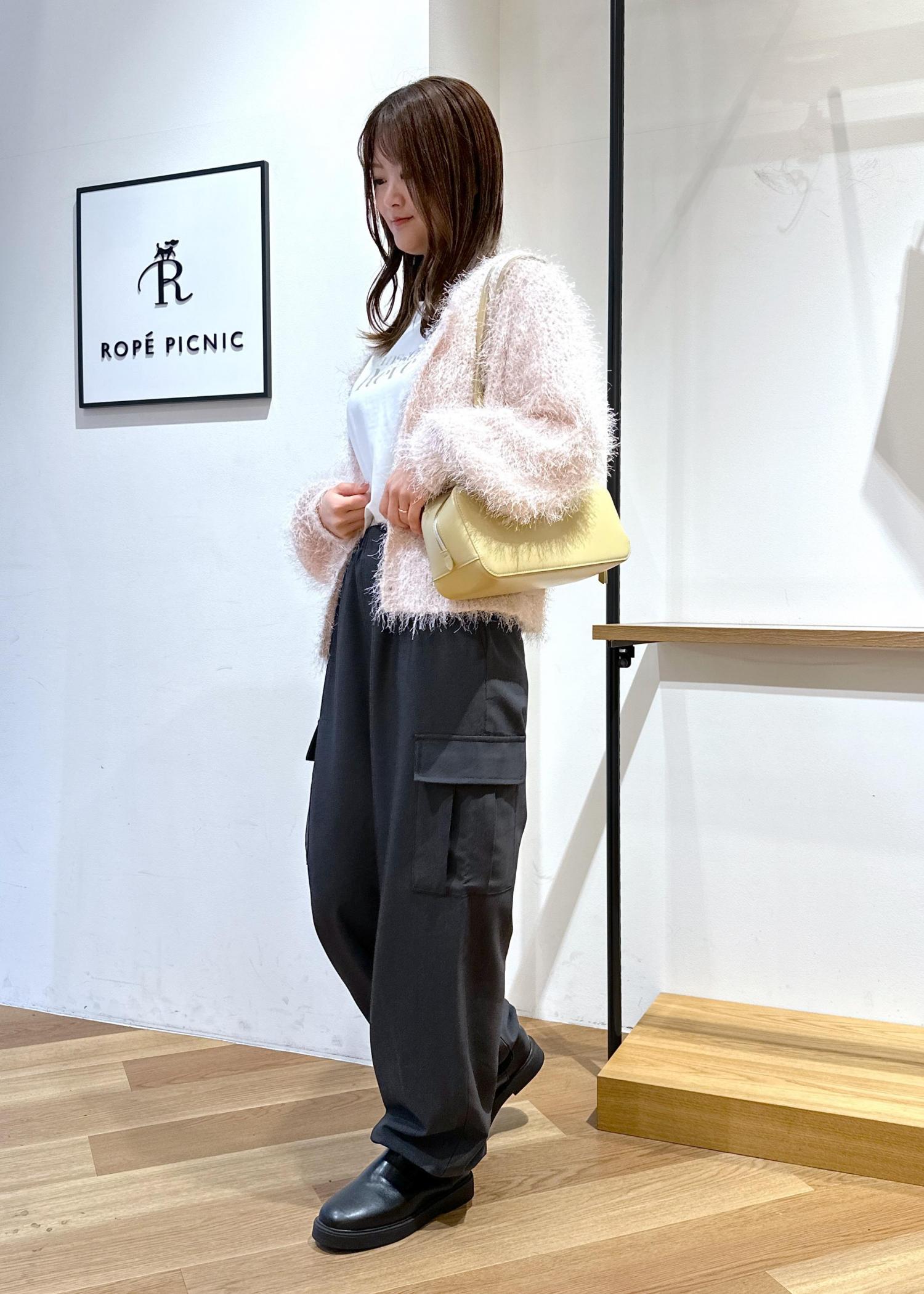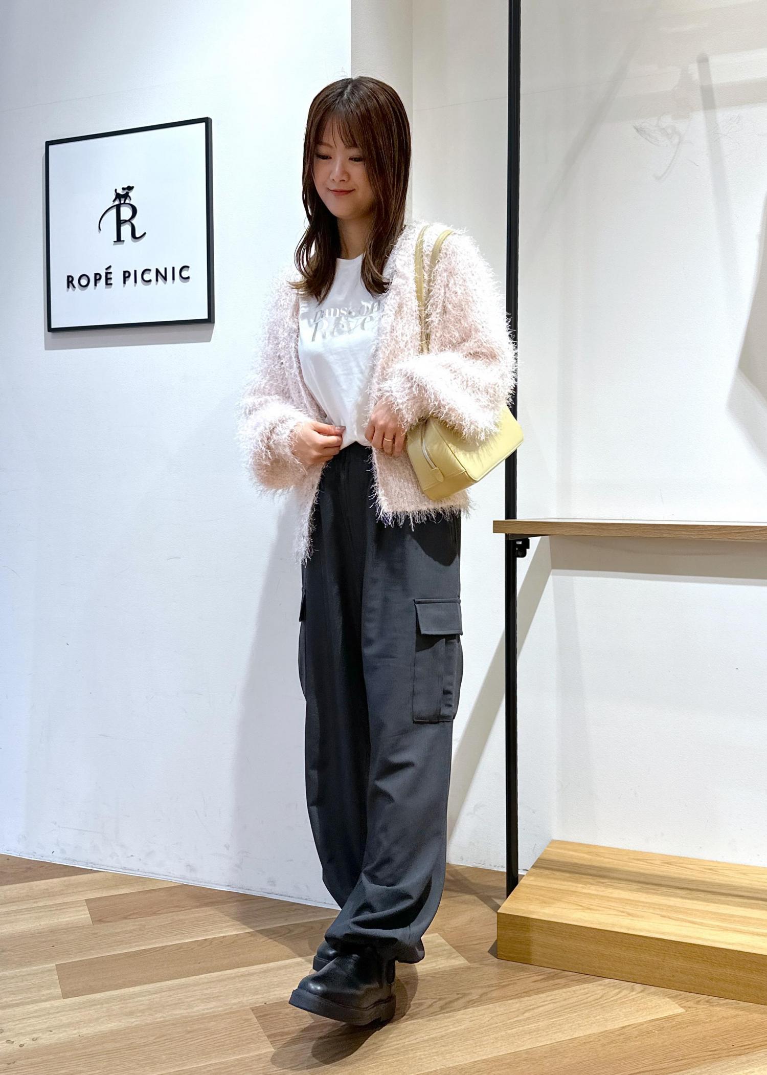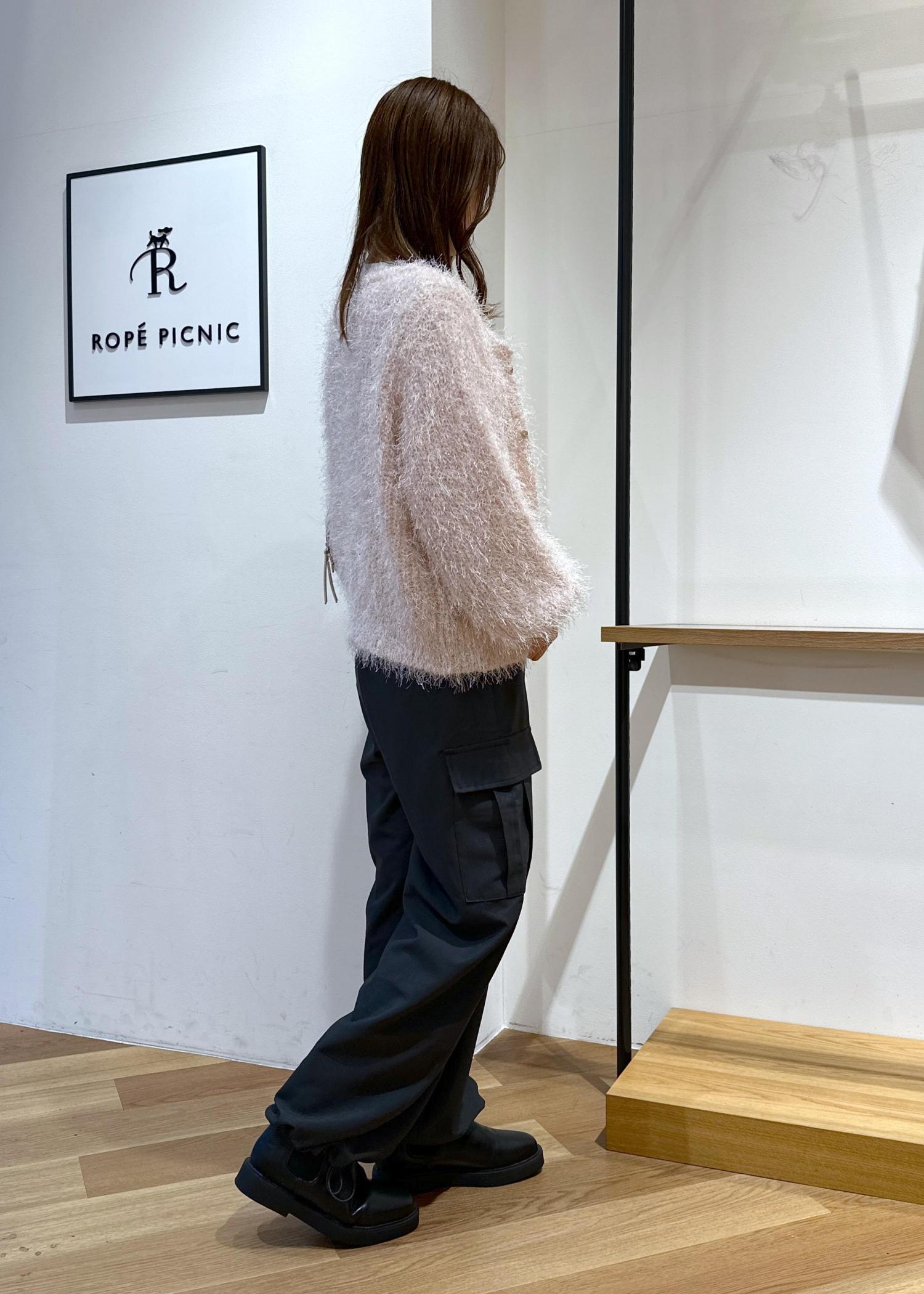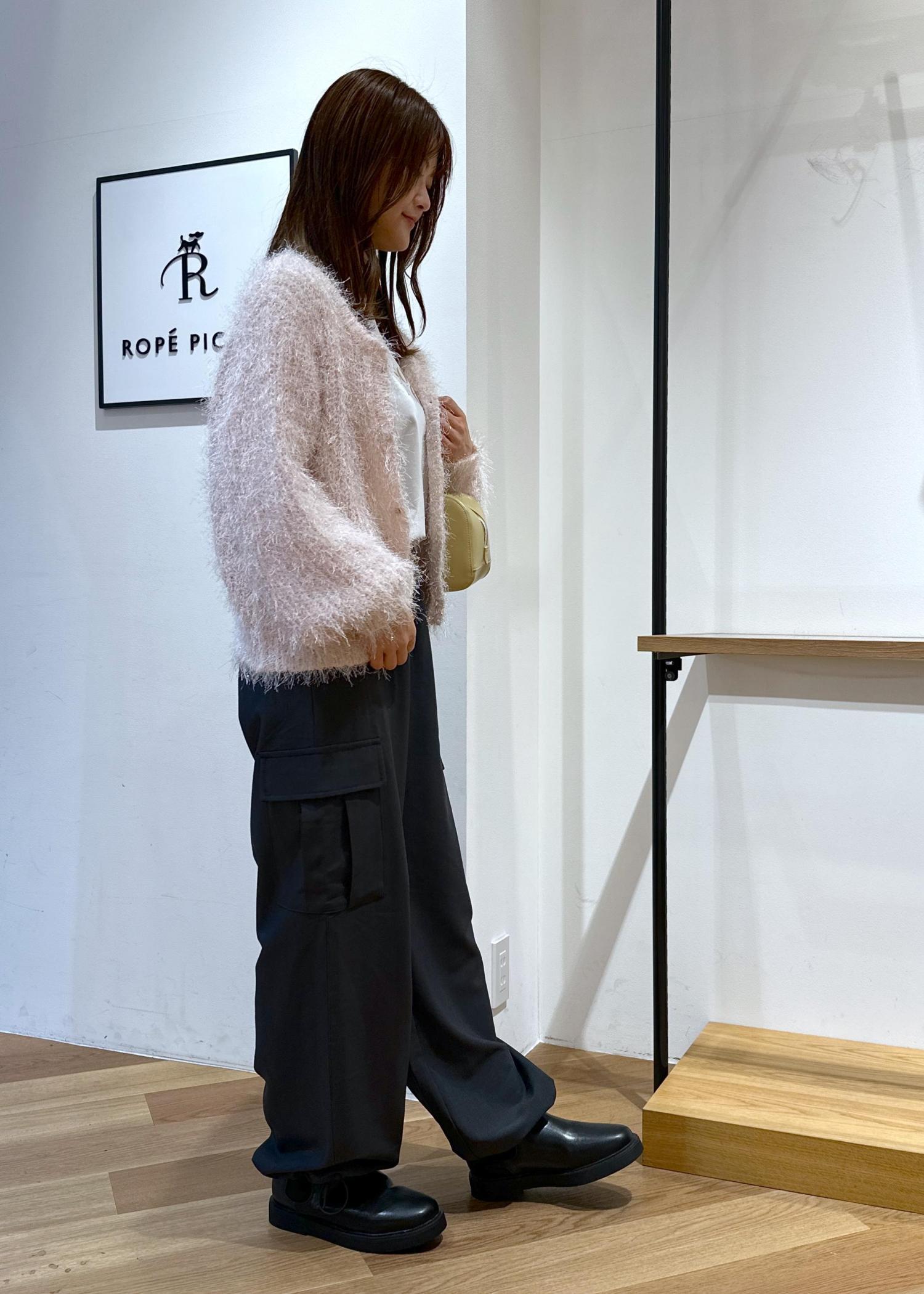 キラっとしたラメフェザーカーディガンにイージーカーゴパンツをあわせてトレンド感のあるスタイルにしてみました。