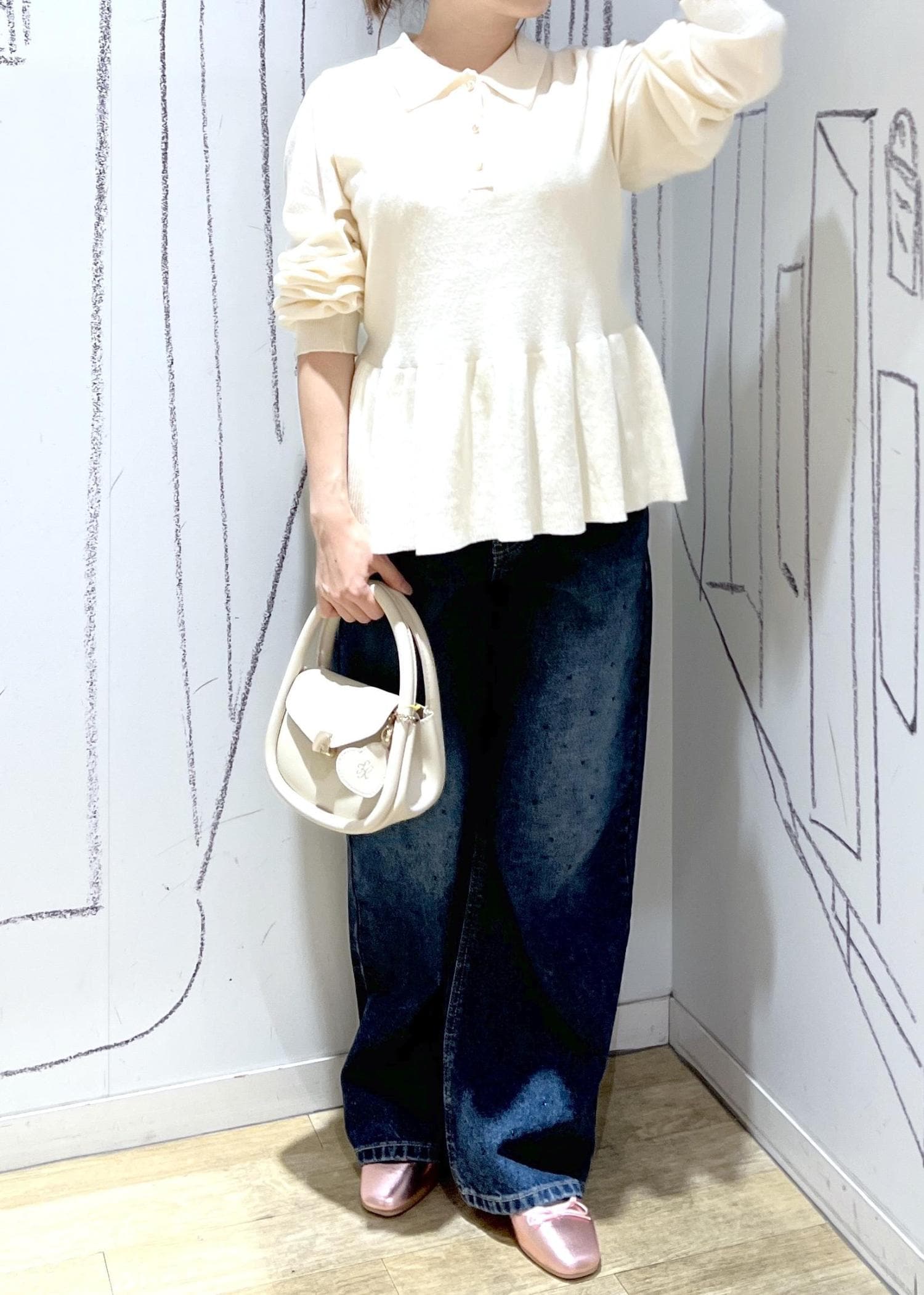 モノトーンでシンプルなので、ブルーのニットで差し色を入れてみました!