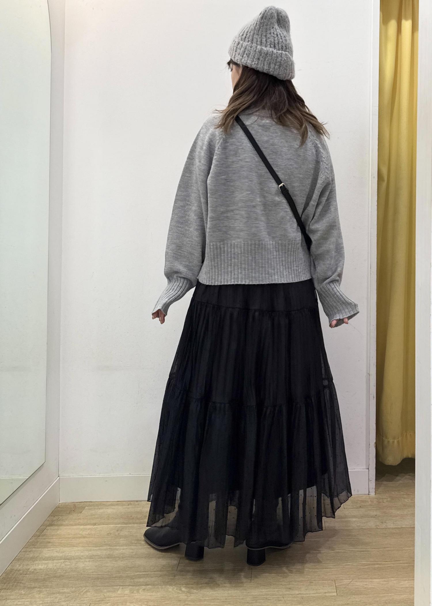 ニット帽とニットをグレーでまとめてブラックのスカートと小物でシックに!