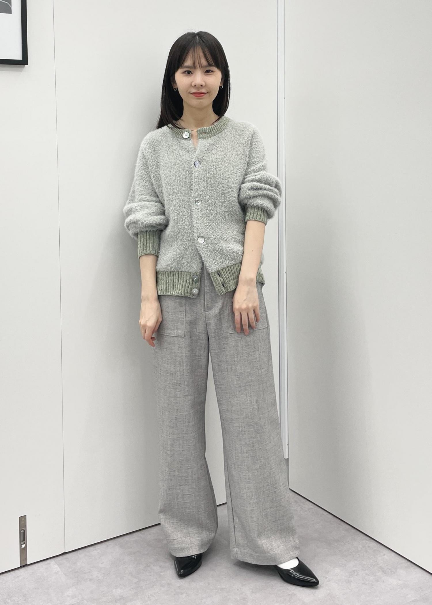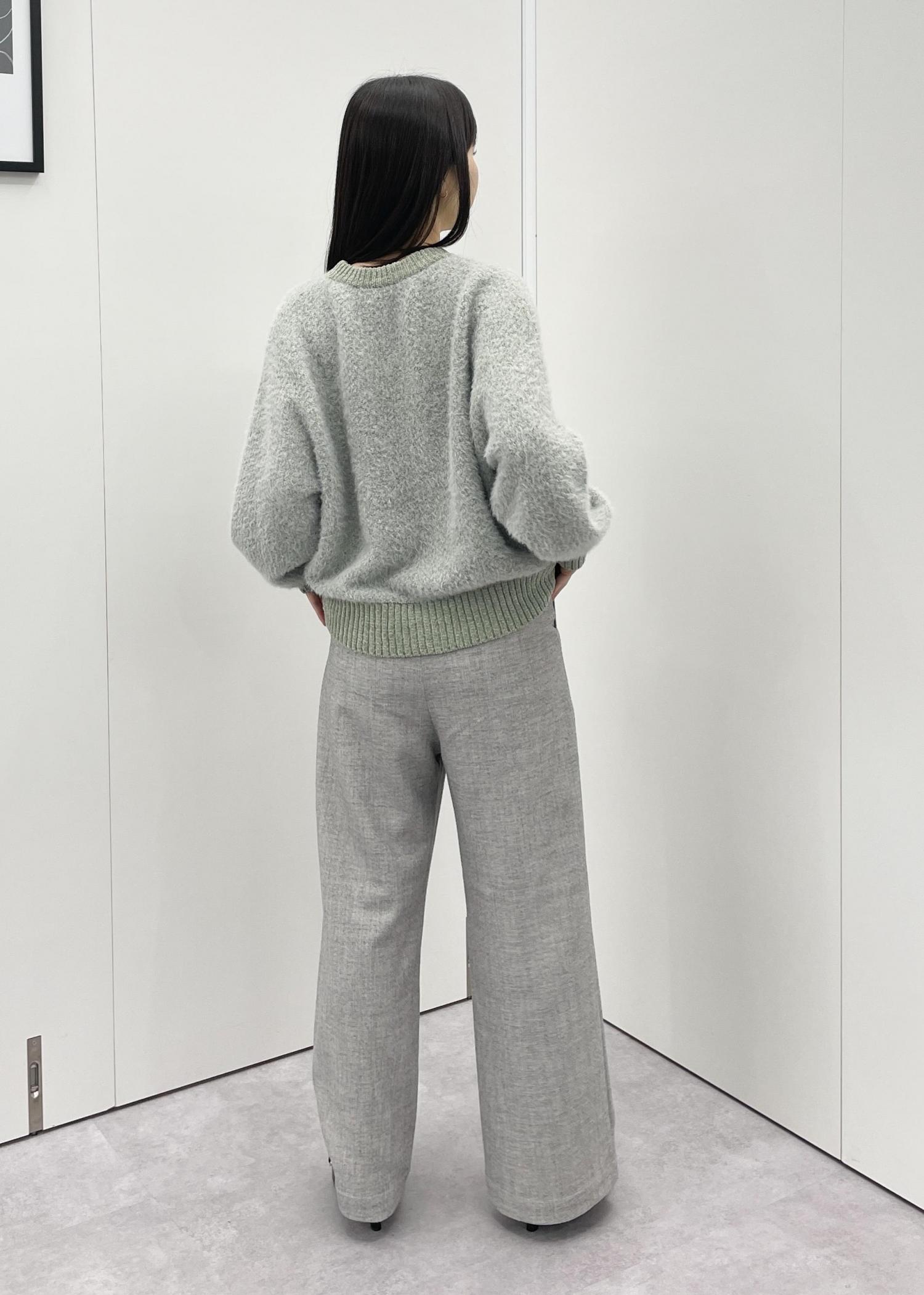 ブラックのロングアウターは重たく見えますが、コートインに薄いグリーンのラメニットとグレーのパンツを合わせてコートの中は明るいコーデに。