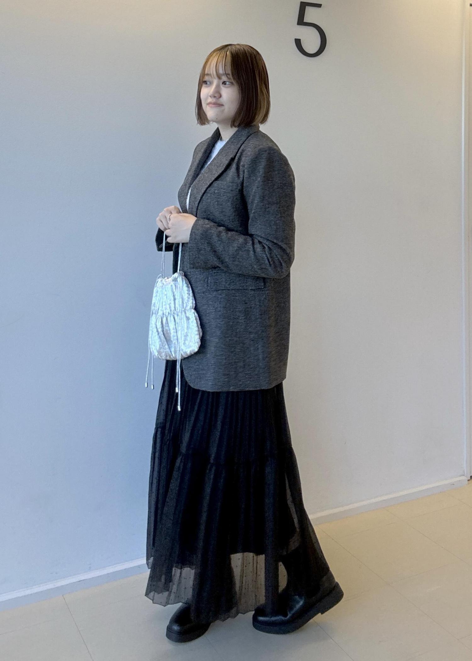 ライトブルーのニットにジャケットを合わせ、全体をブラックでまとめることで、大人っぽい綺麗みえなコーディネートにしました!メタリックシルバーのバッグがコーディネートのアクセントに◎