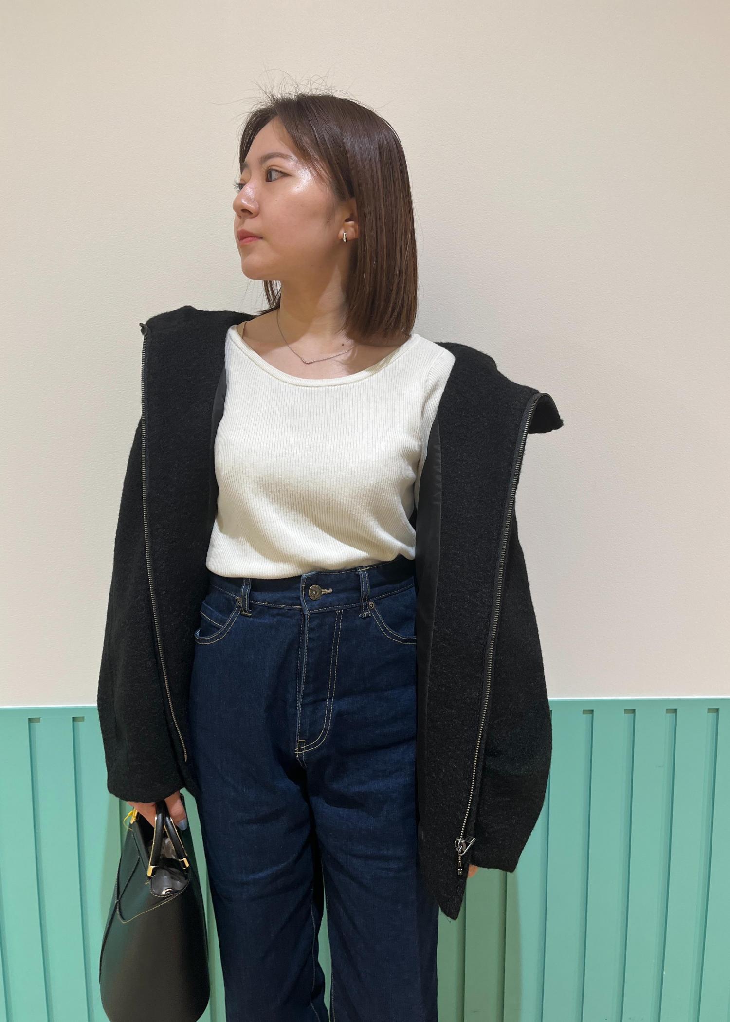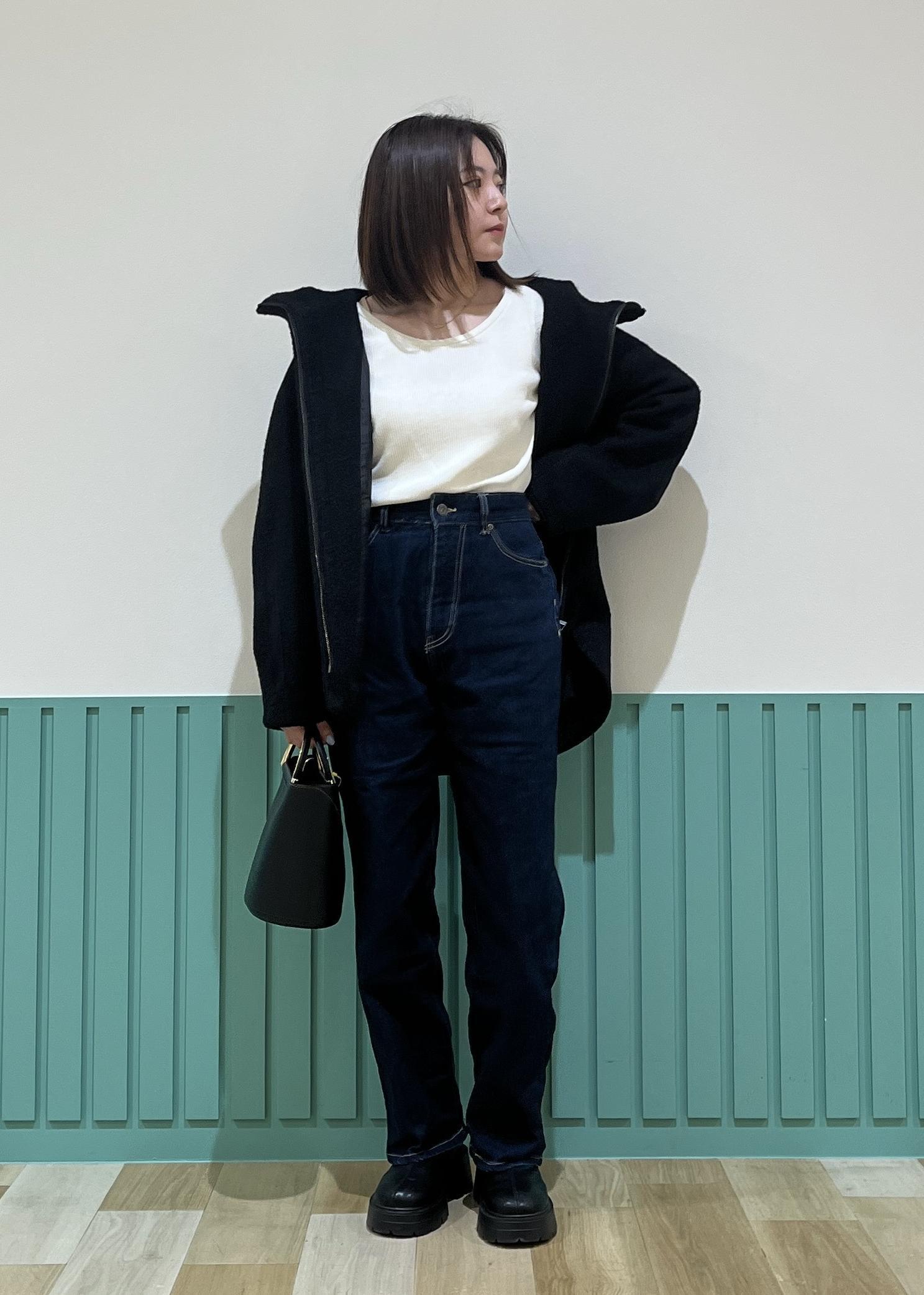 アウターは少し肩から外す事で低身長の私でもスッキリ見えるようにしました。
