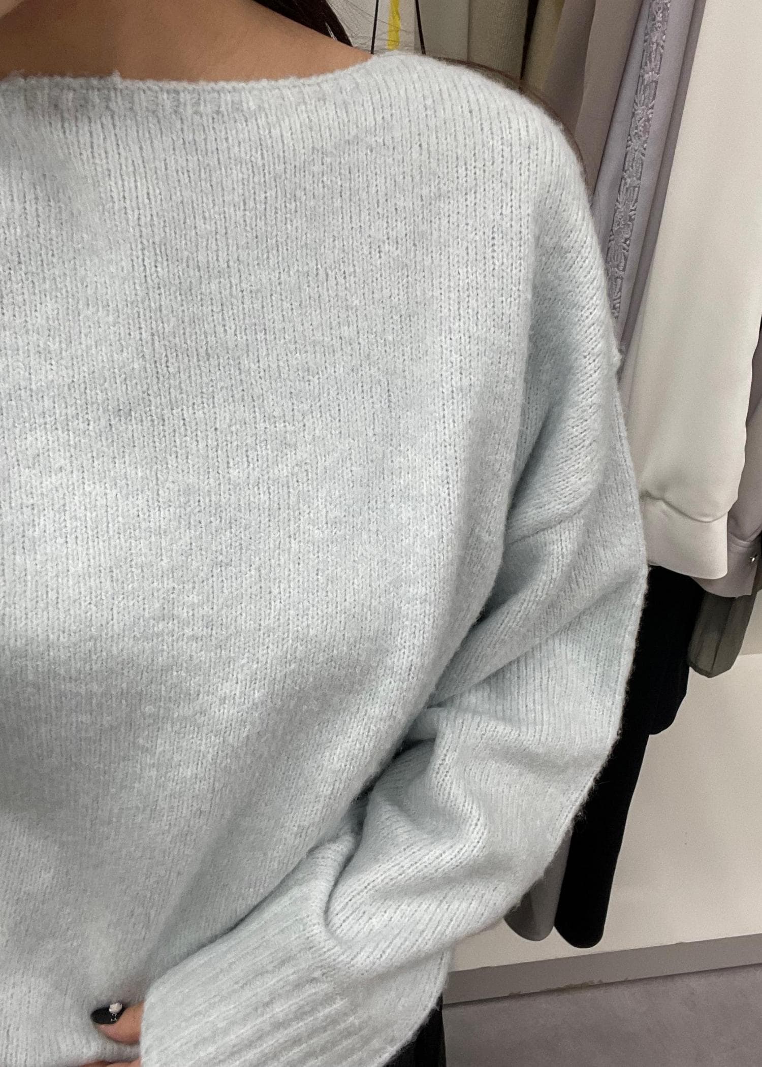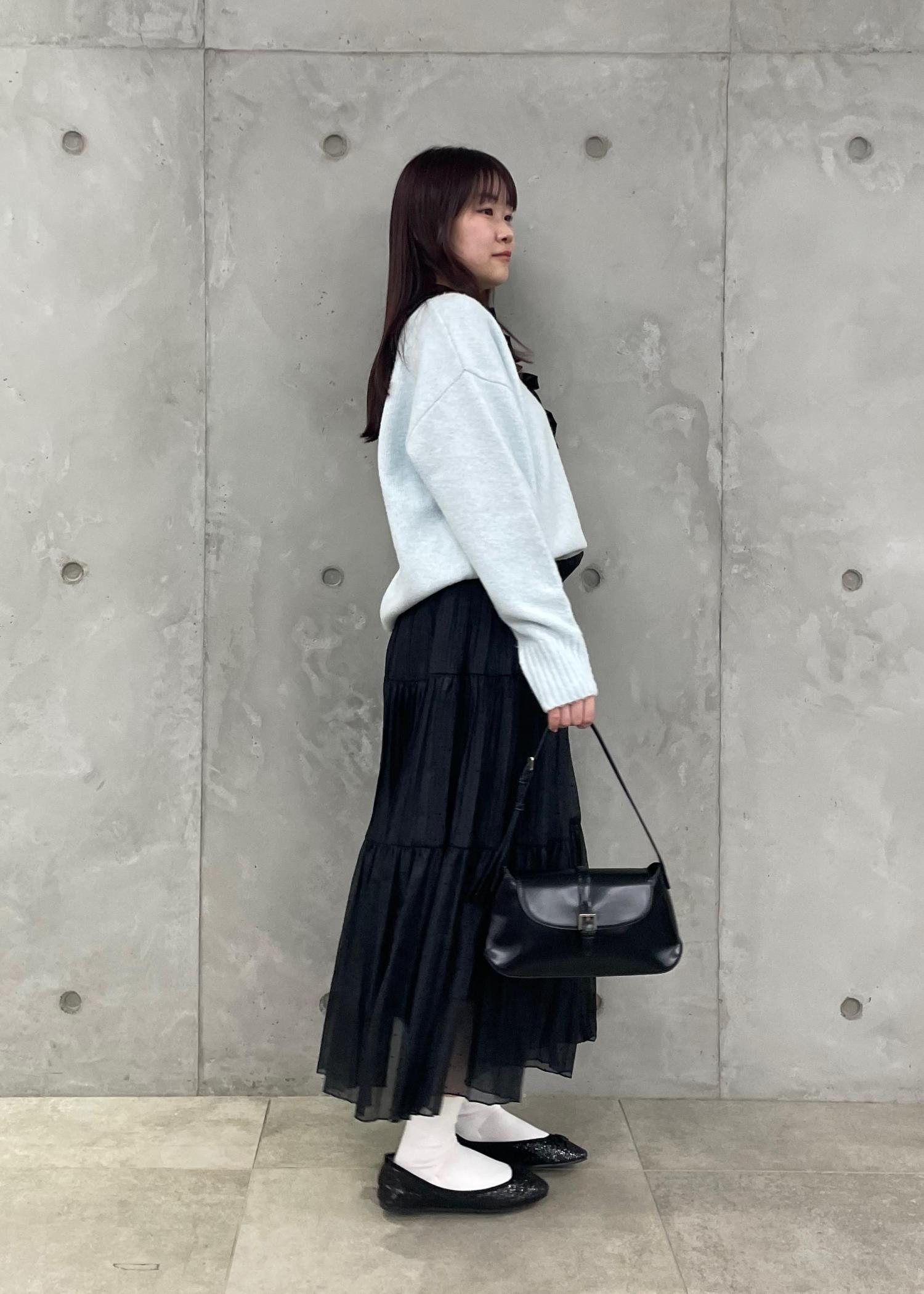スカイブルーのニットを主役にブラックアイテムを合わせ、冬の寒色コーデを組みました。