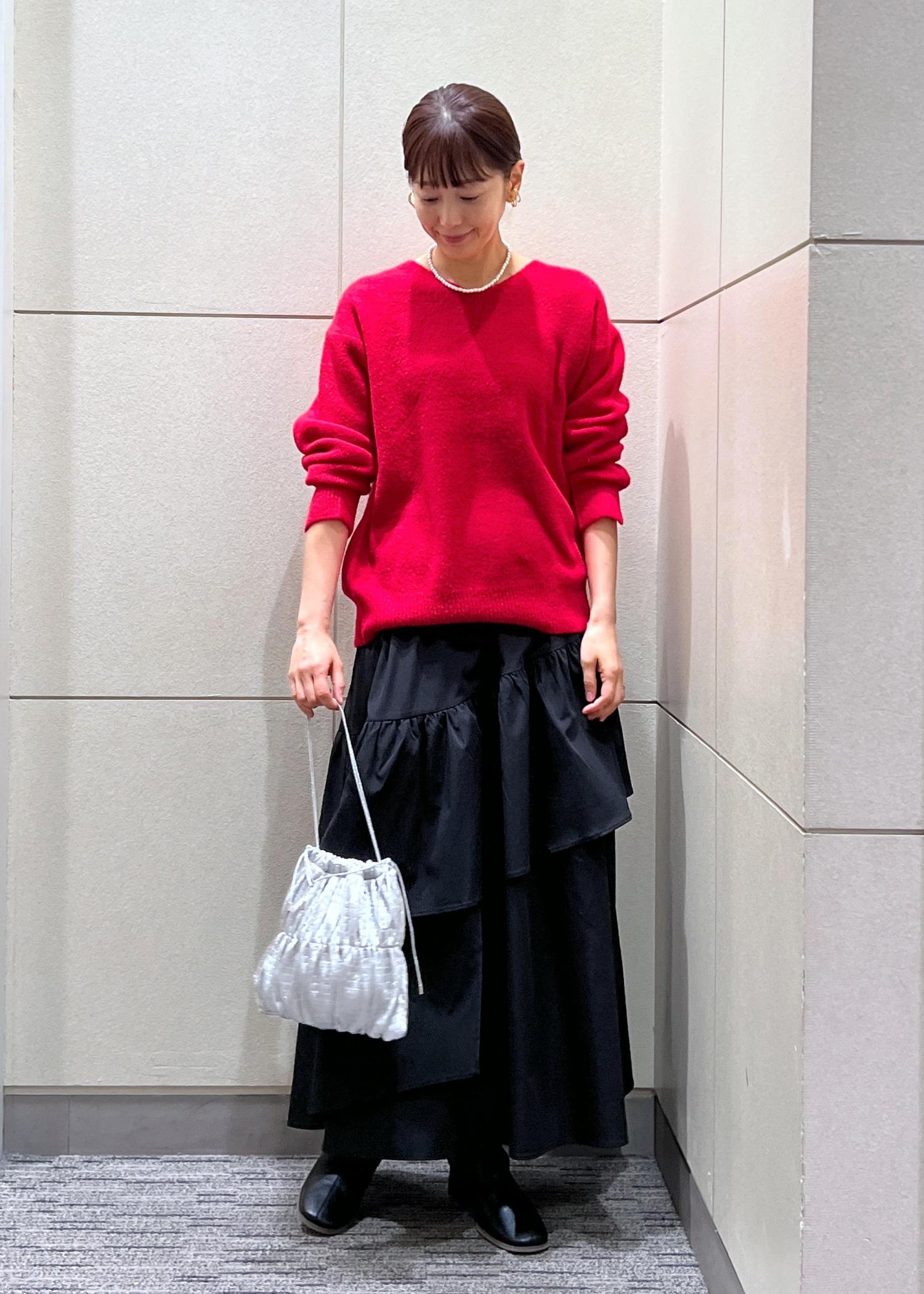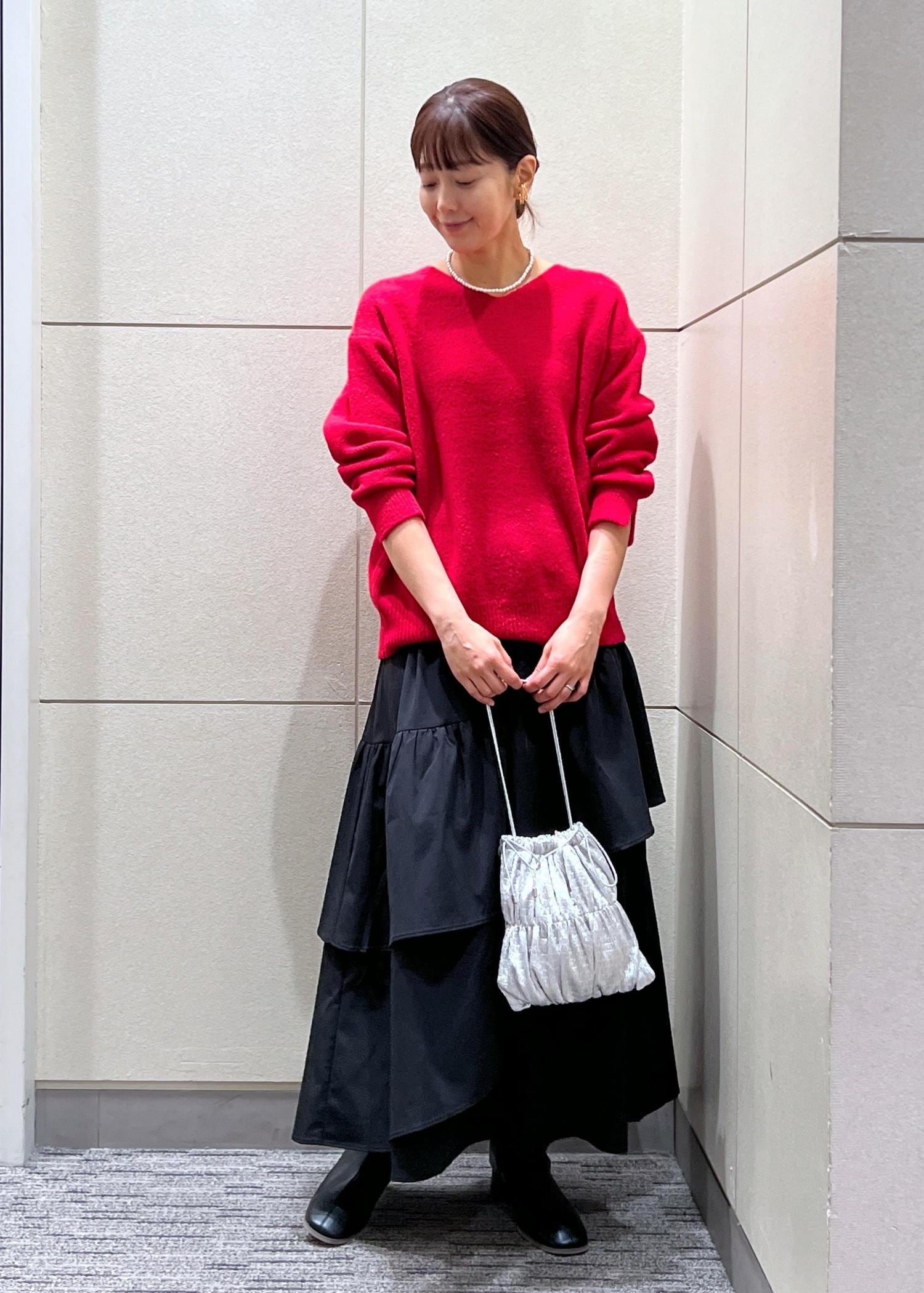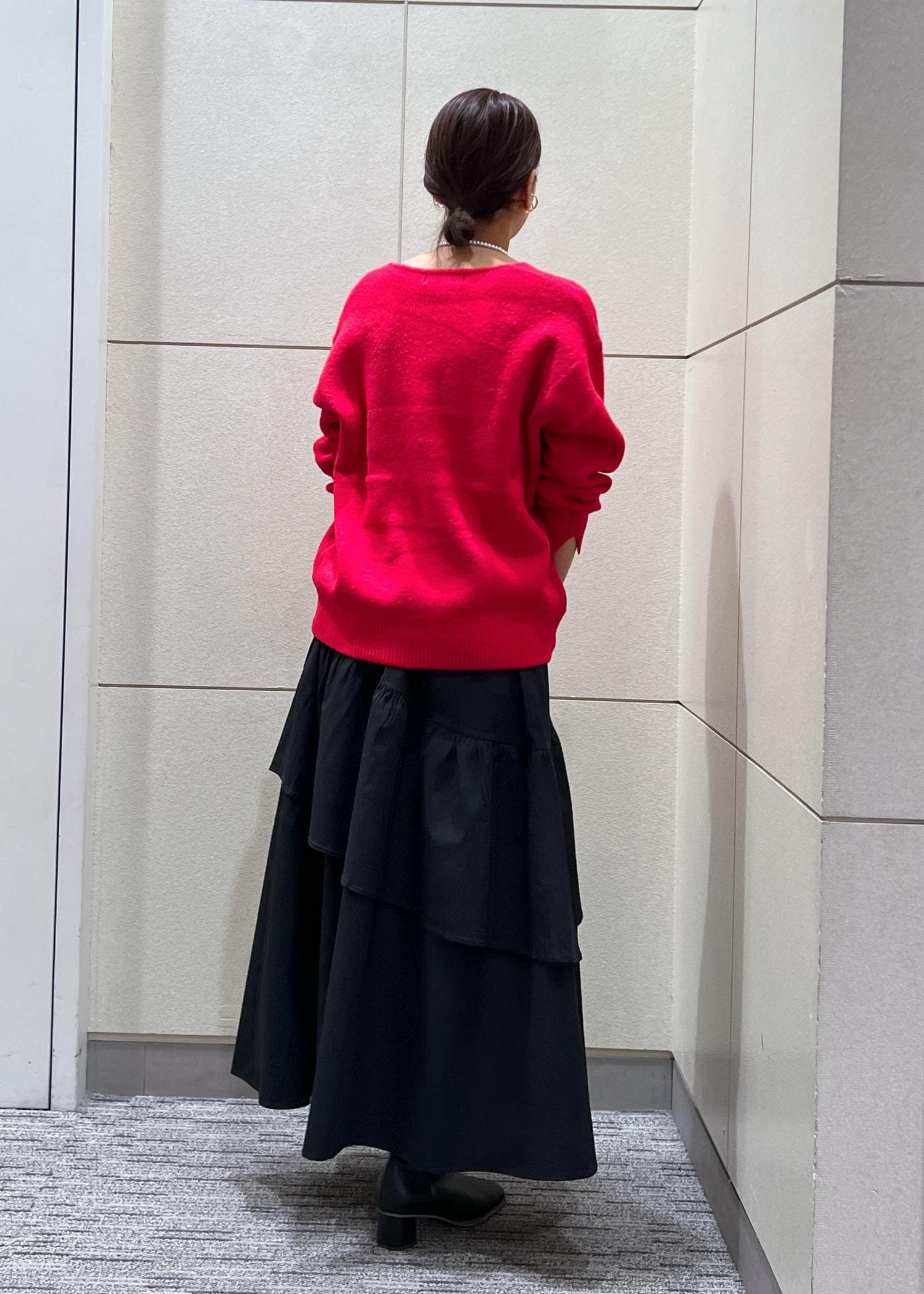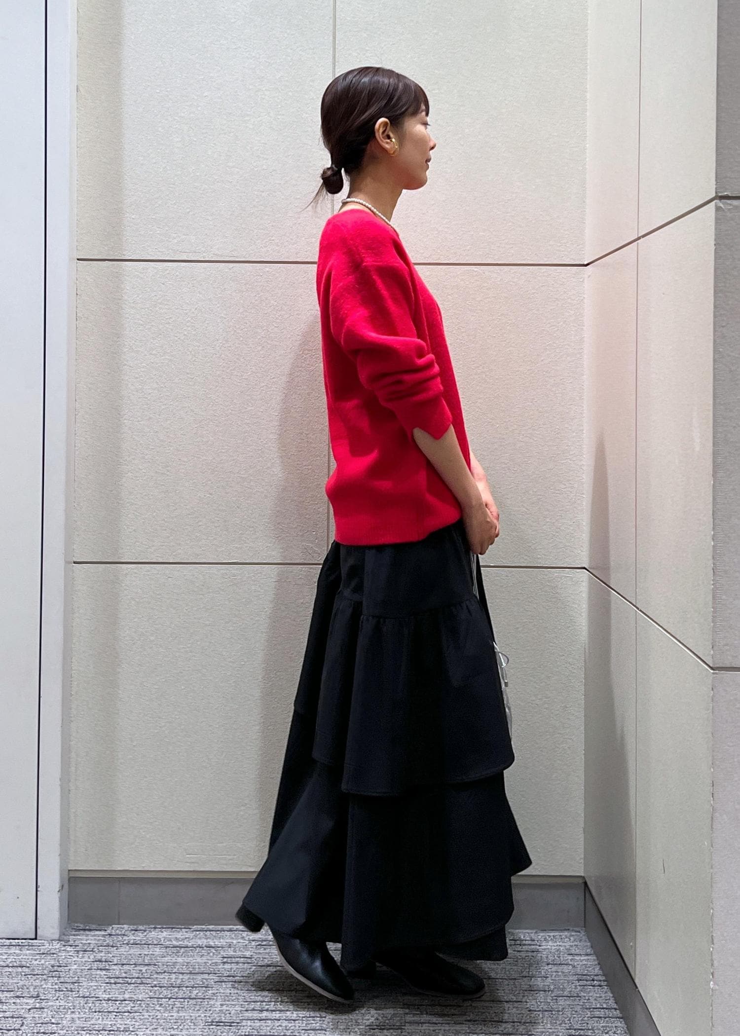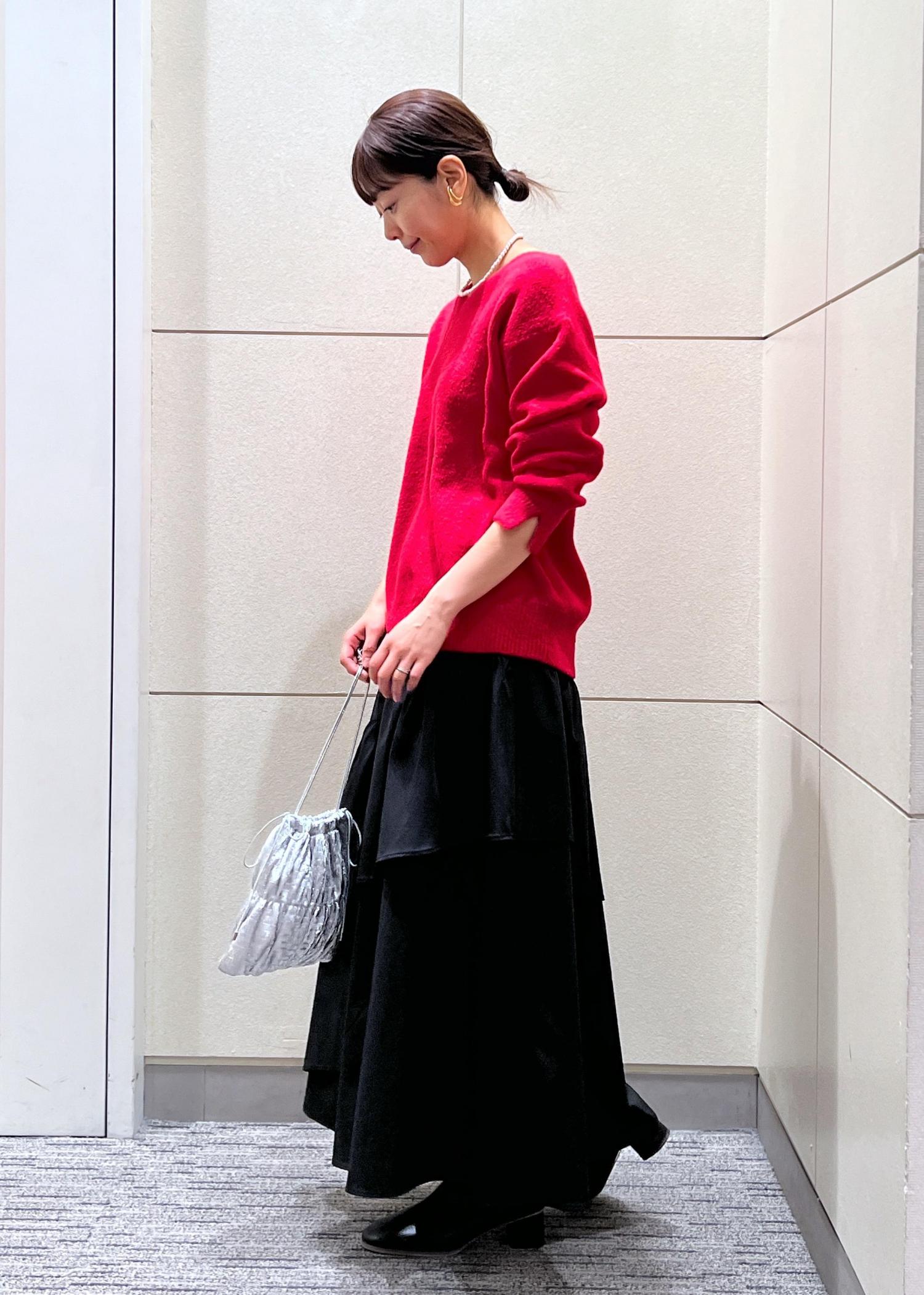 赤が目をひくニットはシンプルに合わせるのがおすすめです⭐︎ シンプルなニットなのでボトムはかわいらしいティアードスカートで合わせました