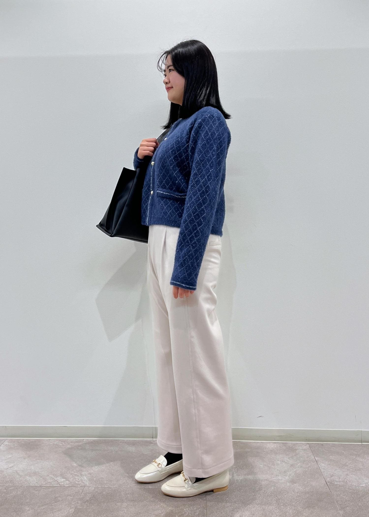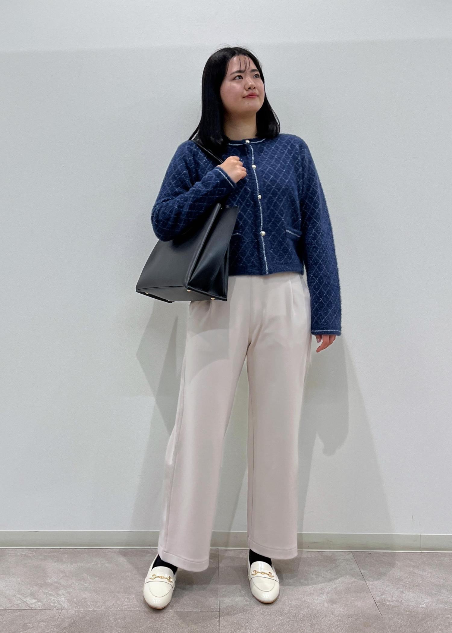 フェザーラメのカーディガンとパンツのきれいめコーデです。