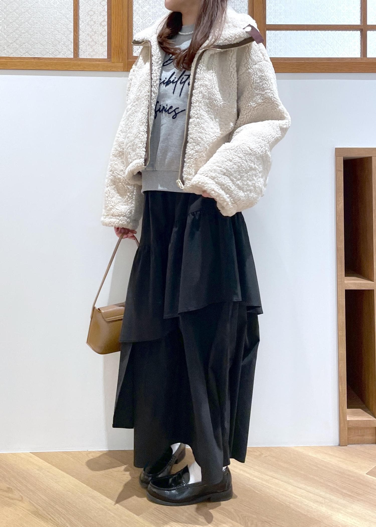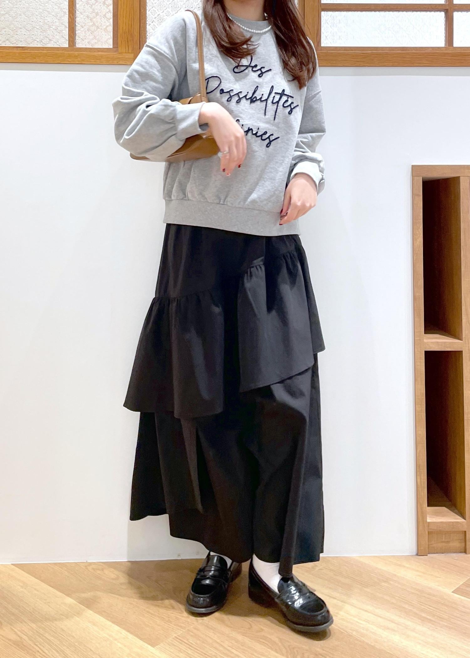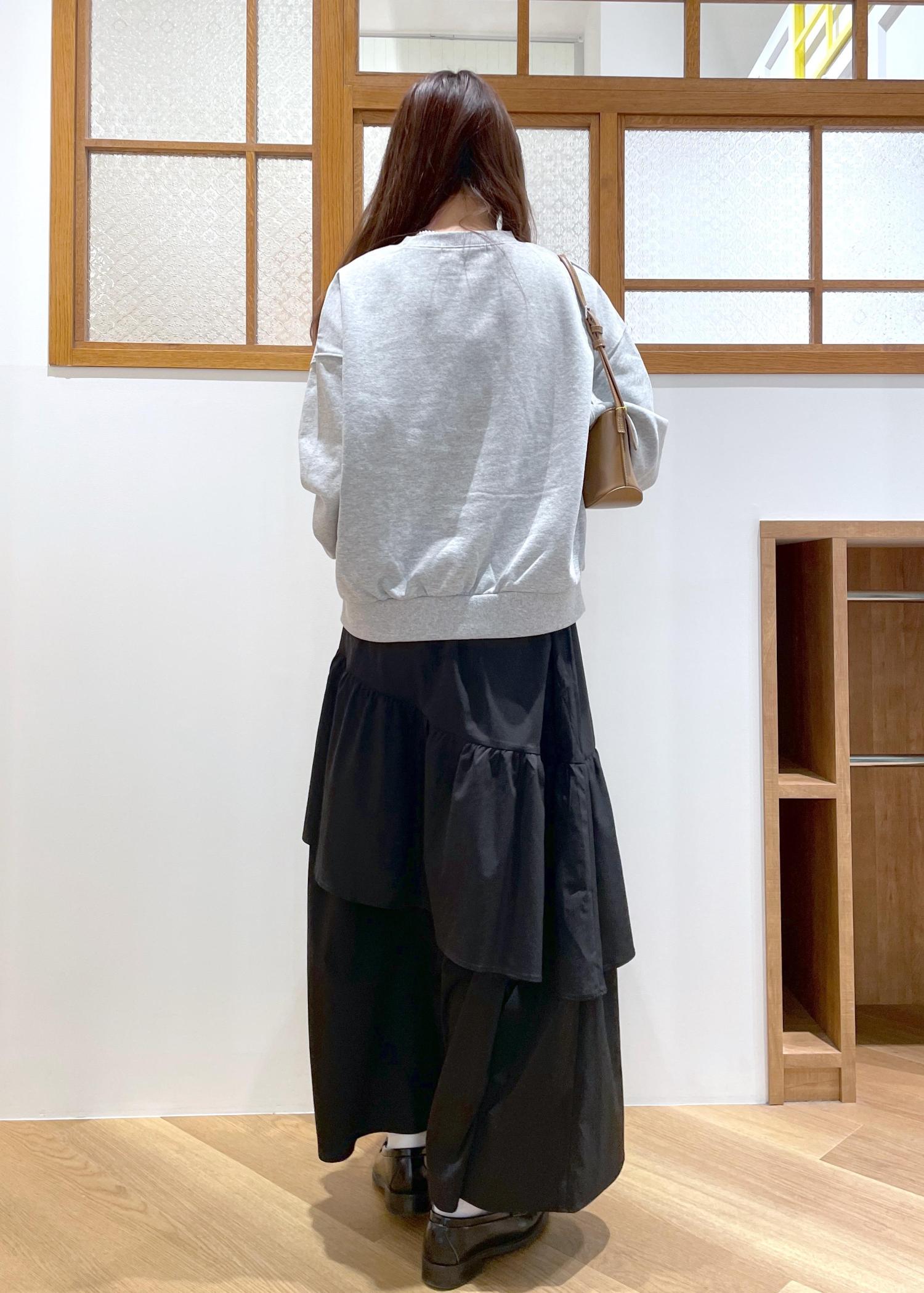 スウェットがカジュアルでなので、大きめのフリルのスカートと合わせ、甘辛ミックスな雰囲気を意識しました。