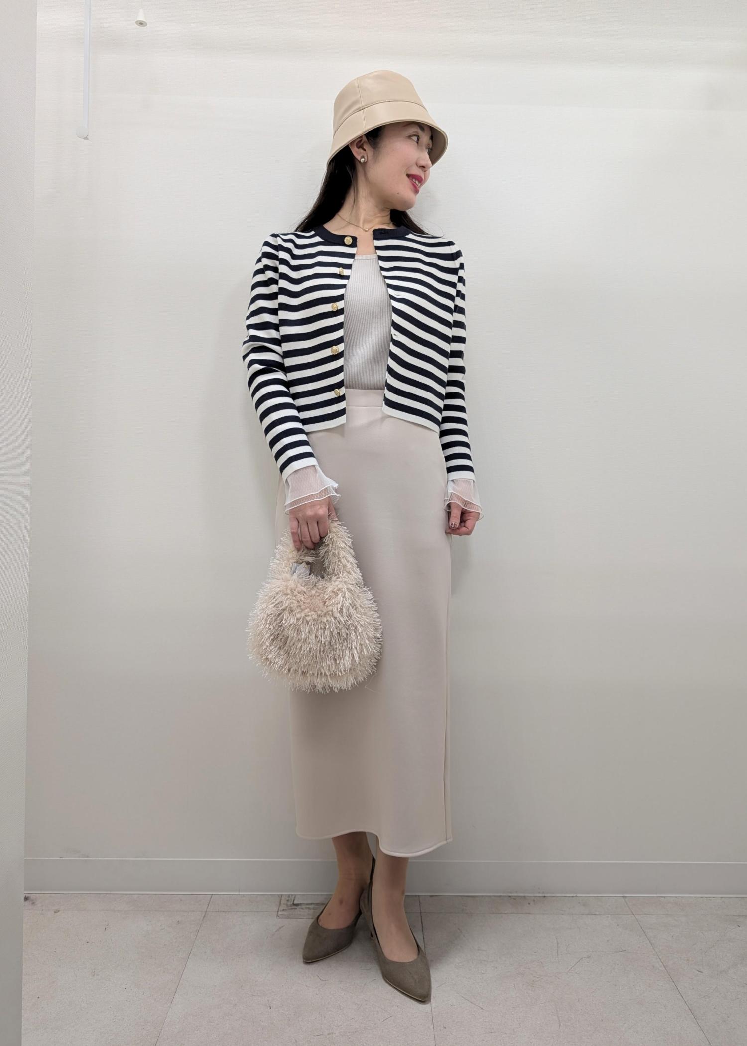 スカートがさらっとした質感なのでバッグを季節感あるフェザー素材の物を合わせました。