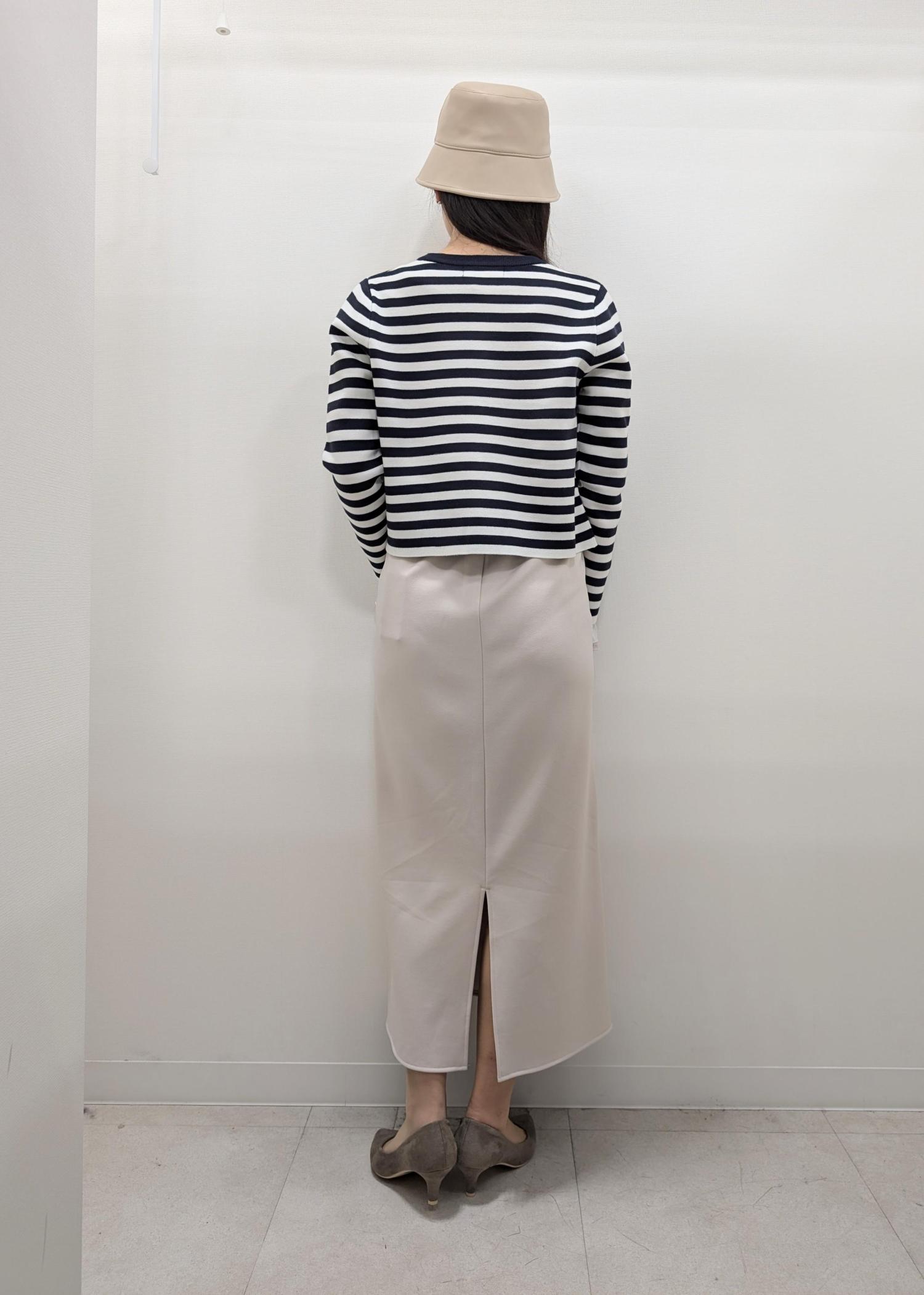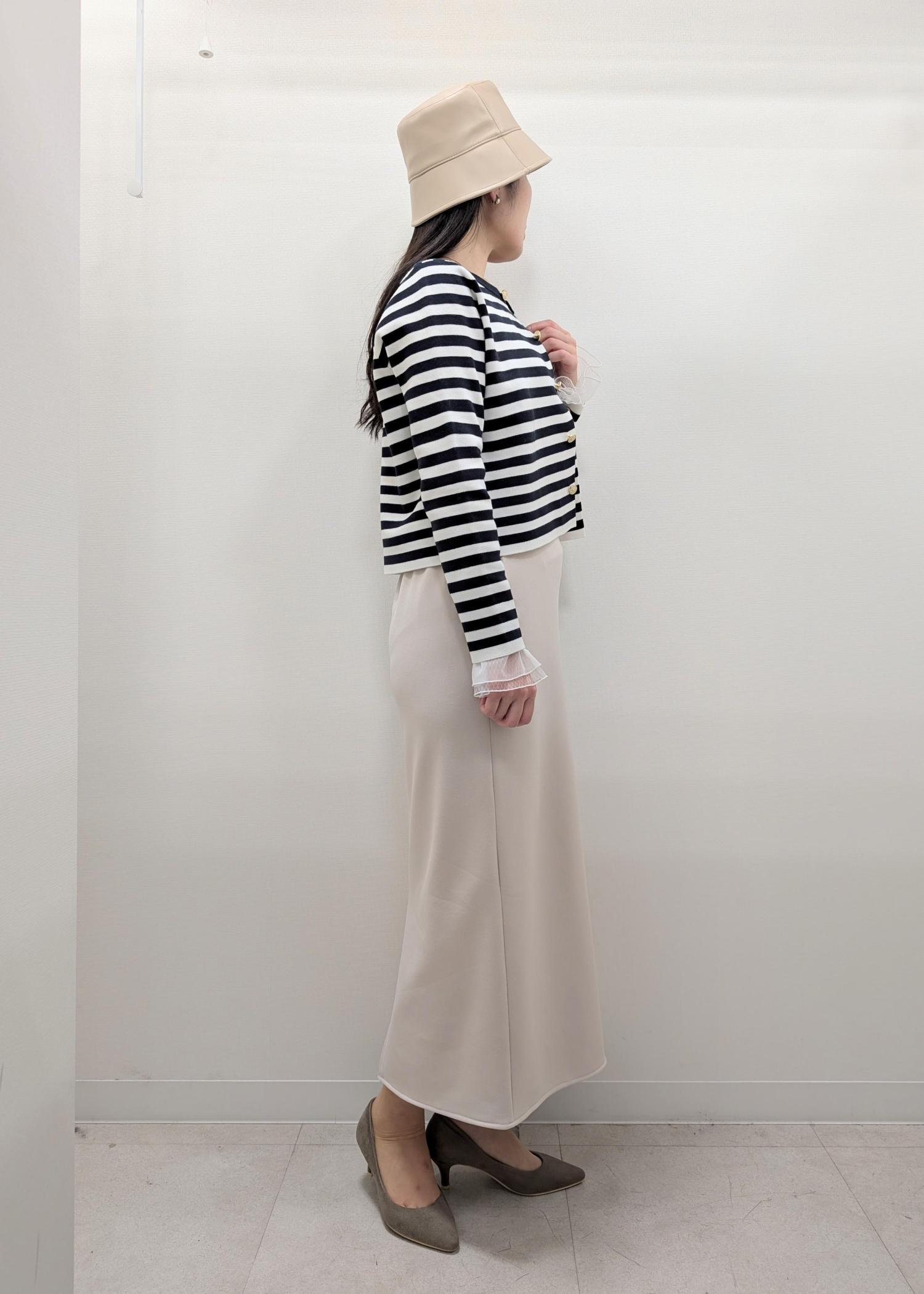 コートインのカーディガン、スカートは春先まで長く着られるコスパの良いアイテム同士のコーディネートです。
