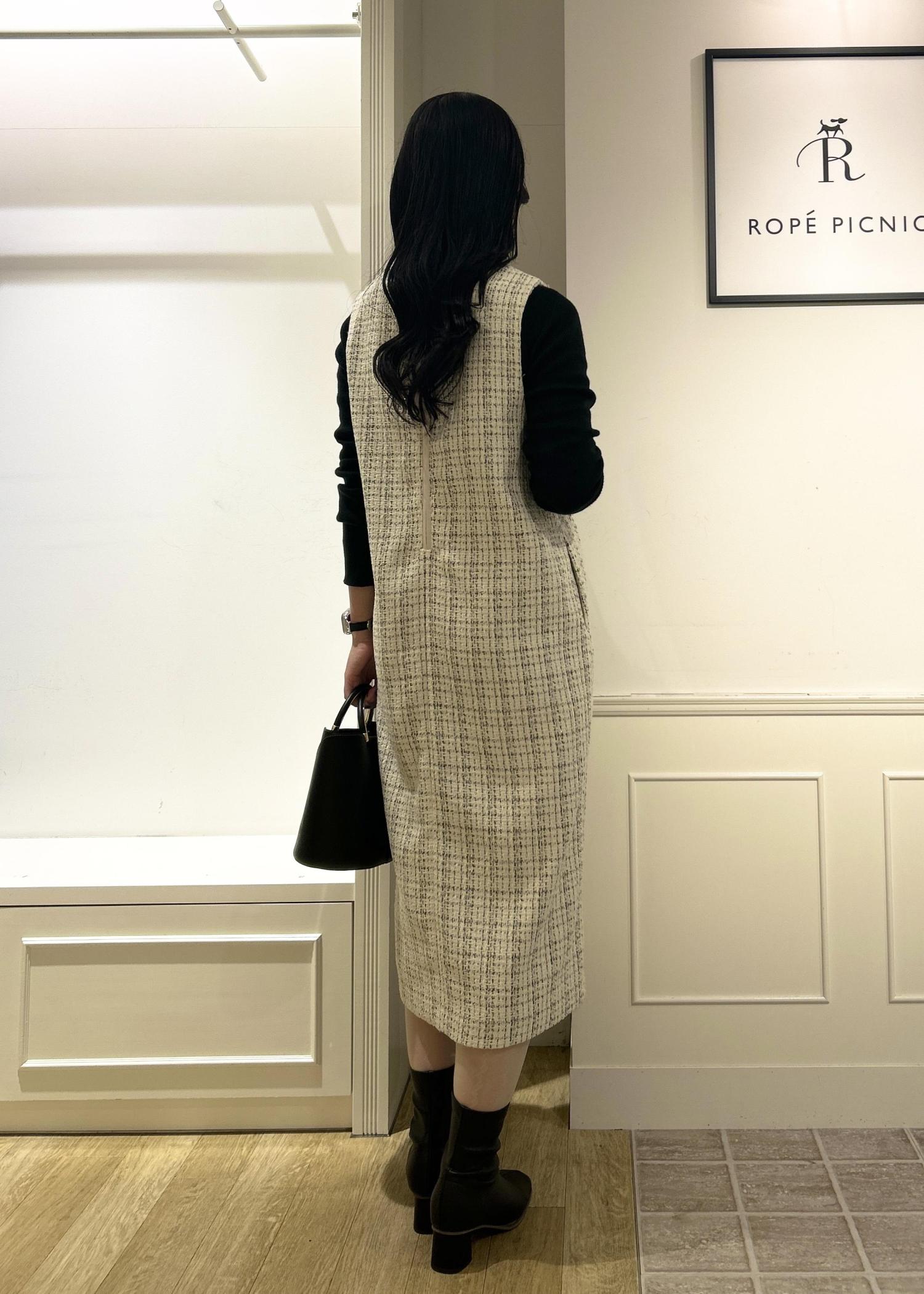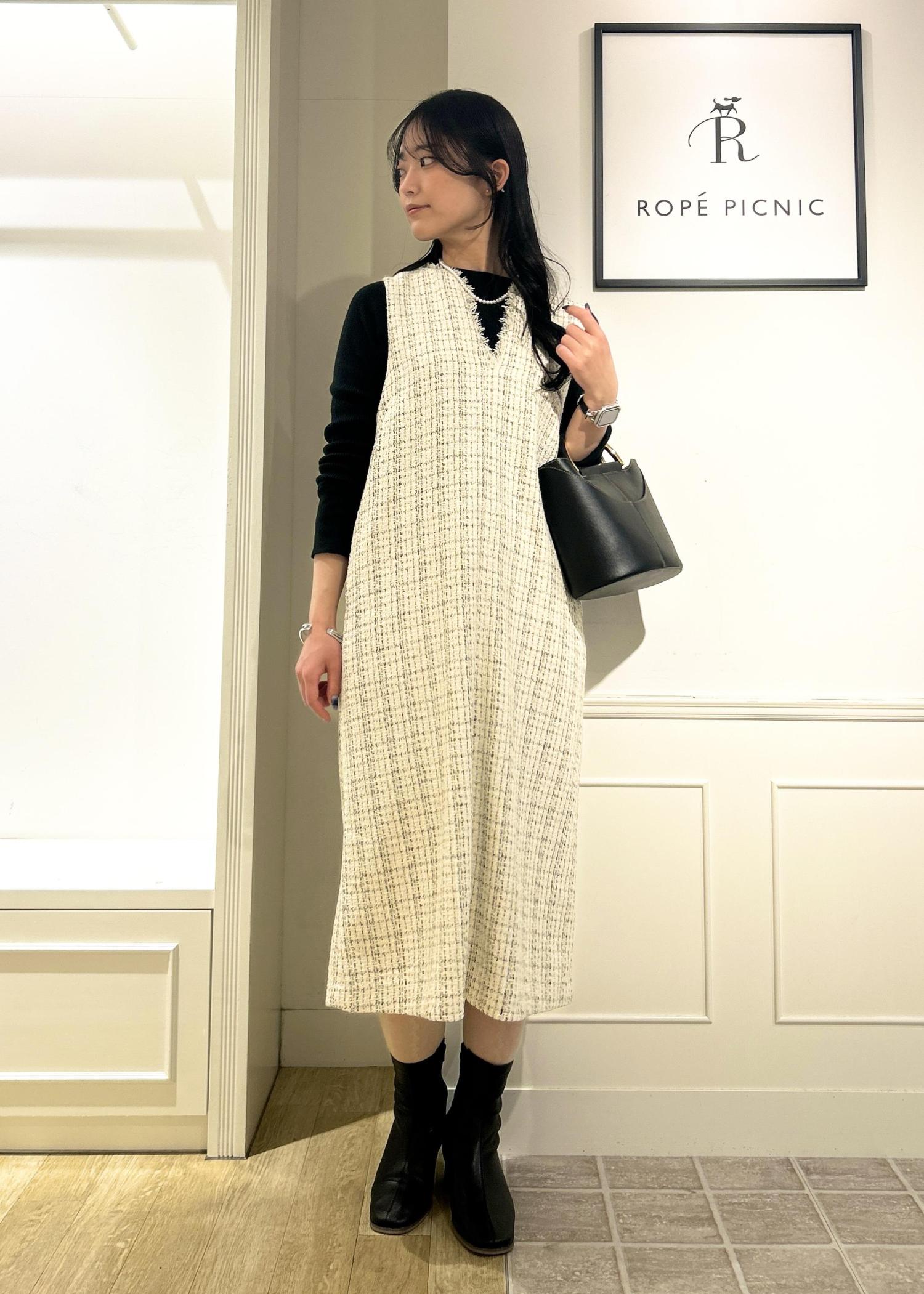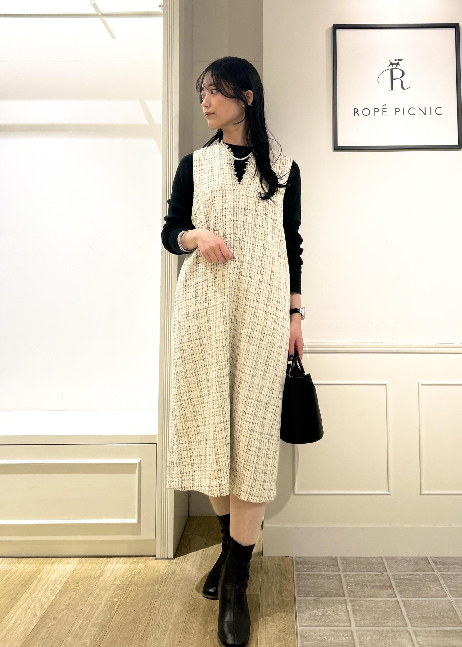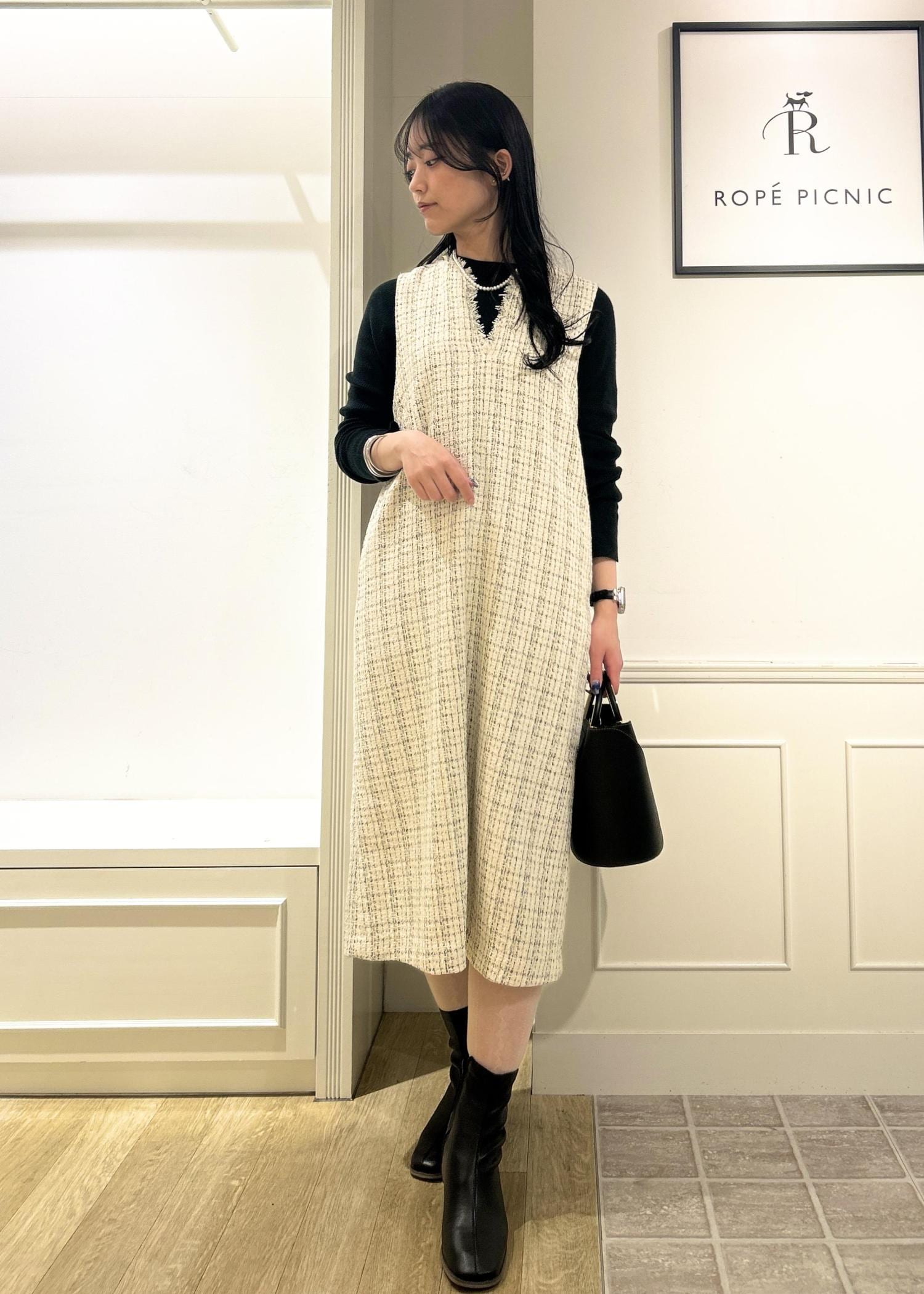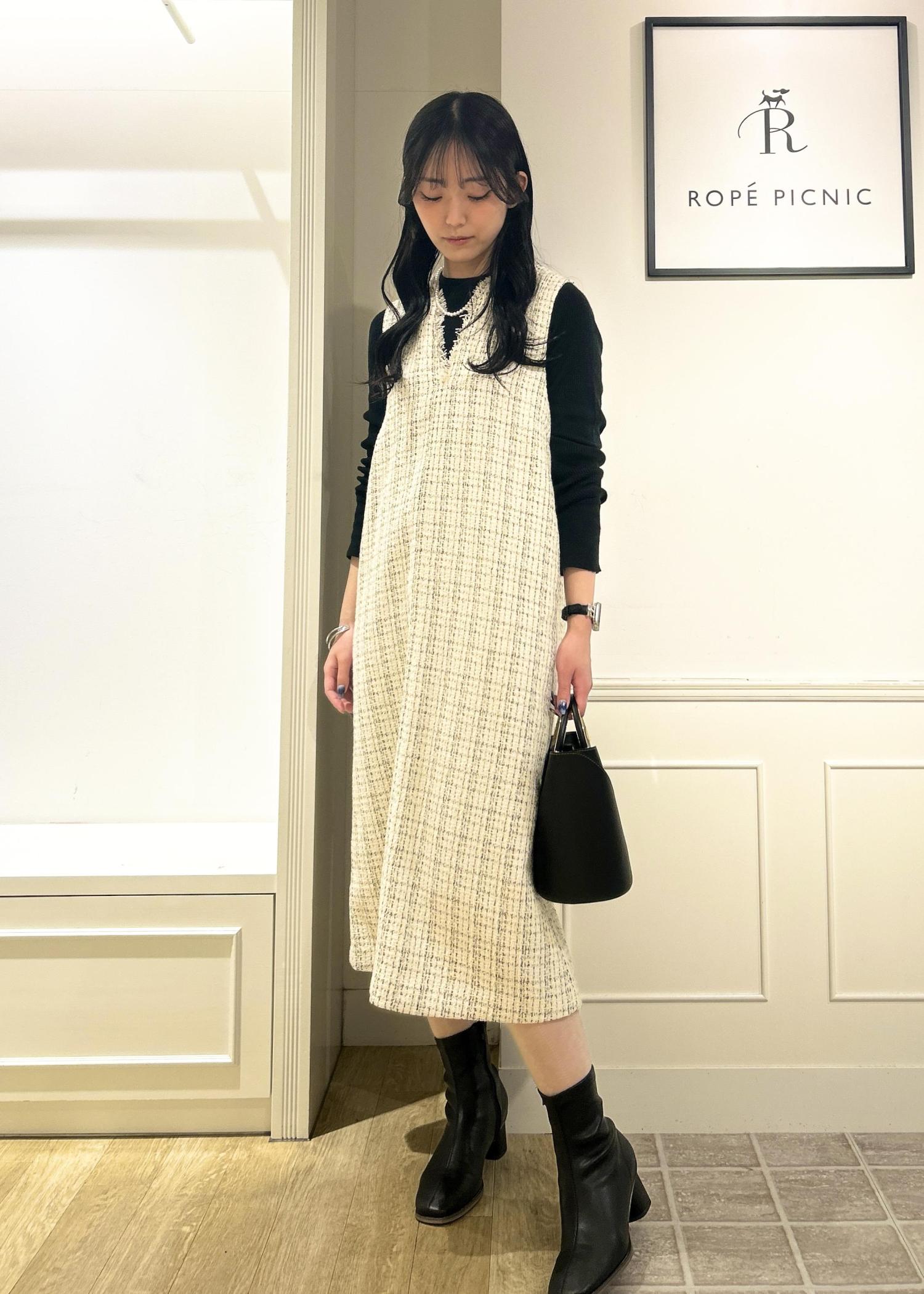 ツイード調のジャンパースカートが主役のきれいめスタイル。