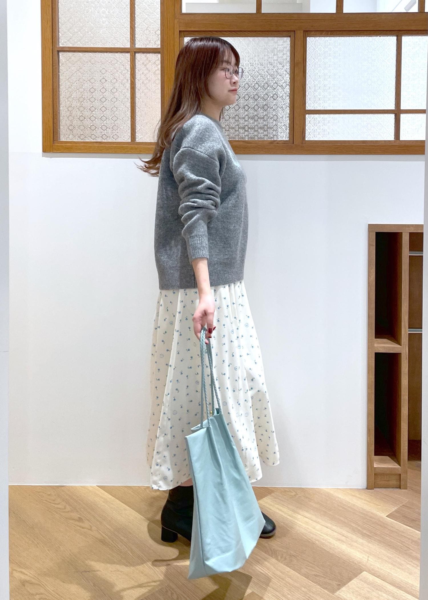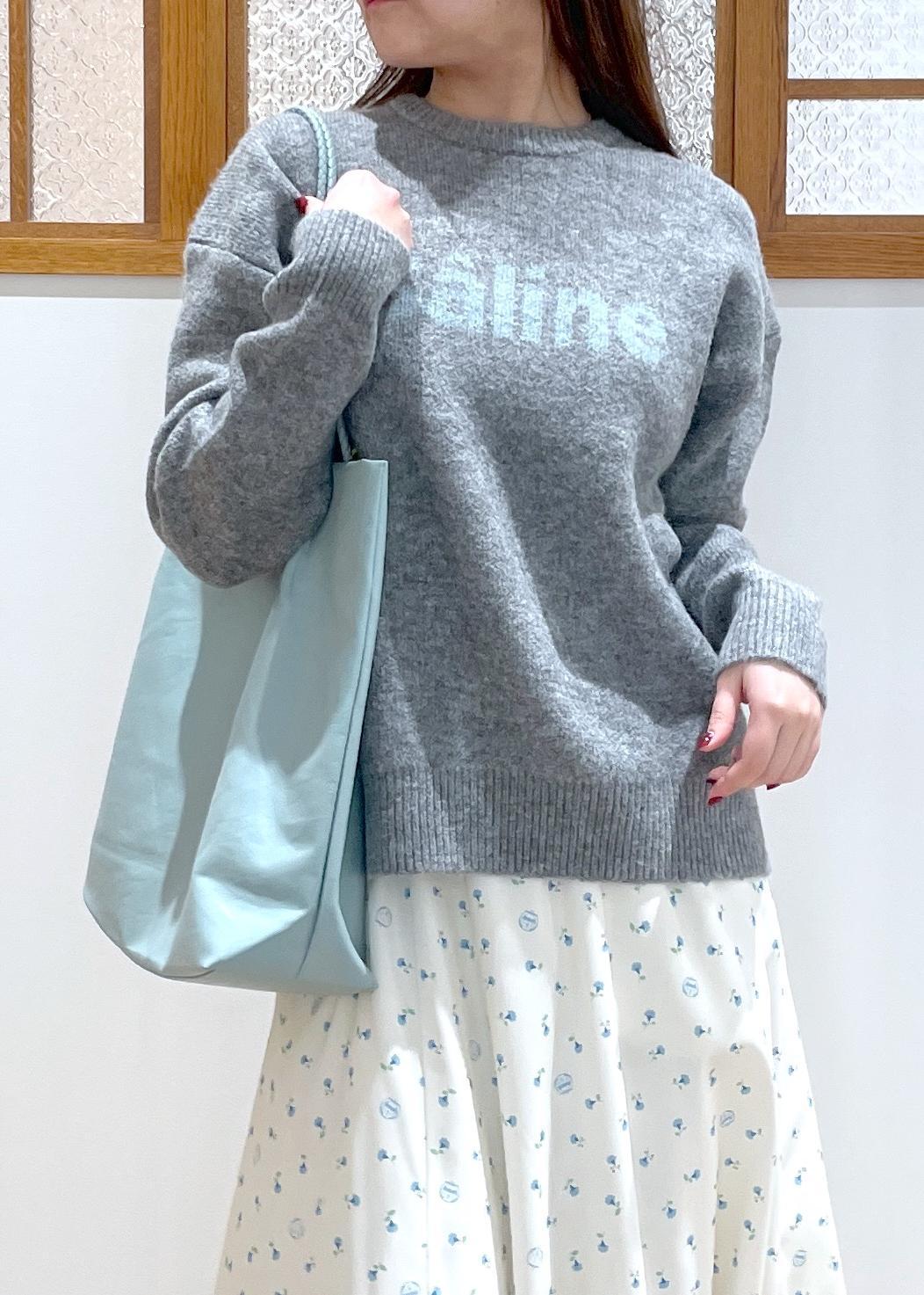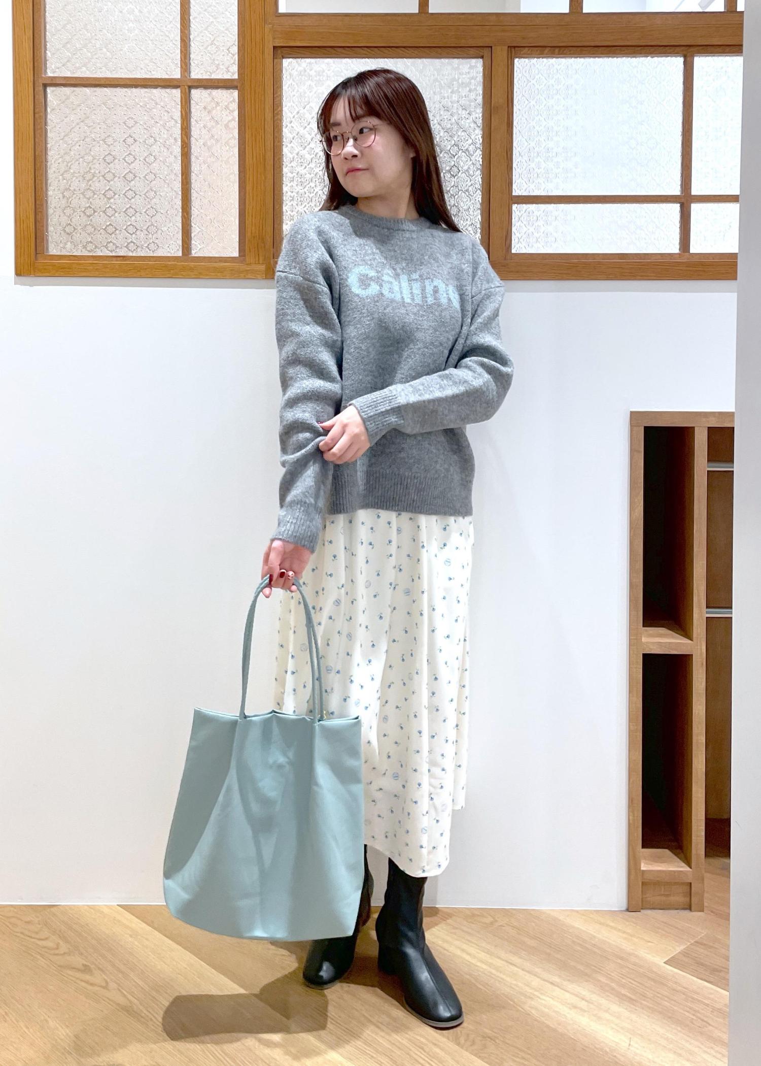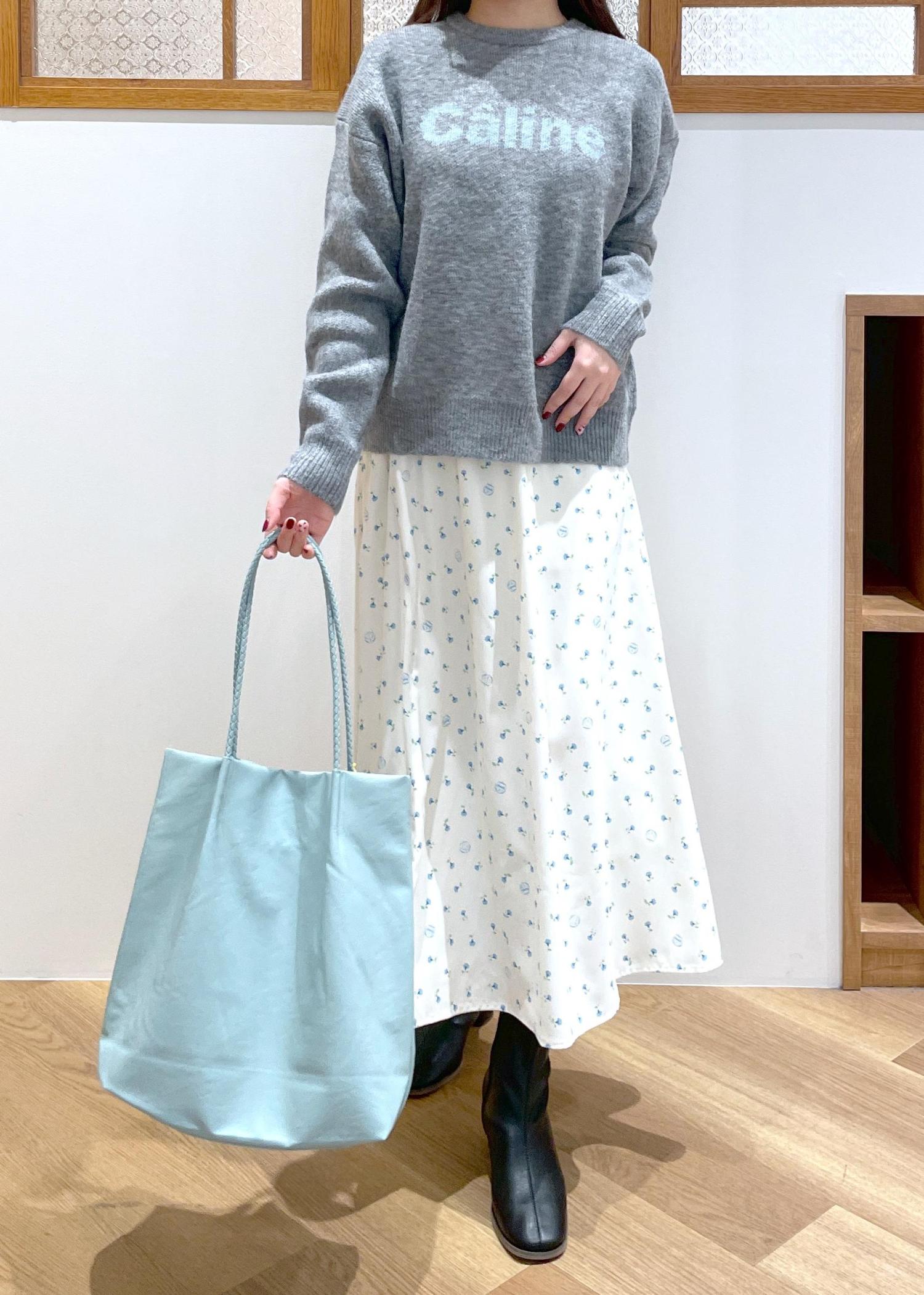 ニットのロゴの色味と似ている色味のバッグを持ち、統一感を出しました。ニットの素材は暖かく、肌寒い季節からお召しいただけます。
