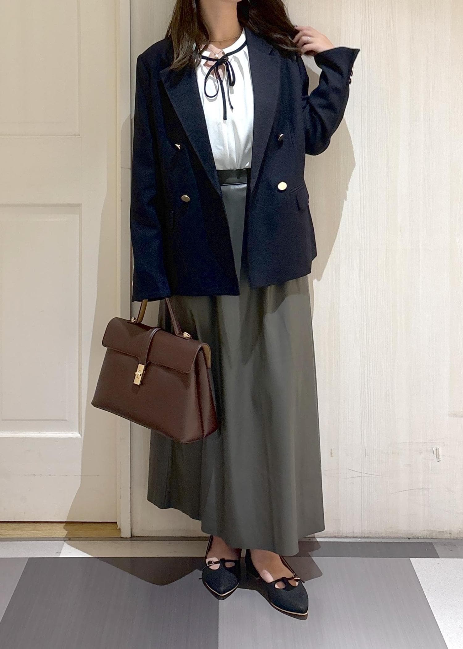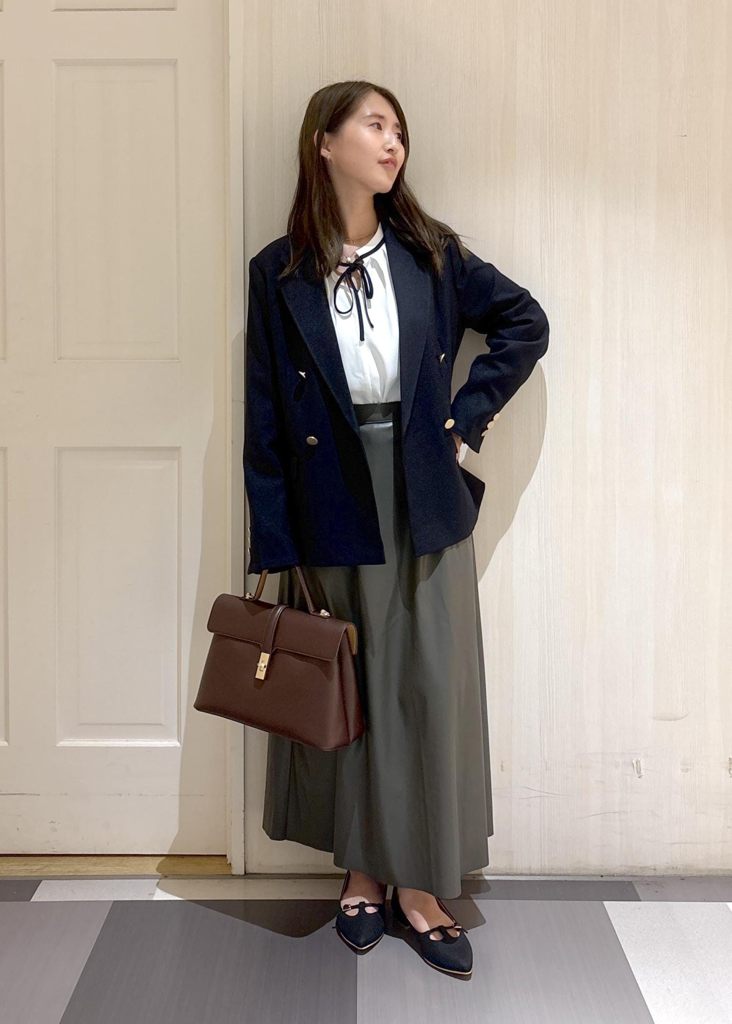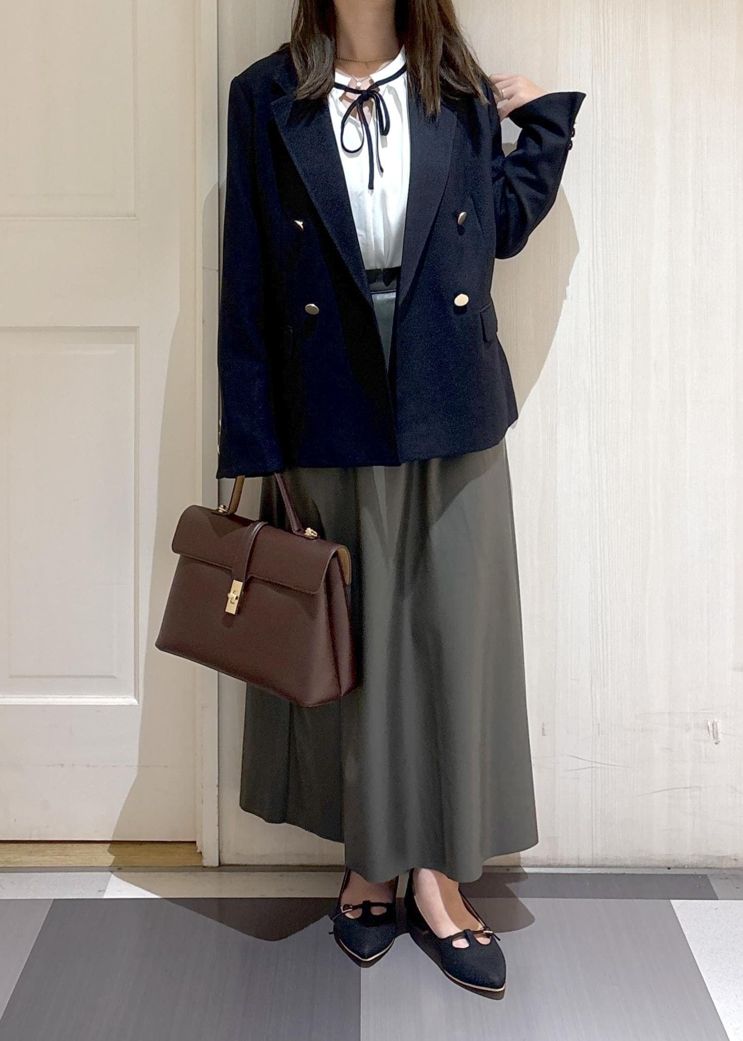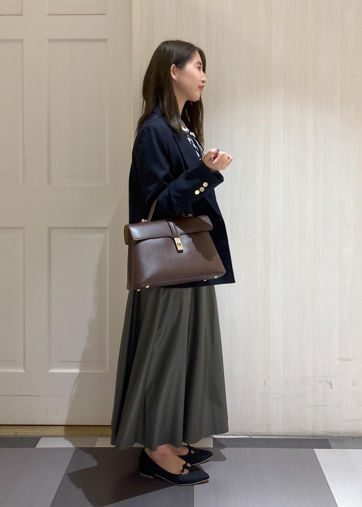 バッグは、シックになりすぎないようにダークブラウンのバッグを合わせて、落ち着きと温かみがあるエレガントな雰囲気に仕上げました**
