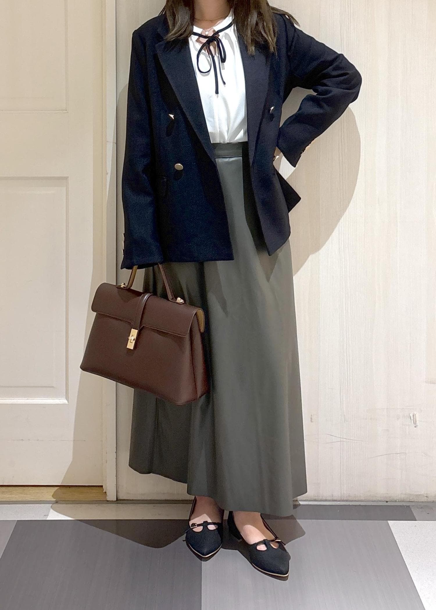 ネイビー金釦ジャケット×カーキフェイクレザースカート オフィスカジュアルコーデ