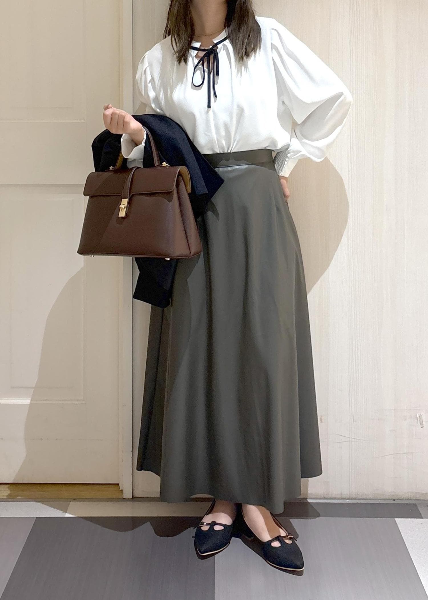お洒落に決めるなら、プリーツやマーメイドなどロングスカート×バレーシューズを合わせて、クラシカルな上品スタイルに*