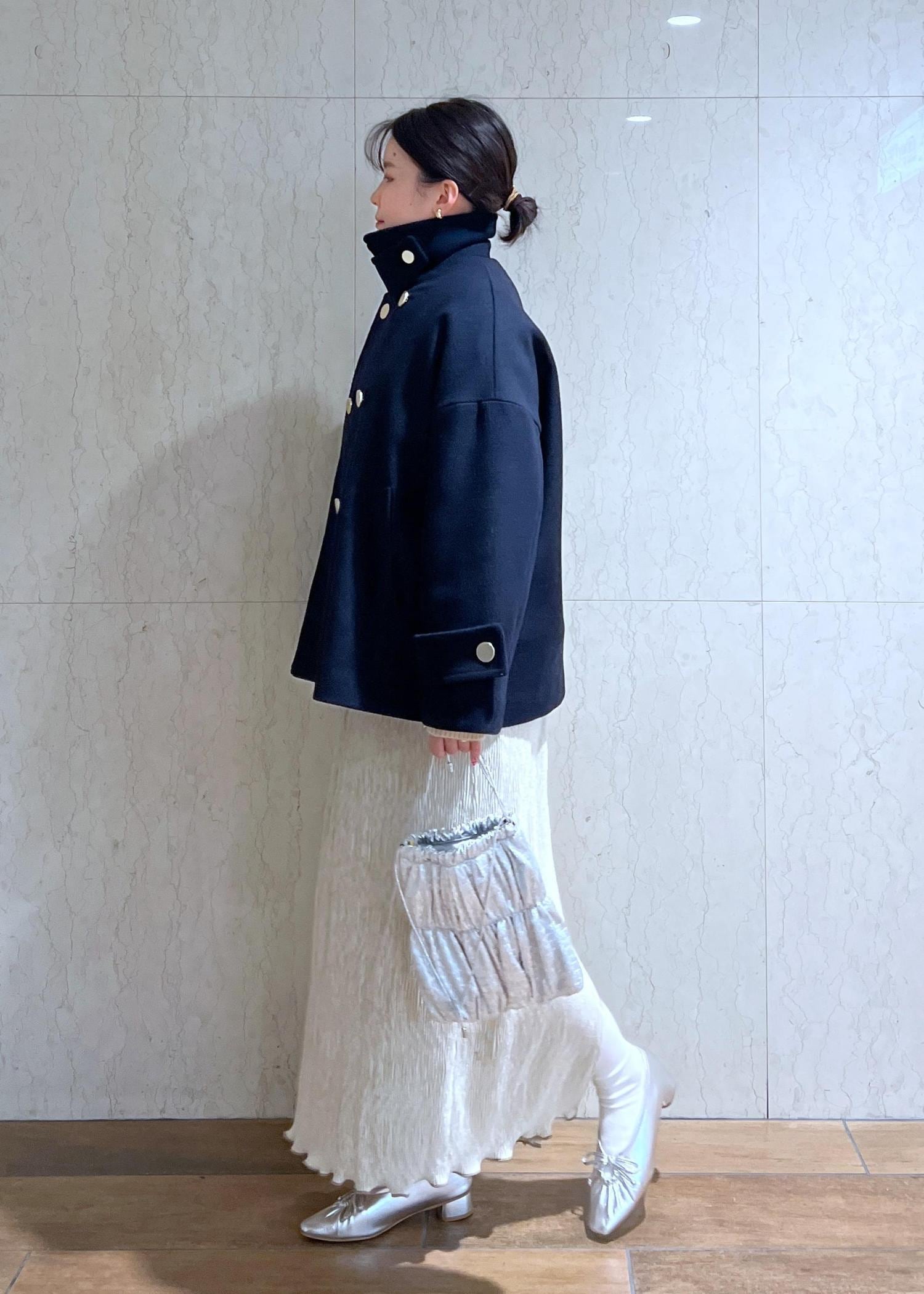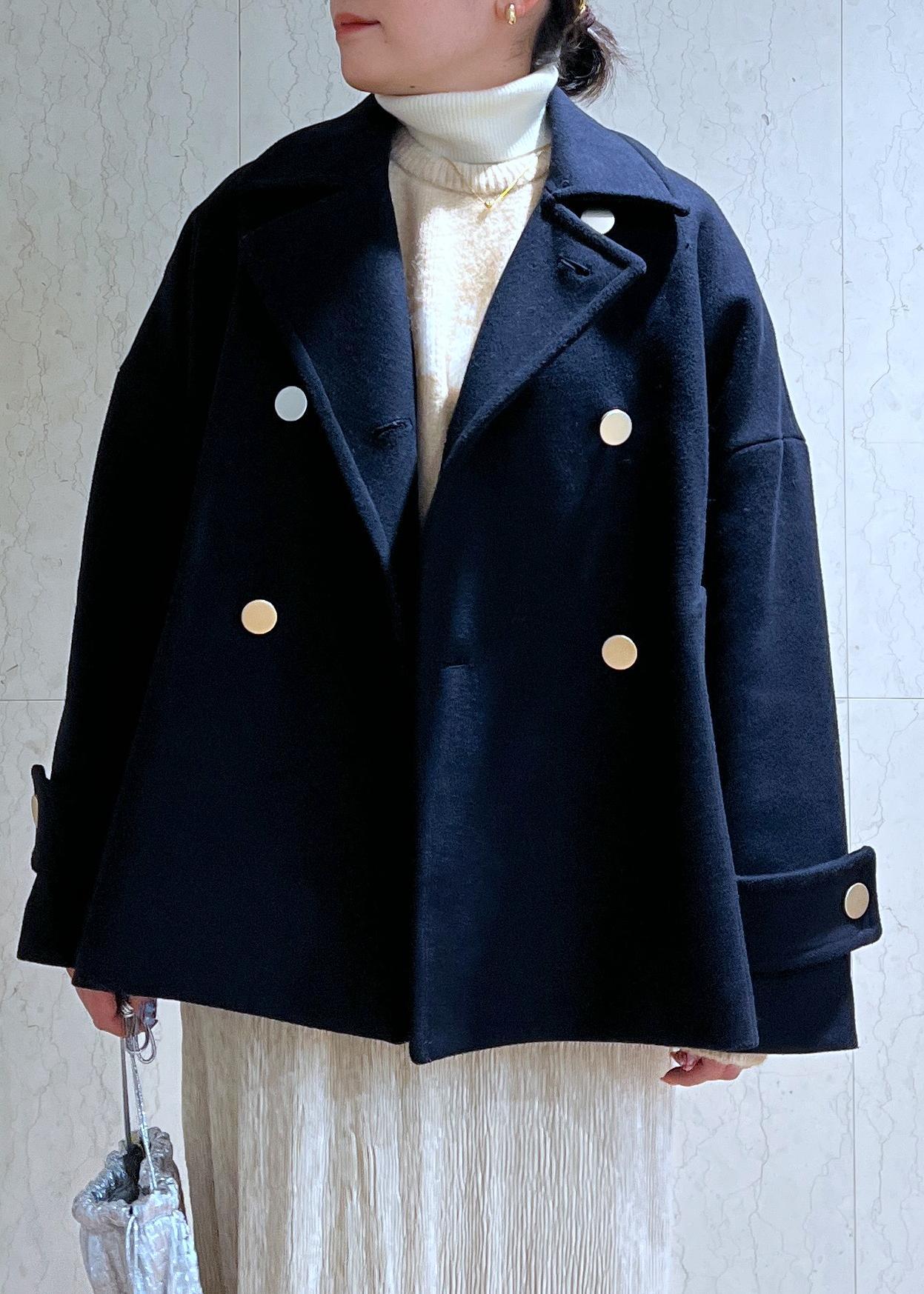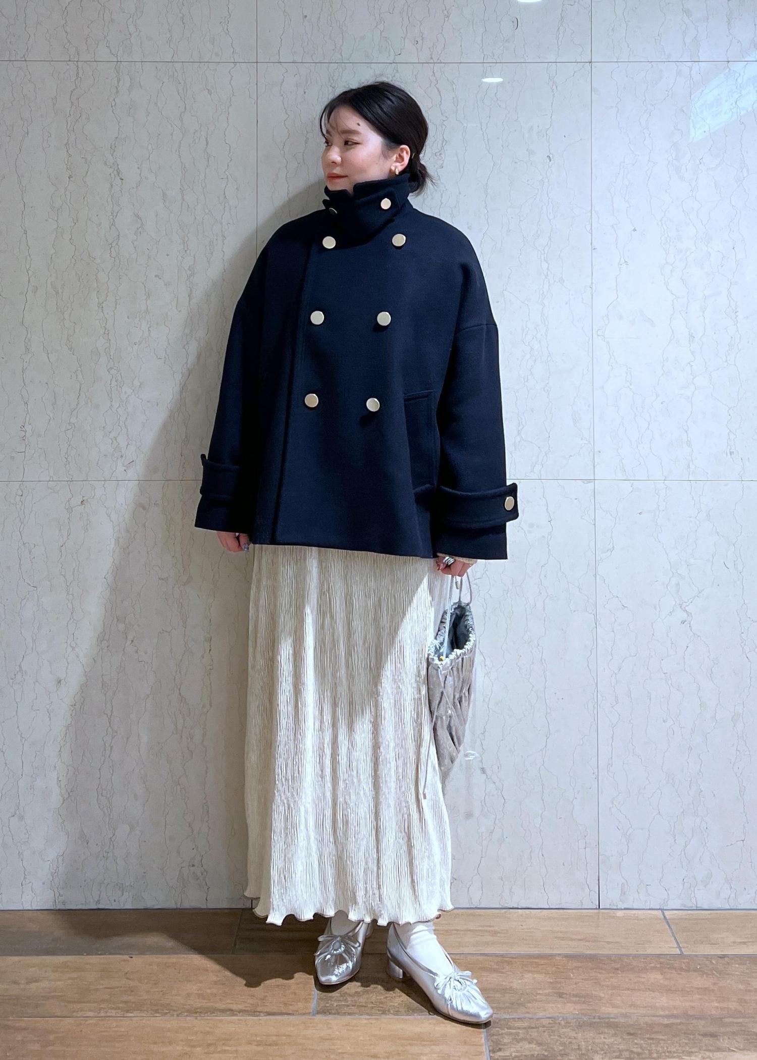 金釦がコーデのポイントになるPコートとベロアスカートでトレンド感もある大人カジュアルコーデにしてみました!