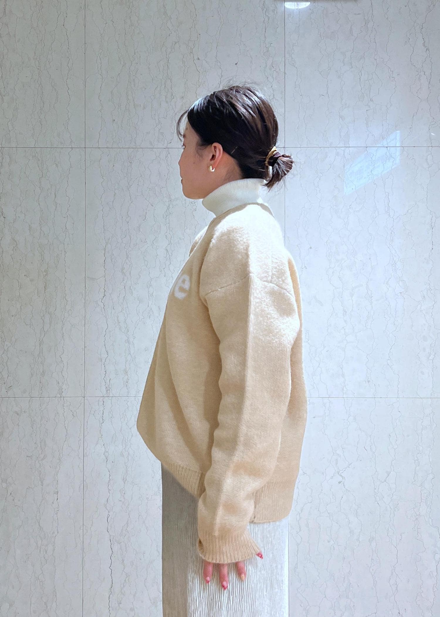 素材感:毛玉になりにくいアンチピリング素材で、洗濯機でも洗えます。チクチク感もなく肌触り柔らかいニット素材です。薄手の生地なのでオフホワイトは少し透け感あります。