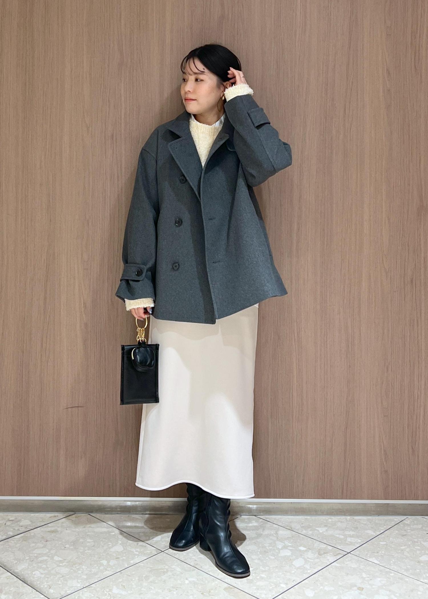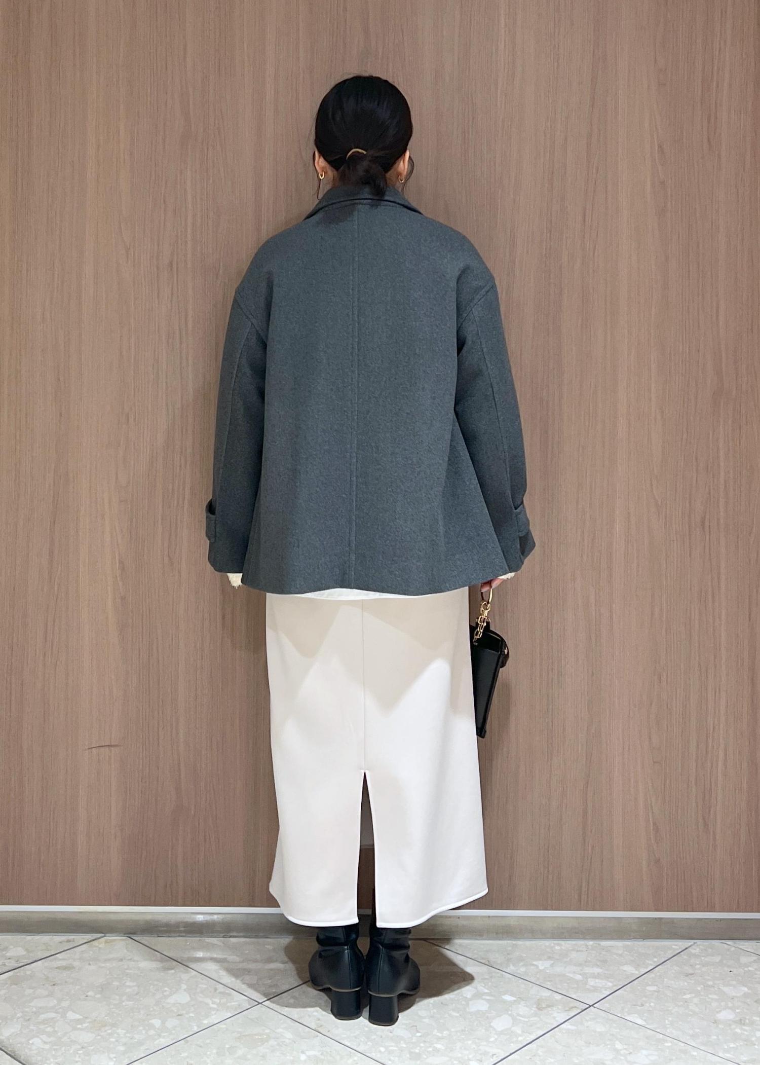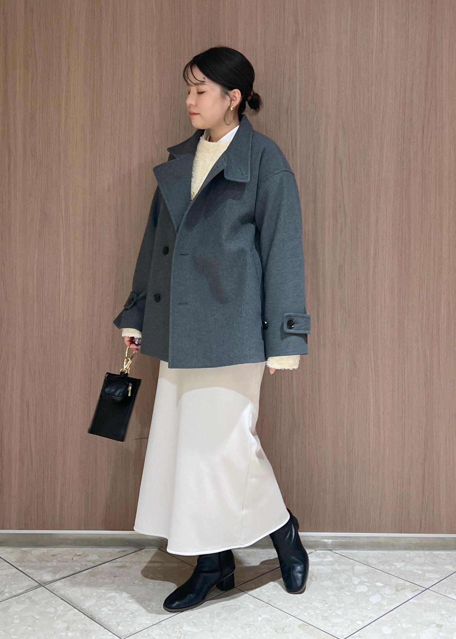 チャコールグレーがトレンド感のあるミドル丈のアウターを主役にコートインは最近ハマっているホワイト系のワントーンコーデにしてみました!
